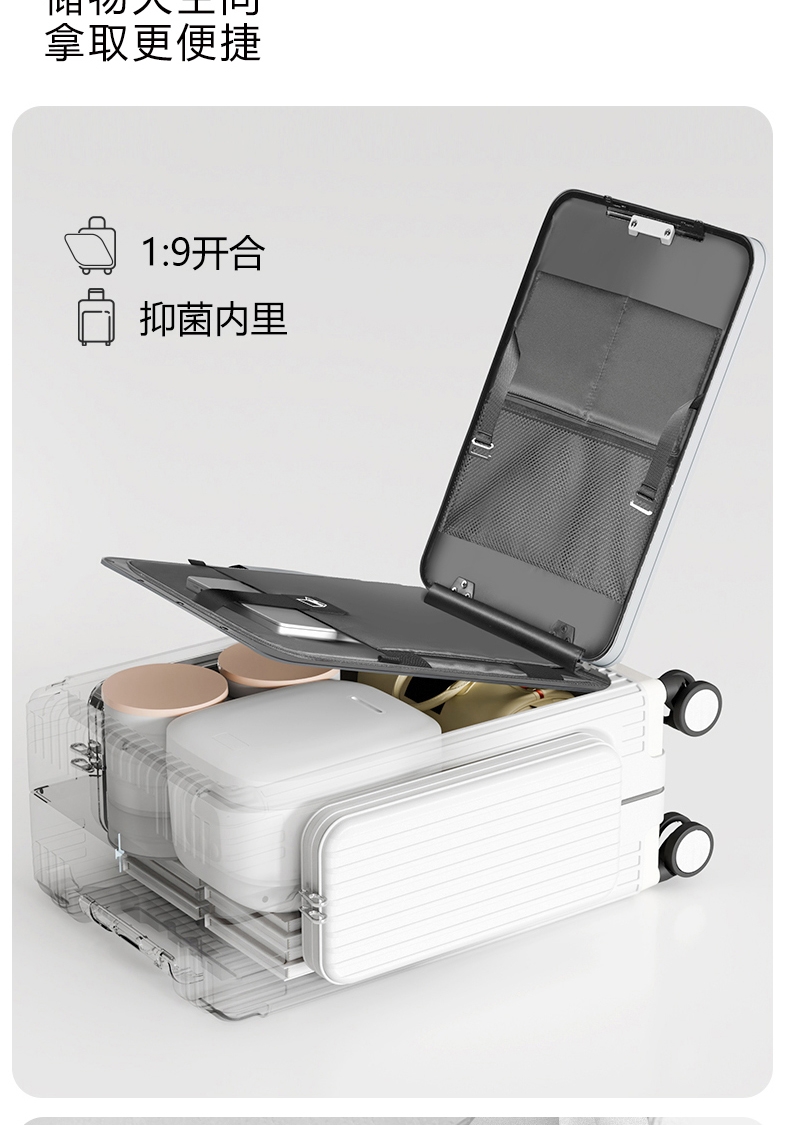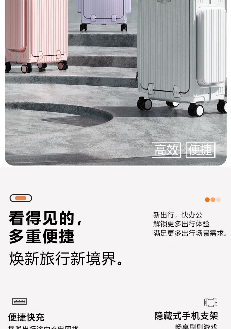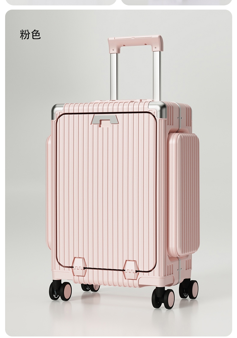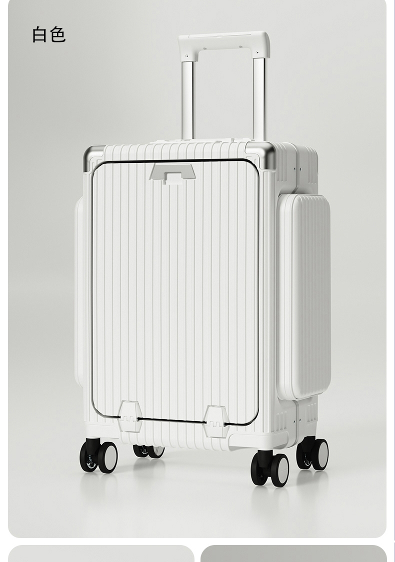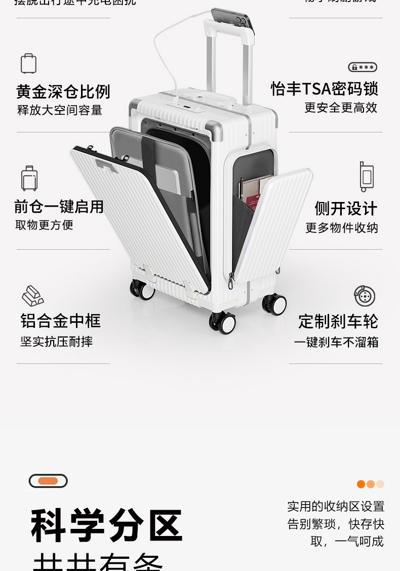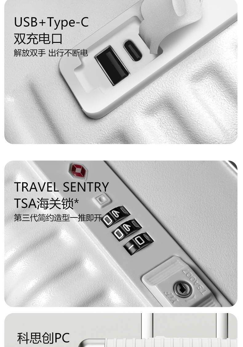 嵌入式前置独立电脑仓,滴答一下优雅出行;外置USB+Type-C充电口,时刻能量满满;手机支架,水杯支架,功能强大;航空级合金拉杆,双排高弹力TPE刹车轮;创新双侧口袋