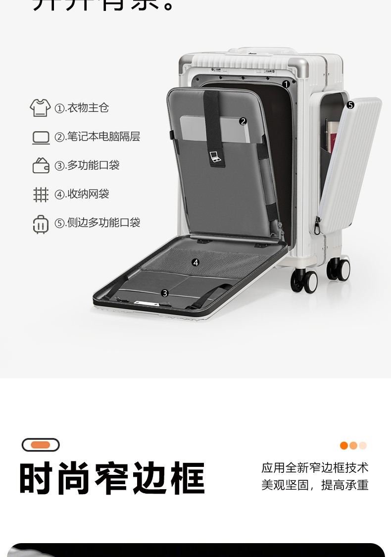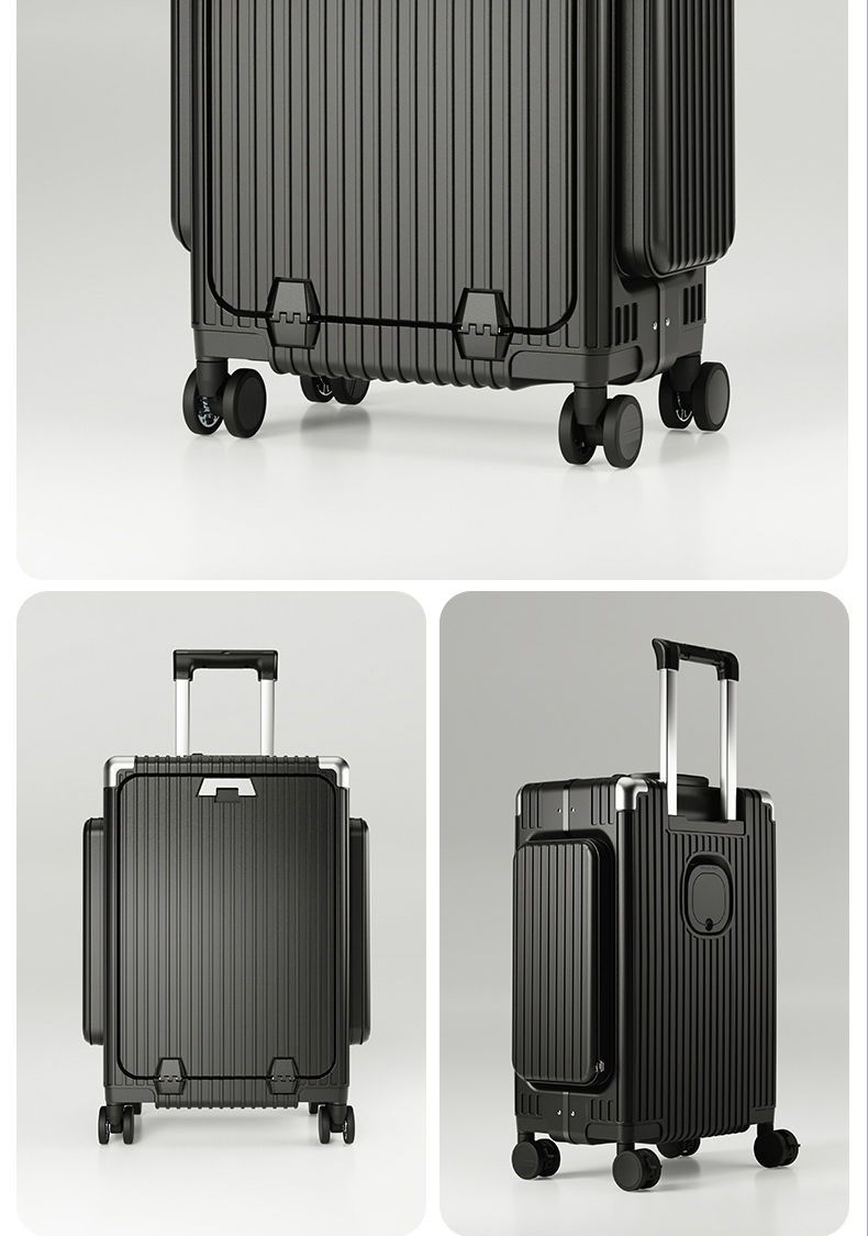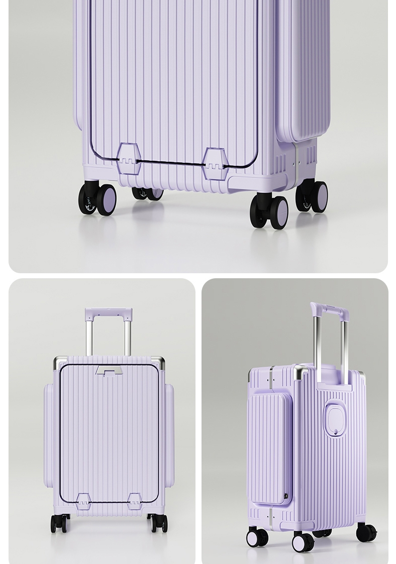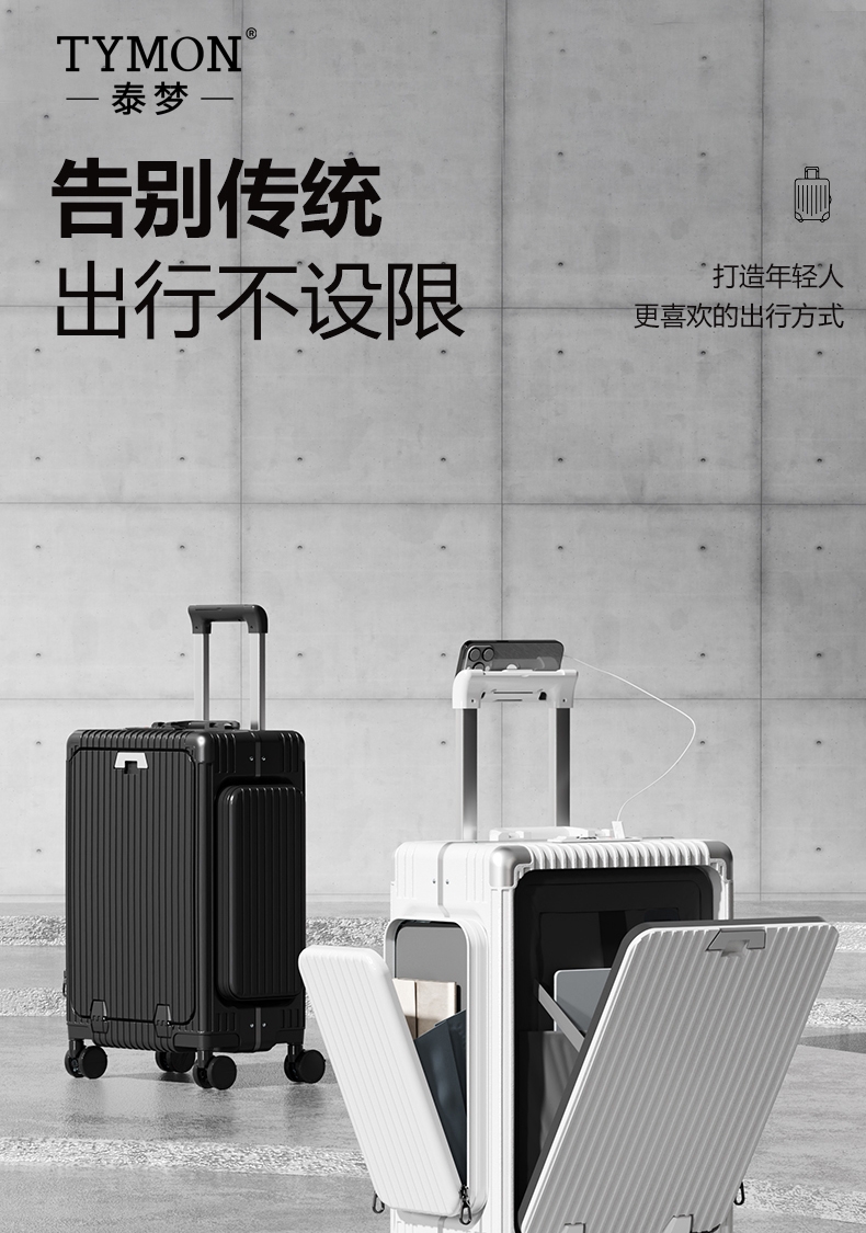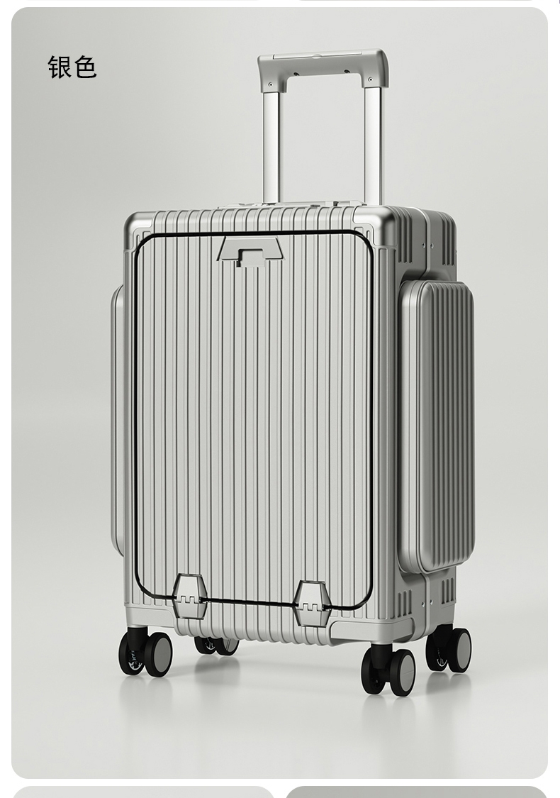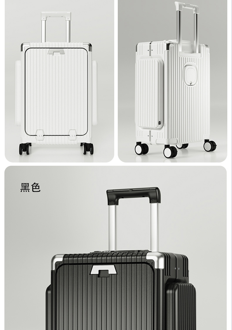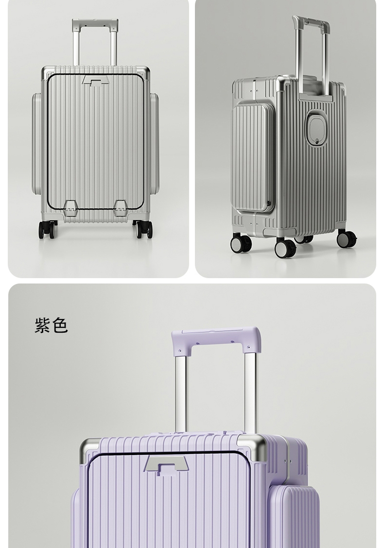 嵌入式前置独立电脑仓,滴答一下优雅出行;外置USB+Type-C充电口,时刻能量满满;手机支架,水杯支架,功能强大;航空级合金拉杆,双排高弹力TPE刹车轮;创新双侧口袋
