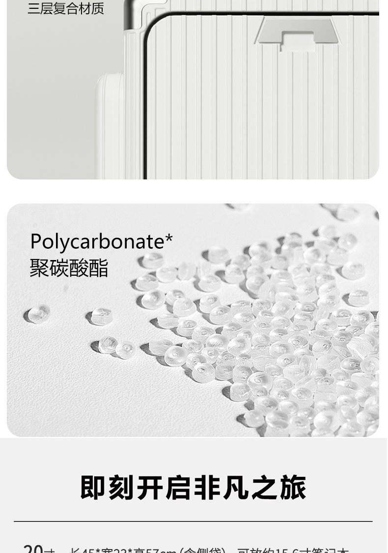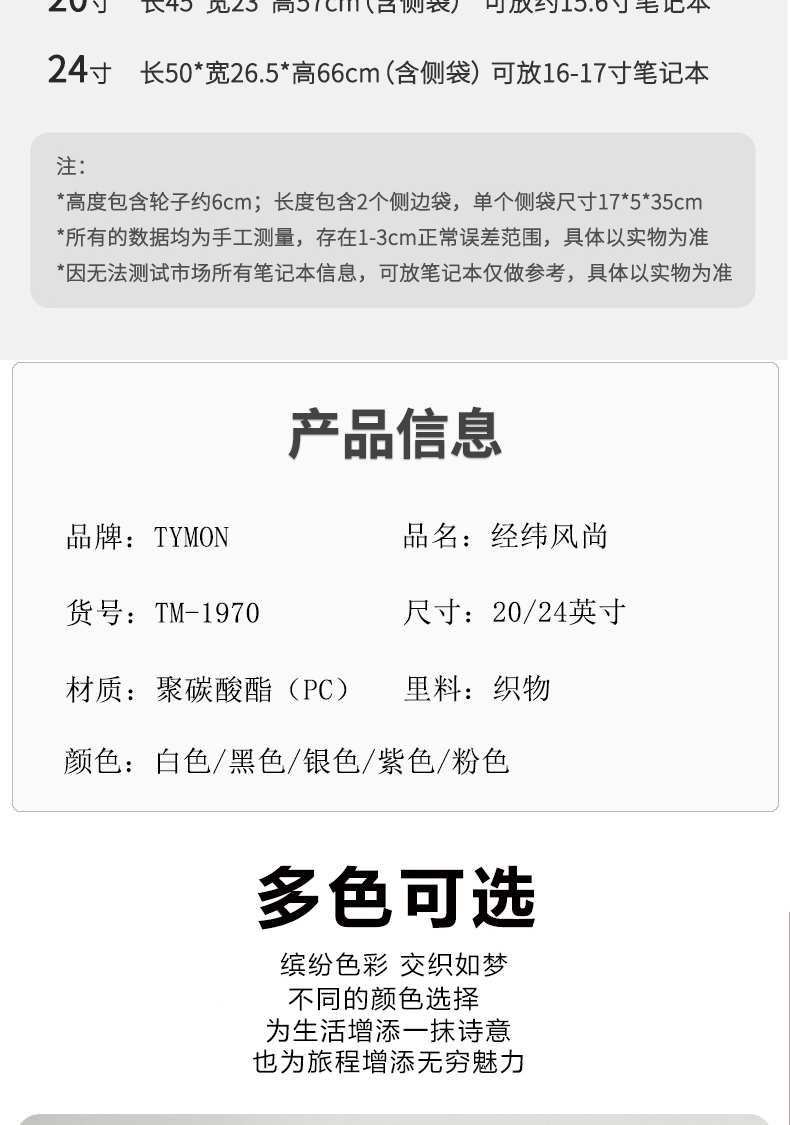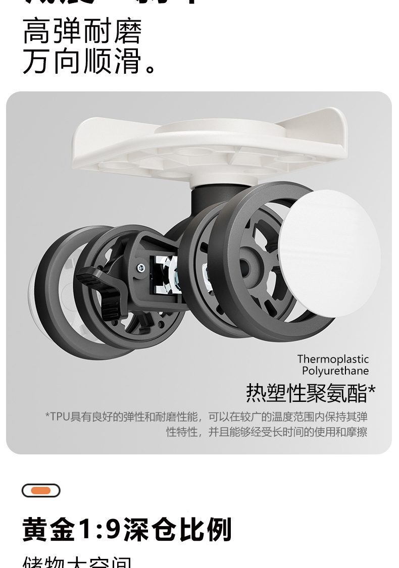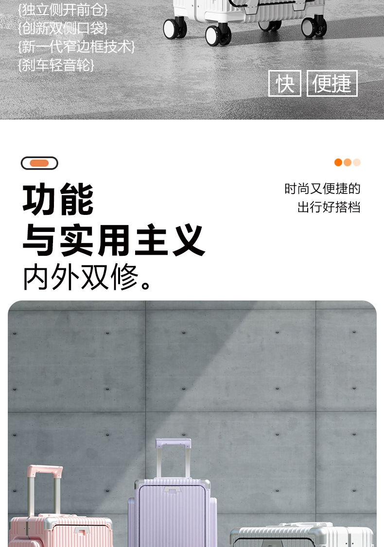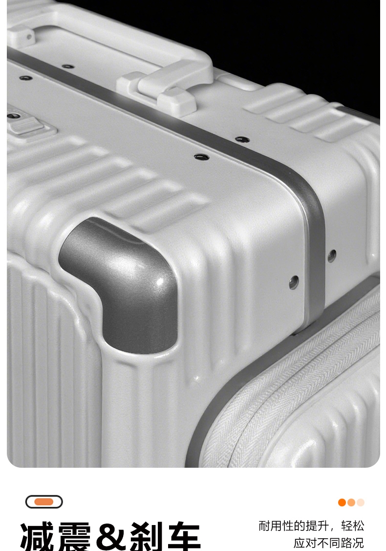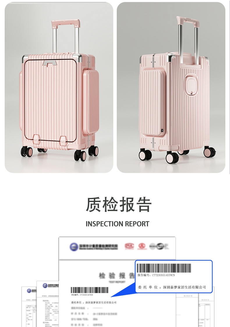 嵌入式前置独立电脑仓,滴答一下优雅出行;外置USB+Type-C充电口,时刻能量满满;手机支架,水杯支架,功能强大;航空级合金拉杆,双排高弹力TPE刹车轮;创新双侧口袋