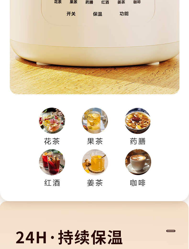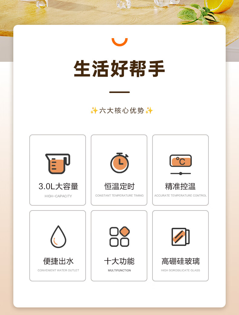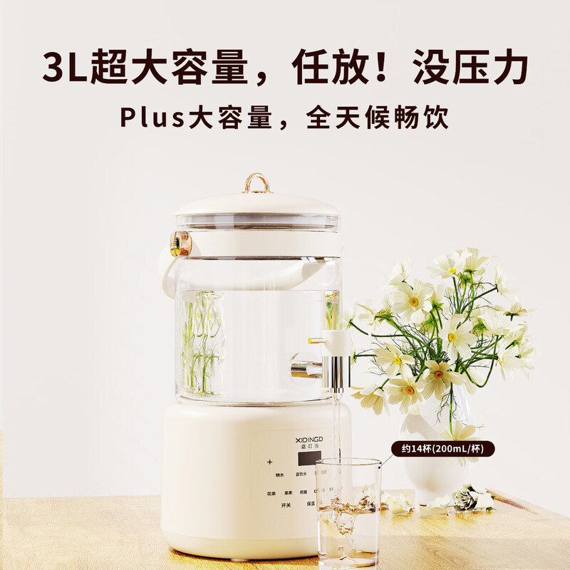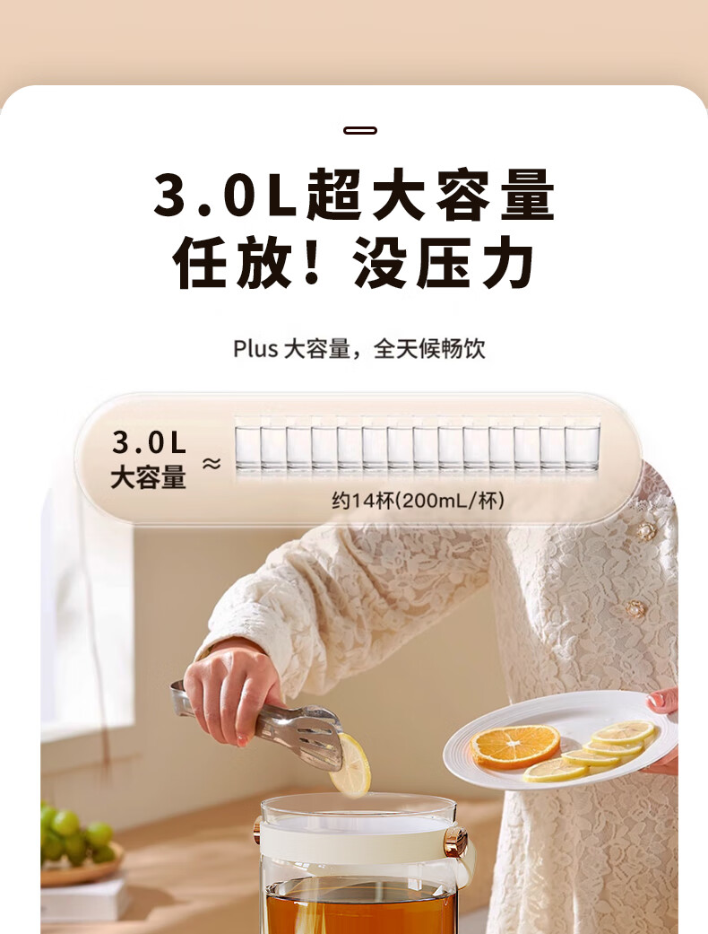 3.0L超大容量,满足全家畅饮;1000W疾速沸腾,3分钟即享热饮;24小时恒温守护,长效锁温胜似暖水瓶