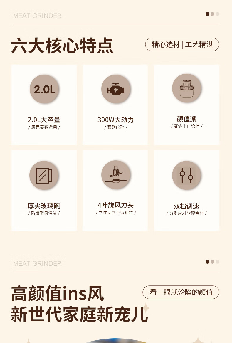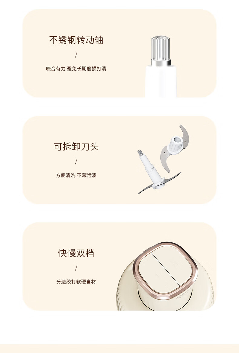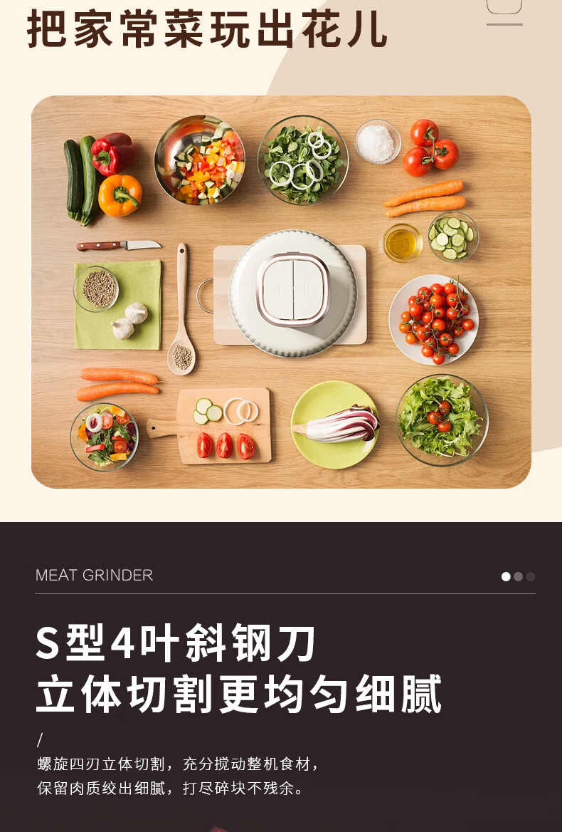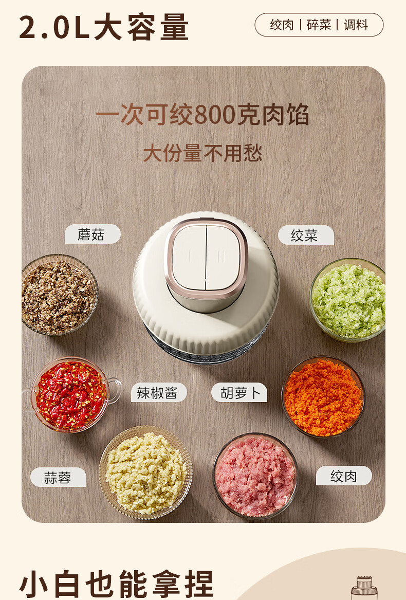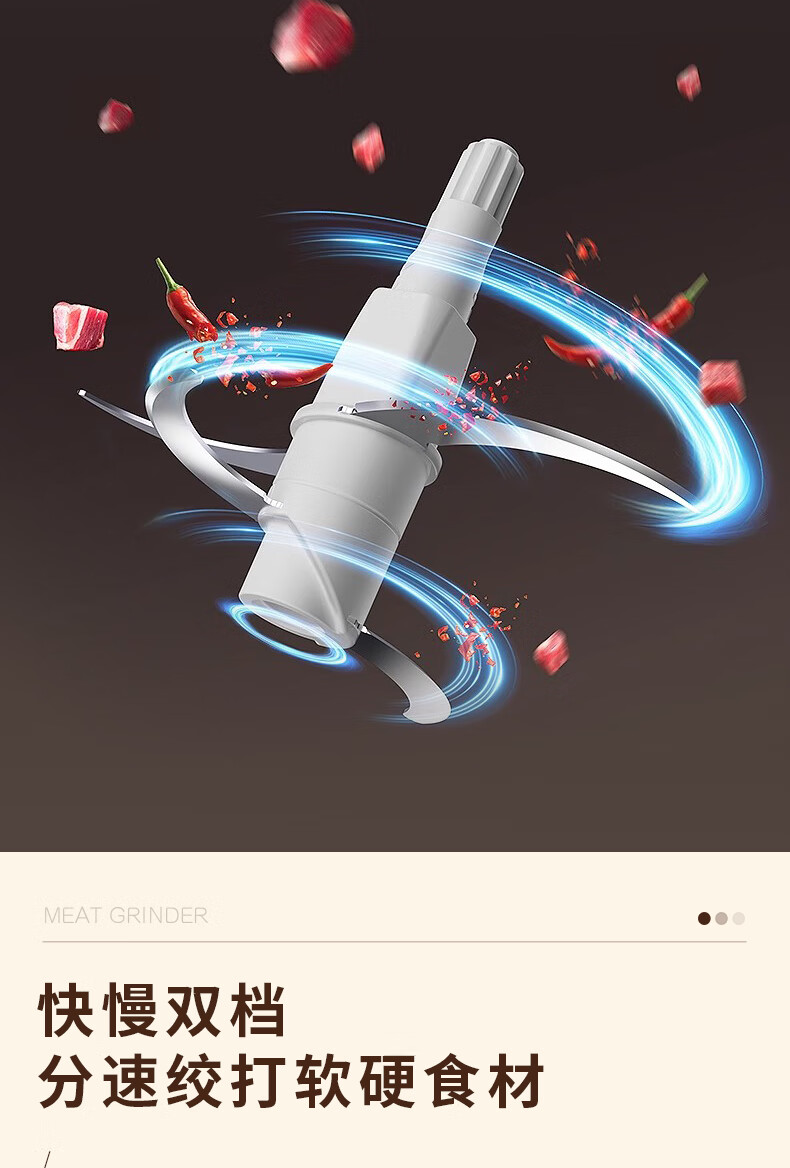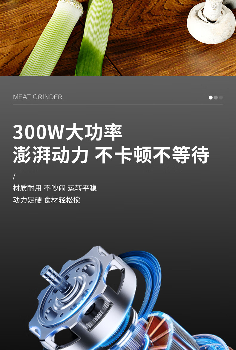 多档调节控制,轻松搞定各种食材;300W强劲动力,快速绞肉;易拆易洗,省心省力