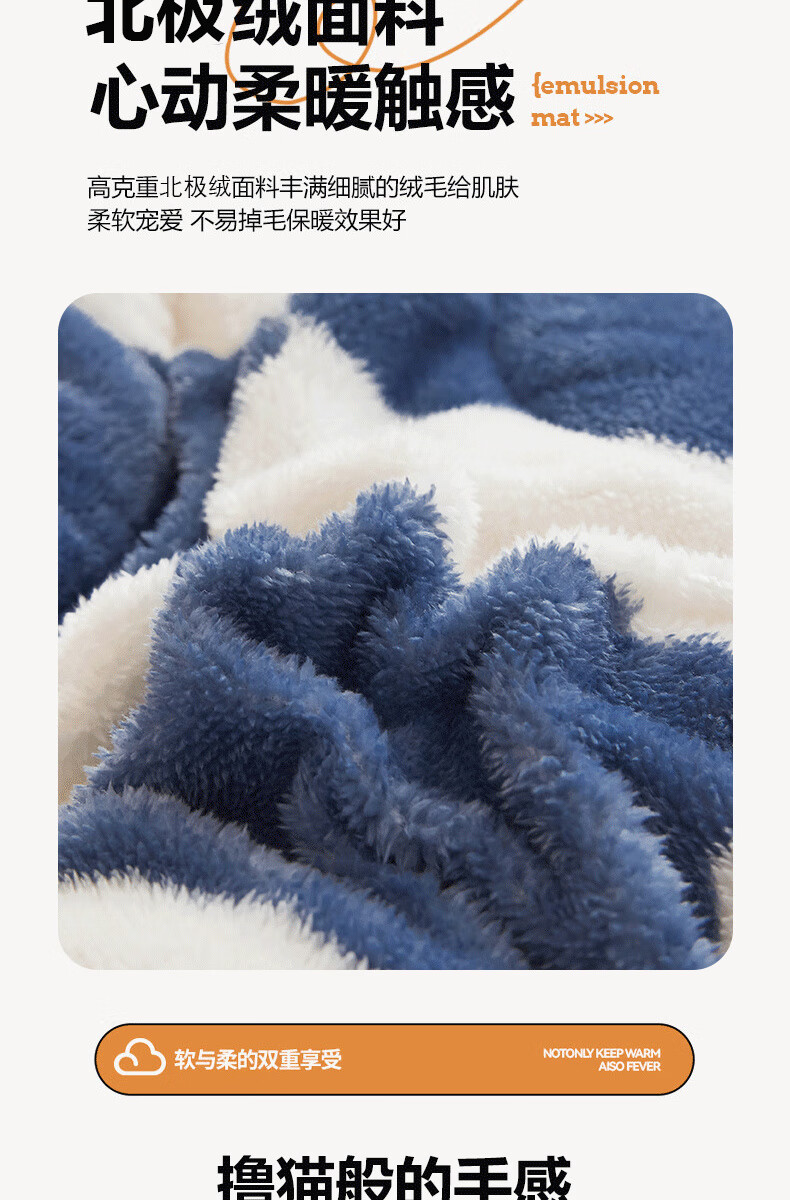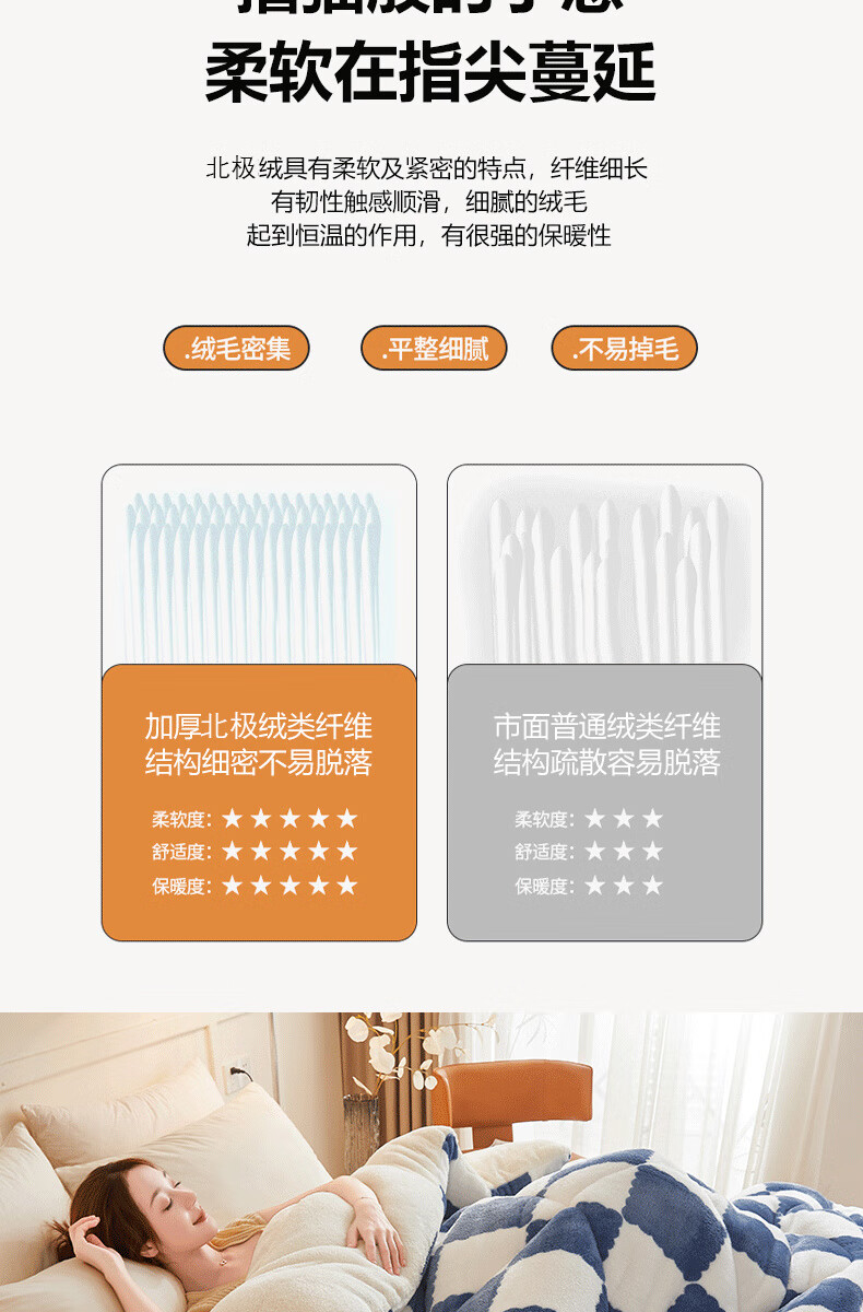 高克重北极绒面料丰满细腻的绒毛给肌肤柔软宠爱;不易掉毛保暖效果好,北极绒具有柔软及紧密的特点;细腻的绒毛起到恒温的作用,有很强的保暖性