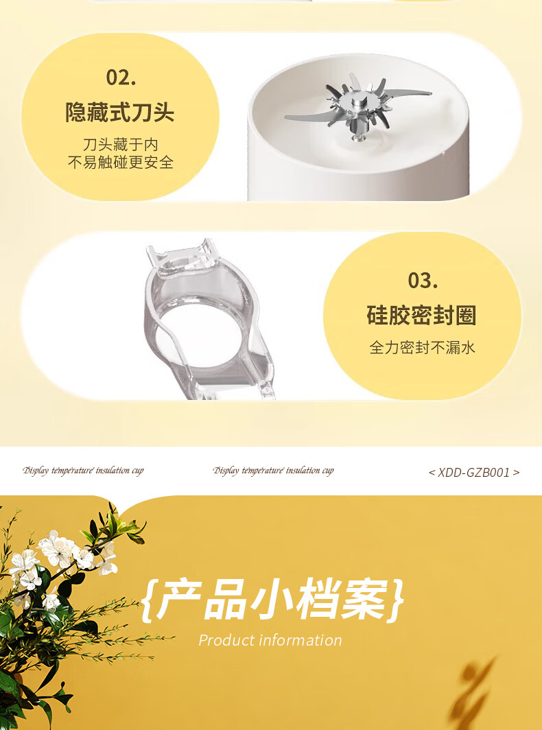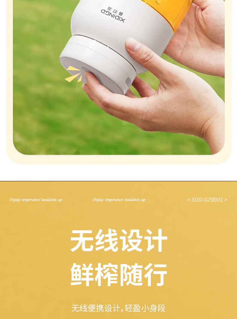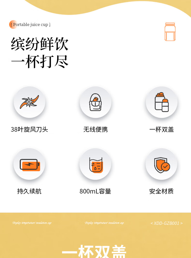 一杯双盖,一机多用;38叶精钢刀头,轻松变冰沙;1300mAh电量,持久续航,尽兴续杯
