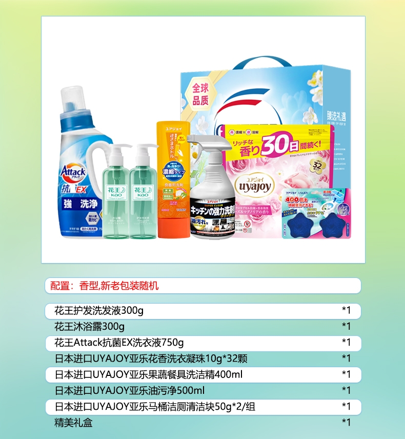 配置清单:配置明细:香型随机 花王(KAO)护发洗发液300g*1 花王(KAO)沐浴露300g*1 花王Attack抗菌EX洗衣液750g*1 日本UYAJOY亚乐花香洗衣凝珠8g*32颗*1 日本UYAJOY亚乐果蔬餐具洗洁精400ml*1 日本UYAJOY亚乐油污净500ml*1 日本UYAJOY亚乐马桶洁厕清洁块50g * 2/组*1 精美彩盒ZS146*1