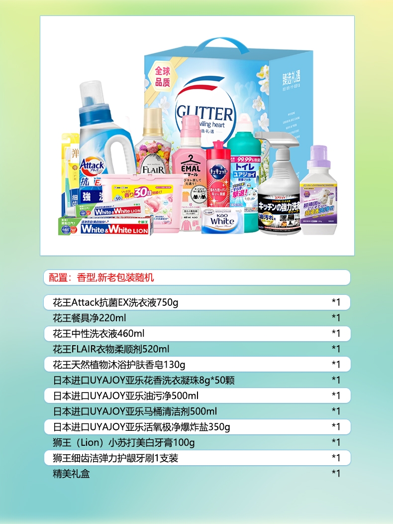 配置清单:配置明细:香型随机 花王Attack抗菌EX洗衣液750g*1 花王(KAO)餐具净220ml*1 花王(KAO)中性洗衣液460ml*1 花王(KAO) FLAIR衣物柔顺剂 520ml*1 花王(KAO)天然植物沐浴护肤香皂130g*1 日本UYAJOY亚乐花香洗衣凝珠8g*50颗*1 日本UYAJOY亚乐油污净500ml*1 日本UYAJOY亚乐马桶清洁剂500ml*1 日本UYAJOY亚乐活氧极净爆炸盐350g*1 狮王(Lion)小苏打美白牙膏100g*1 狮王(lion)细齿洁弹力护龈牙刷1支装*1 精美彩盒ZS084*1