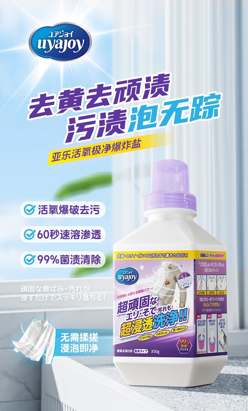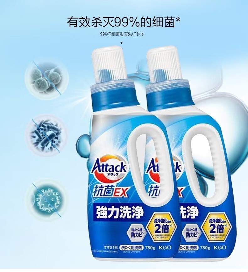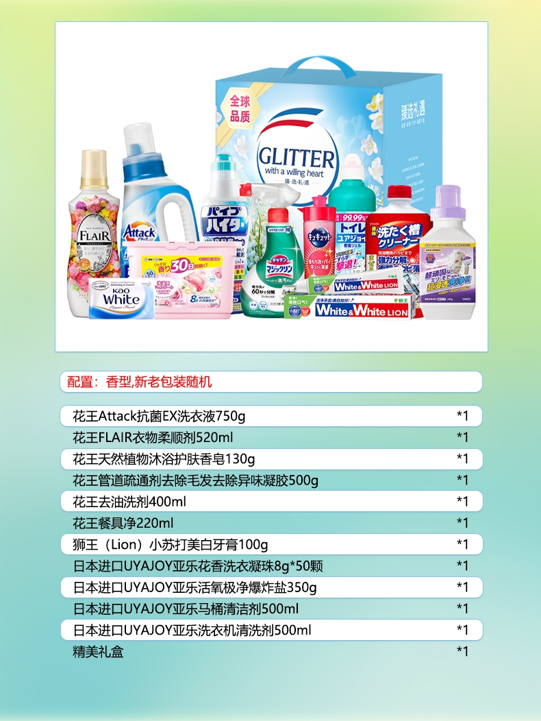 配置清单:配置明细:香型随机 花王Attack抗菌EX洗衣液750g*1 花王(KAO)FLAIR衣物柔顺剂 520ml*1 花王(KAO)天然植物沐浴护肤香皂130g*1 花王(KAO)管道疏通剂去除毛发去除异味凝胶500g*1 花王(KAO)去油洗剂400ml*1 花王(KAO)餐具净220ml*1 狮王(Lion)小苏打美白牙膏100g*1 日本UYAJOY亚乐花香洗衣凝珠8g*50颗*1 日本UYAJOY亚乐活氧极净爆炸盐350g*1 日本UYAJOY亚乐马桶清洁剂500ml*1 日本UYAJOY亚乐洗衣机清洗剂500ml*1 精美彩盒ZS084*1