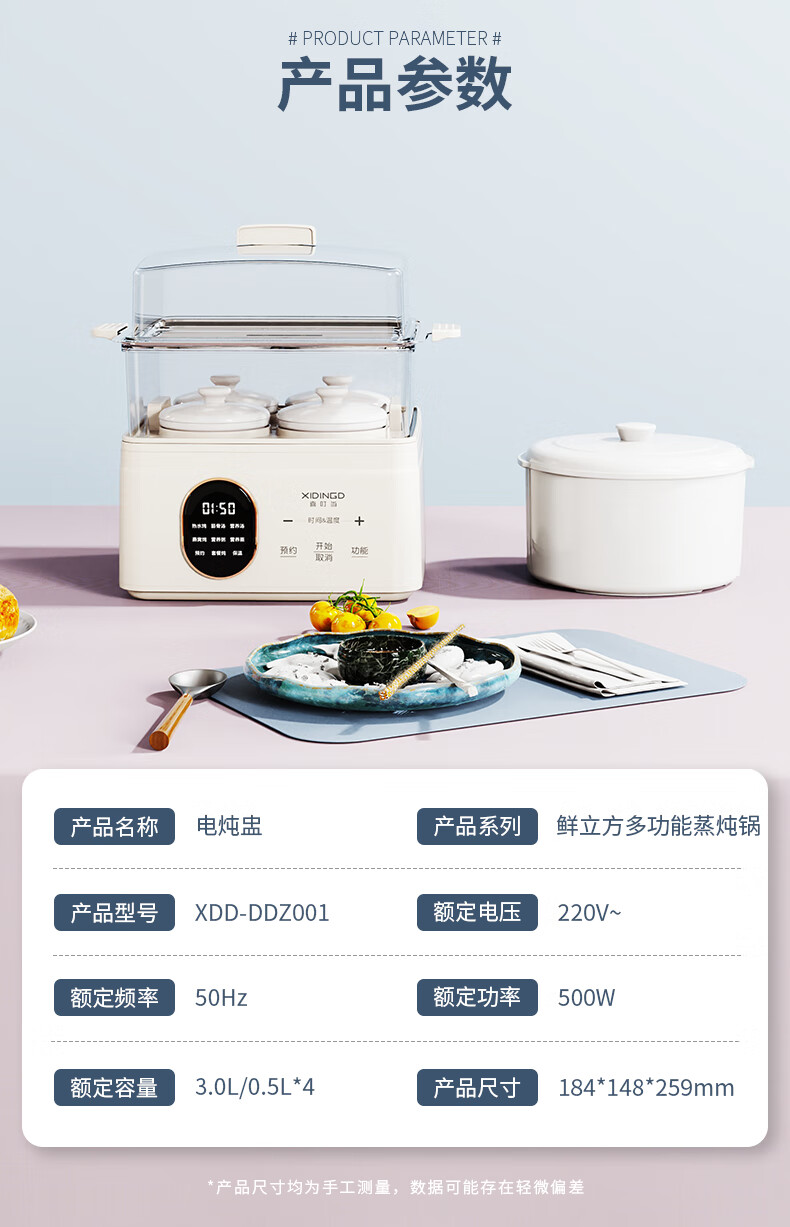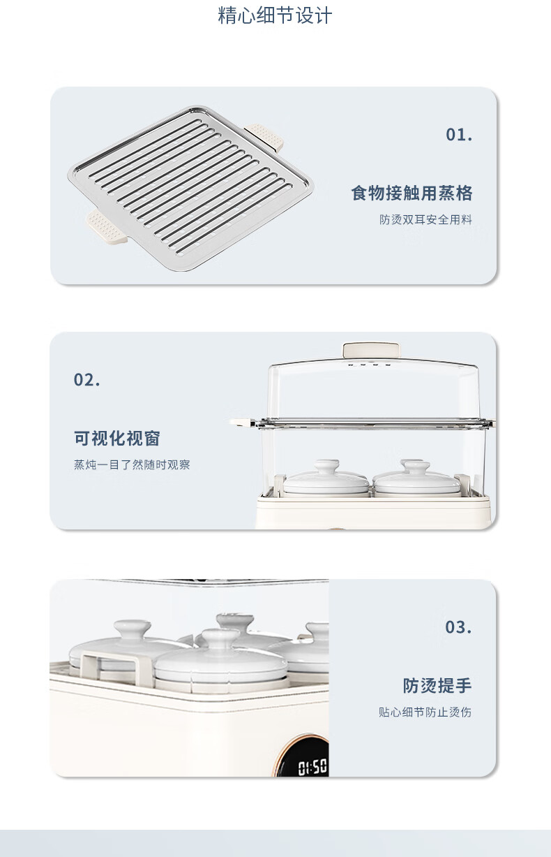配置清单:蒸炖锅体/隔层/3L炖盅*1/0.5L炖盅*4/说明书