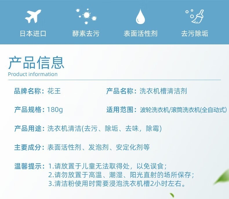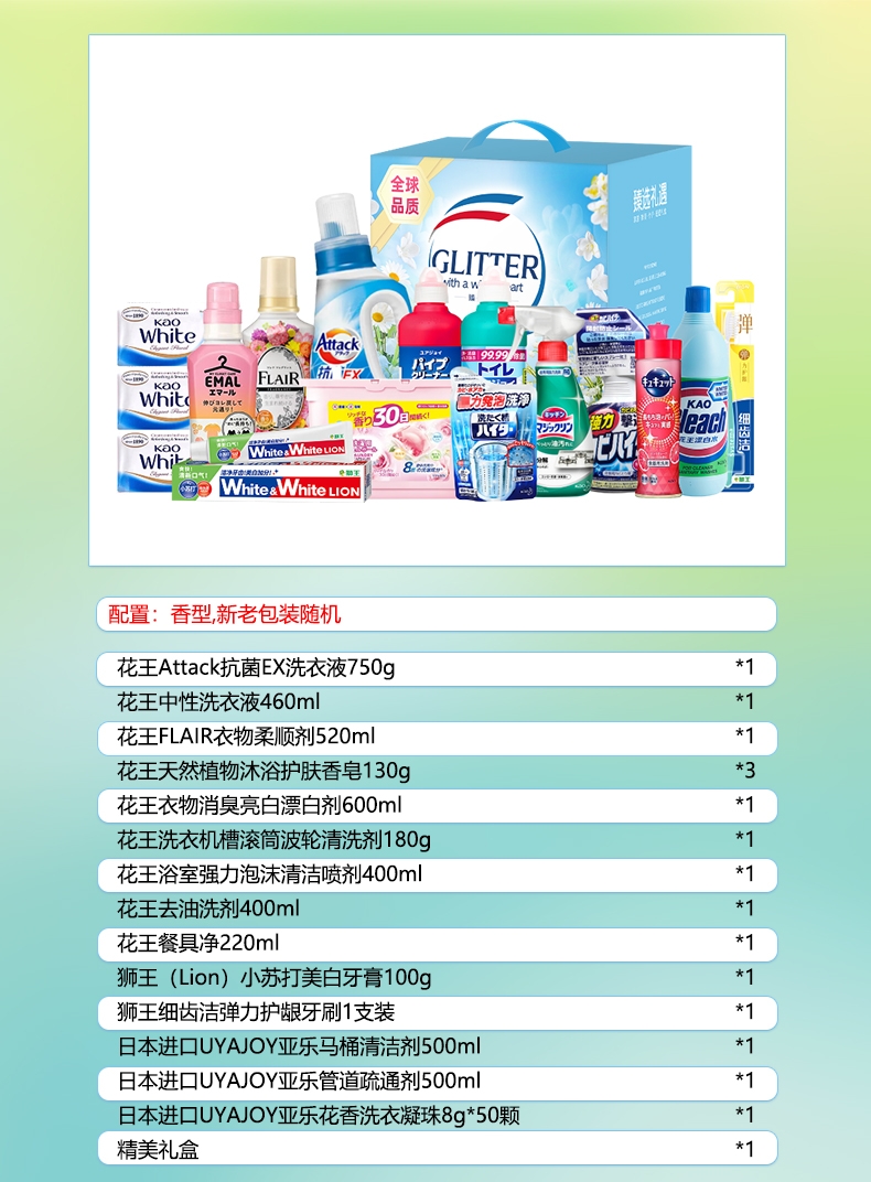 配置清单:配置明细:香型随机 花王Attack抗菌EX洗衣液750g*1 花王(KAO)中性洗衣液460ml*1 花王(KAO)FLAIR衣物柔顺剂 520ml*1 花王(KAO)天然植物沐浴护肤香皂130g*3 花王(KAO)衣物消臭亮白漂白剂600ml*1 花王(KAO)洗衣机槽滚筒波轮清洗剂180g*1 花王(KAO)浴室强力泡沫清洁喷剂400ml*1 花王(KAO)去油洗剂400ml*1 花王(KAO)餐具净220ml*1 狮王(Lion)小苏打美白牙膏100g*1 狮王(lion)细齿洁弹力护龈牙刷1支装*1 日本UYAJOY亚乐马桶清洁剂500ml*1 日本UYAJOY亚乐管道疏通剂500ml*1 日本UYAJOY亚乐花香洗衣凝珠8g*50颗*1 精美彩盒ZS084*1