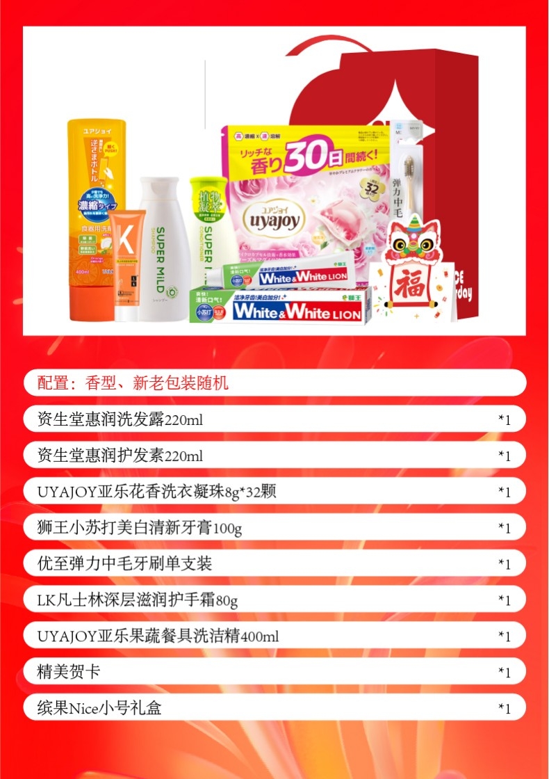 配置清单:配置明细:(颜色香型随机) 资生堂惠润洗发露220ml*1 资生堂惠润护发素220ml*1 UYAJOY亚乐花香洗衣凝珠8g*32颗*1 狮王(Lion)小苏打美白清新牙膏100g*1 优至弹力中毛牙刷单支装*1 LK 凡士林深层滋润护手霜 80g*1 UYAJOY亚乐果蔬餐具洗洁精400ml*1 精美贺卡*1(量大可定制) 缤果Nice小号礼盒ZS177*1