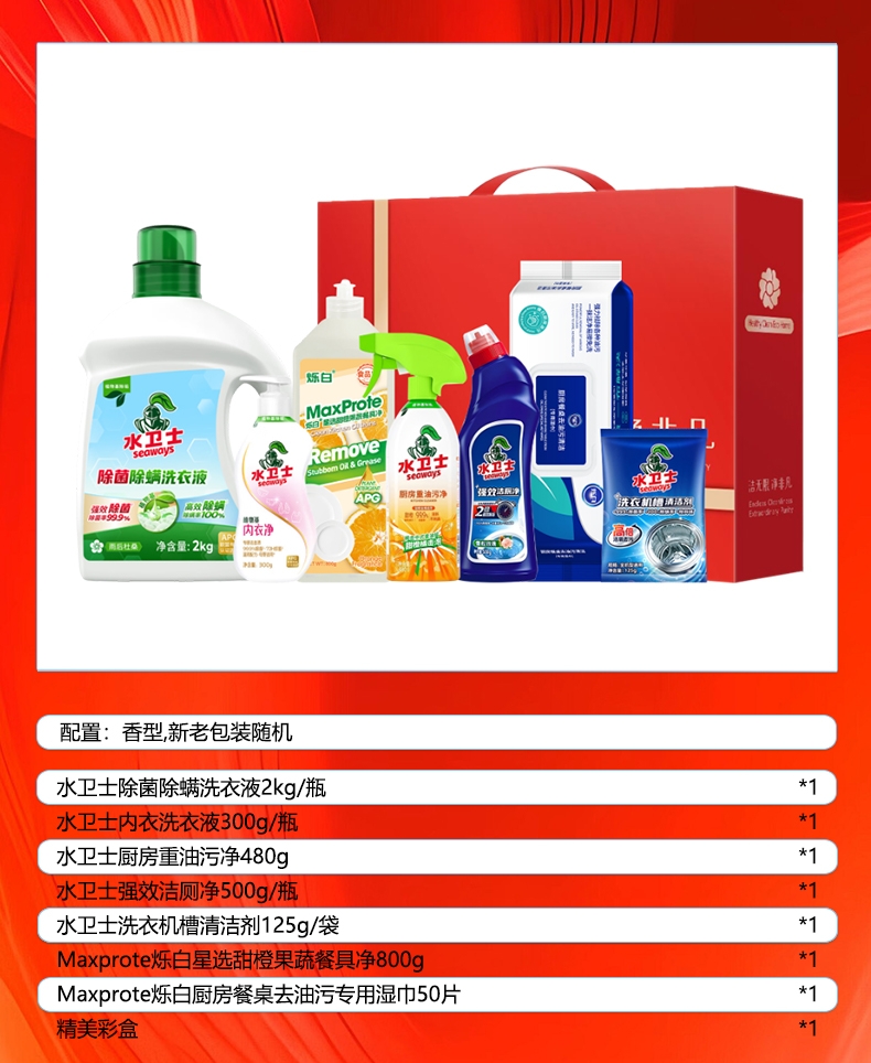 配置清单:配置明细:(香型/新老包装随机) 水卫士除菌除螨洗衣液2kg/瓶*1 水卫士内衣洗衣液300g/瓶*1 水卫士厨房重油污净480g*1 水卫士强效洁厕净500g/瓶*1 水卫士洗衣机槽清洁剂125g/袋*1 Maxprote烁白星选甜橙果蔬餐具净800g*1 Maxprote烁白厨房餐桌去油污专用湿巾50片*1 精美彩盒*1