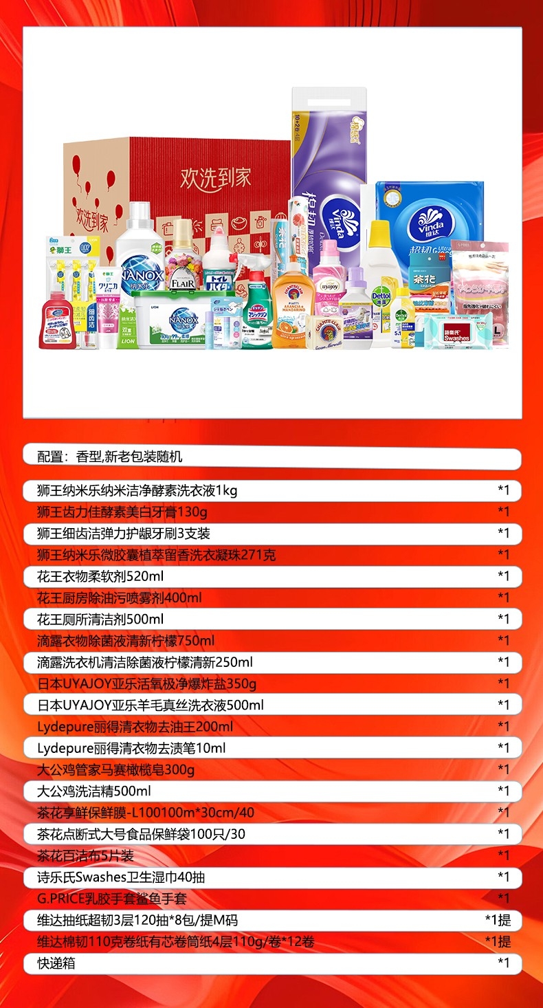 配置清单:●配置:(香型随机) 狮王(Lion)纳米乐纳米洁净酵素洗衣液1kg*1 狮王(Lion)齿力佳酵素美白牙膏130g*1 狮王(Lion)细齿洁弹力护龈牙刷3支装*1 狮王(Lion)纳米乐微胶囊植萃留香洗衣凝珠271克(23颗)*1 花王衣物柔软剂520ml*1 花王厨房除油污喷雾剂400ml*1 花王厕所清洁剂500ml*1 滴露衣物除菌液清新柠檬750ml*1 滴露洗衣机清洁除菌液柠檬清新250ml*1 日本UYAJOY亚乐活氧极净爆炸盐350g*1 日本UYAJOY亚乐羊毛真丝洗衣液500ml*1 Lydepure丽得清衣物去油王200ml*1 Lydepure丽得清衣物去渍笔10ml*1 大公鸡管家马赛橄榄皂300g*1 大公鸡洗洁精(香橙味)500ml*1 茶花享鲜保鲜膜-L100 100m*30cm/40*1 茶花点断式大号食品保鲜袋100只/30*1 茶花百洁布5片装*1 诗乐氏Swashes卫生湿巾40抽*1 G.PRICE乳胶手套鲨鱼手套*1 维达(Vinda)抽纸 超韧3层120抽*8包/提M码*1提 维达(Vinda)棉韧110克卷纸有芯卷筒纸4层110g/卷*