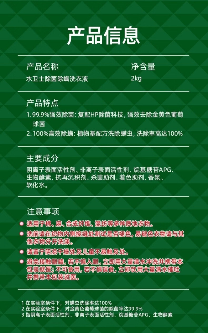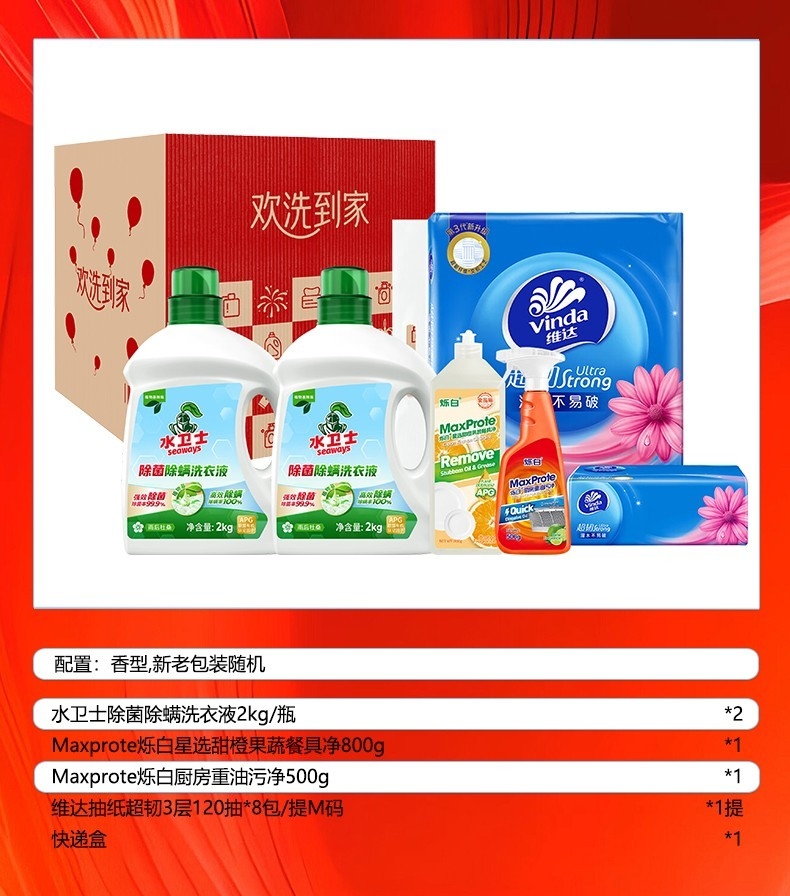 配置清单:●配置:(香型随机) 水卫士除菌除螨洗衣液2kg/瓶*2 Maxprote烁白星选甜橙果蔬餐具净800g*1 Maxprote烁白厨房重油污净500g*1 维达(Vinda)抽纸 超韧3层120抽*8包/提M码*1提 快递盒*1