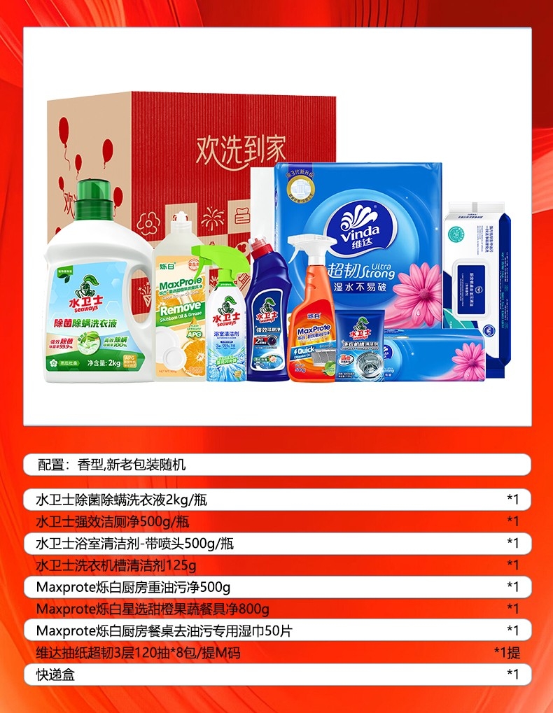配置清单:●配置:(香型随机) 水卫士除菌除螨洗衣液2kg/瓶*1 水卫士强效洁厕净500g/瓶*1 水卫士浴室清洁剂-带喷头500g/瓶*1 水卫士洗衣机槽清洁剂125g*1 Maxprote烁白厨房重油污净500g*1 Maxprote烁白星选甜橙果蔬餐具净800g*1 Maxprote烁白厨房餐桌去油污专用湿巾50片*1 维达(Vinda)抽纸 超韧3层120抽*8包/提M码*1提 快递盒*1