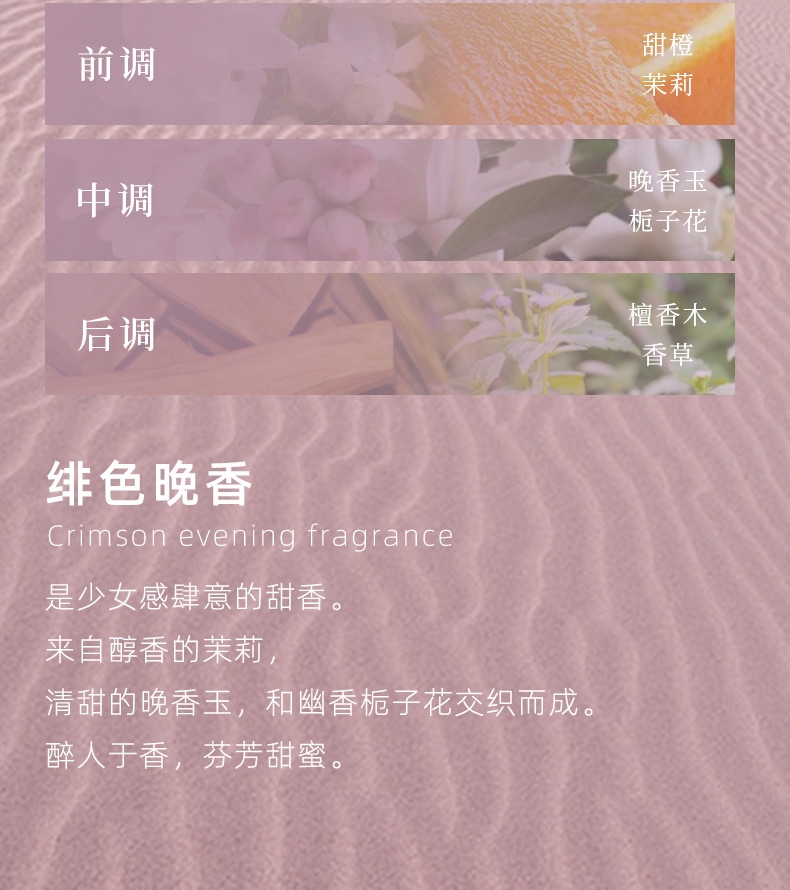 前调:甜橙、茉莉;中调:晚香玉、栀子花;尾调:檀香木、香草