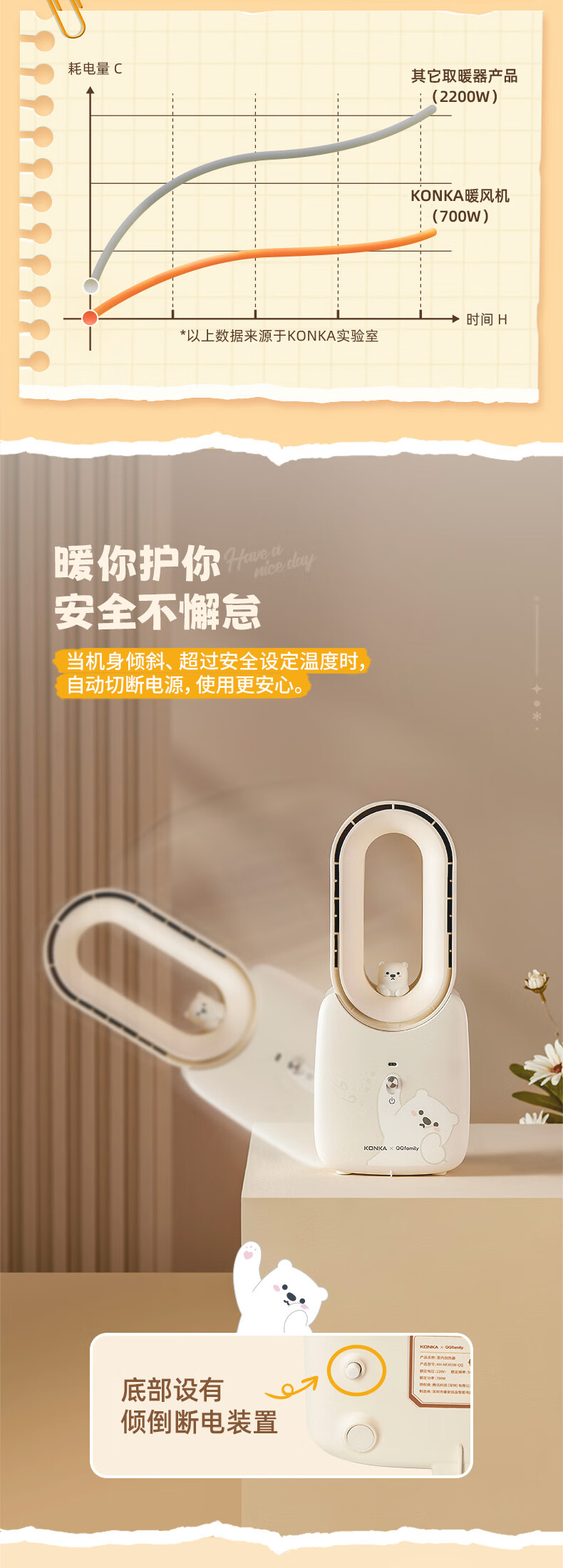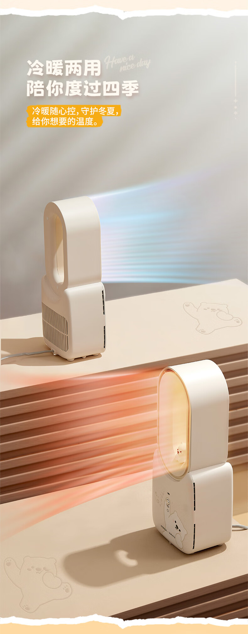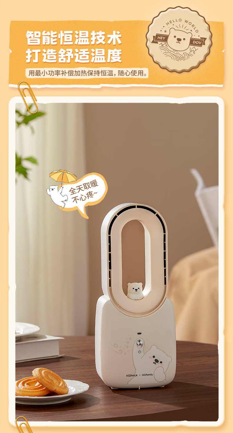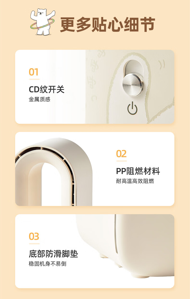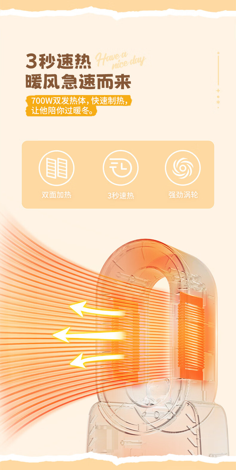 三秒速热;冷暖随心控,冬夏皆可使用;防倾倒开关,安全加热无负担