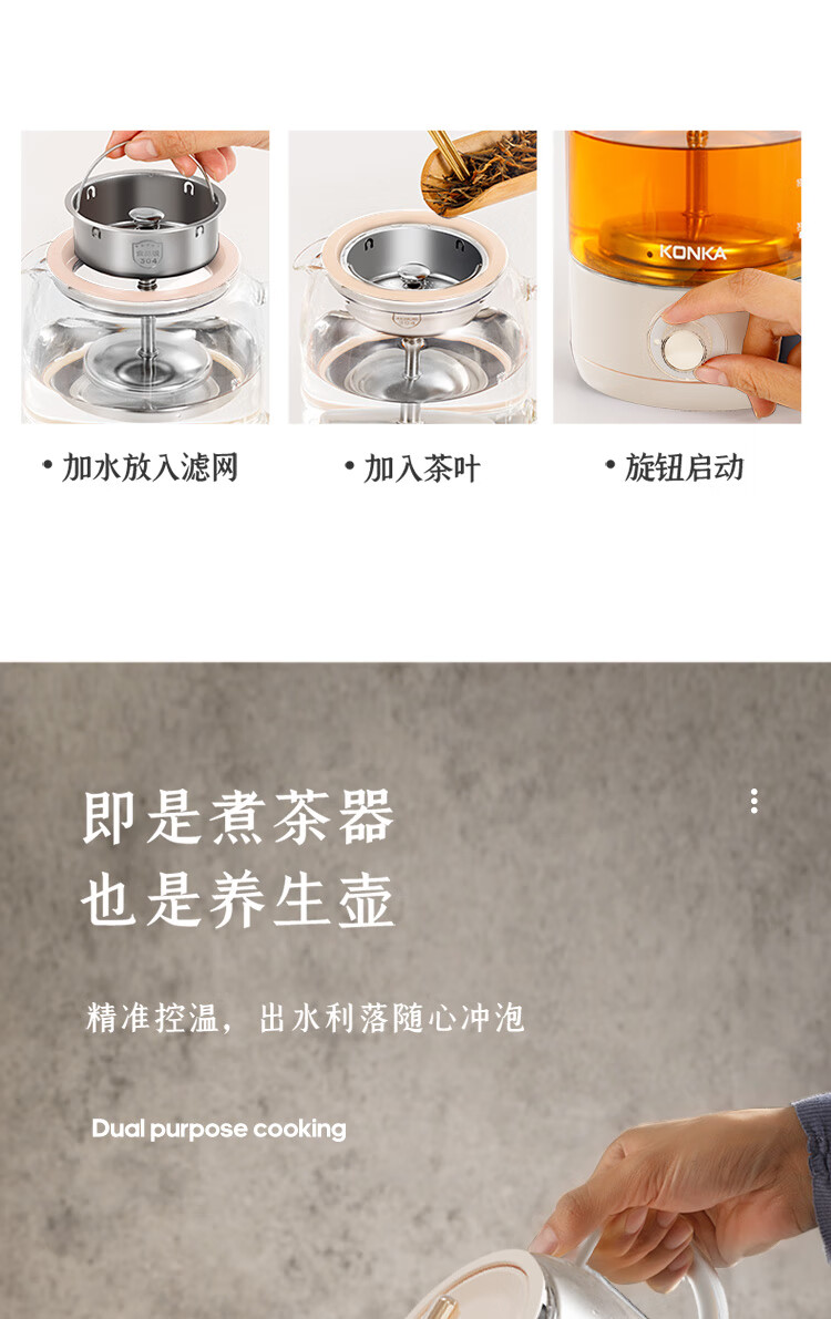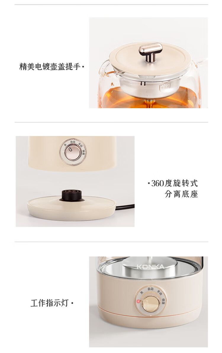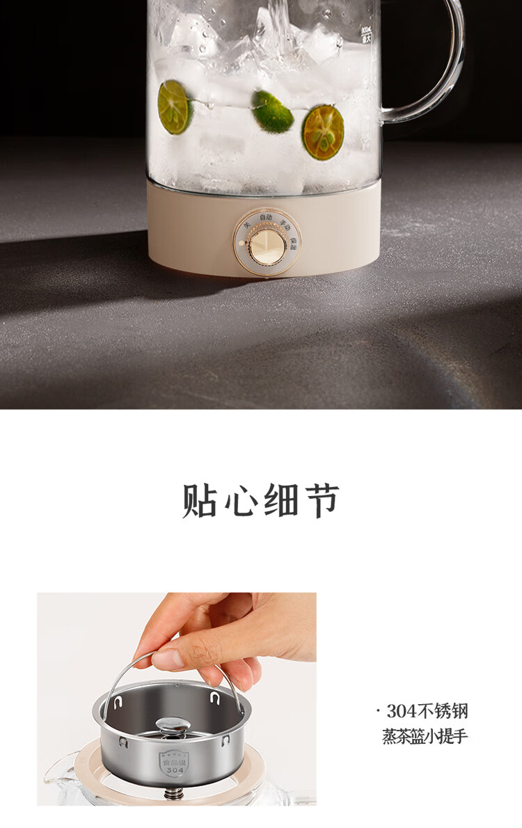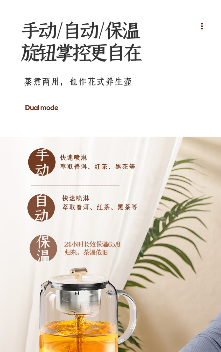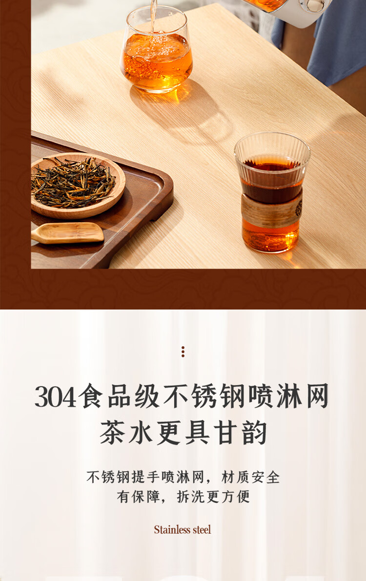 手动、自动、保温三档功能:煮茶,果茶,烧水,保温一;双开盖结构设计,大口径清洗更方便;全食品级304不锈钢底盘喷淋网,使用更安全