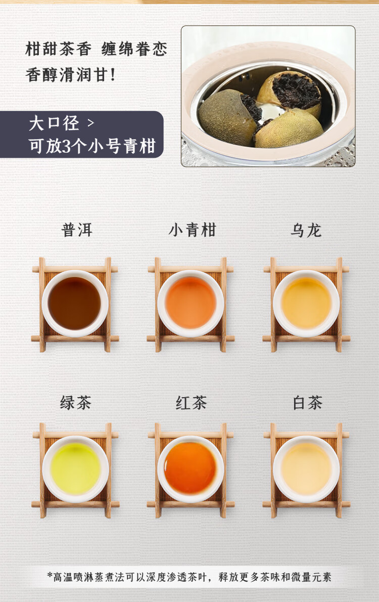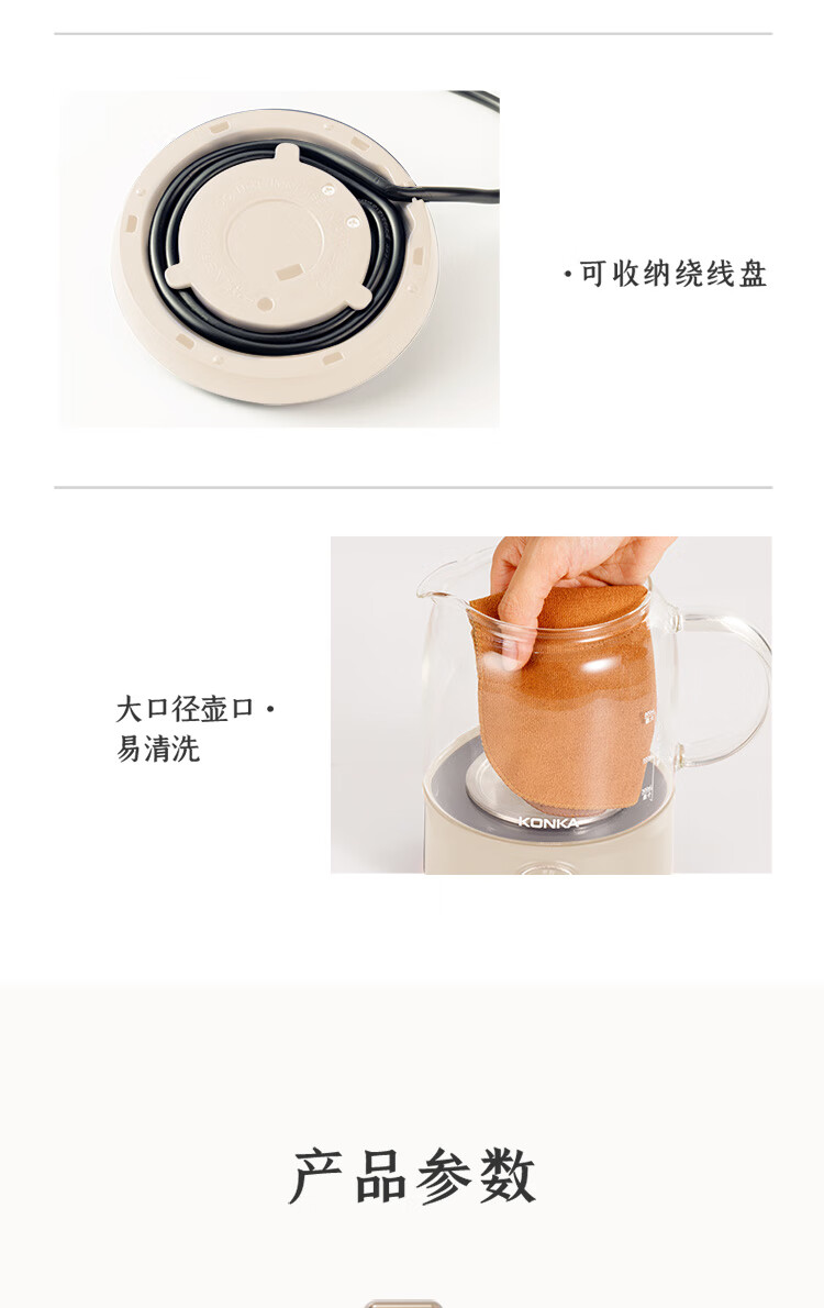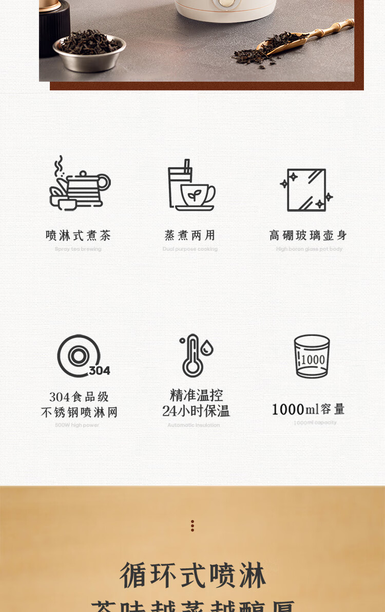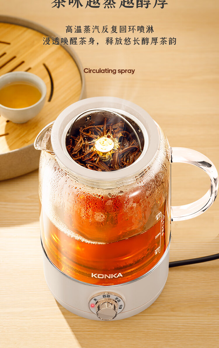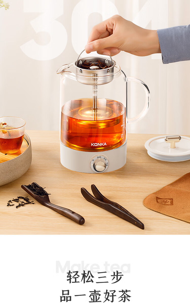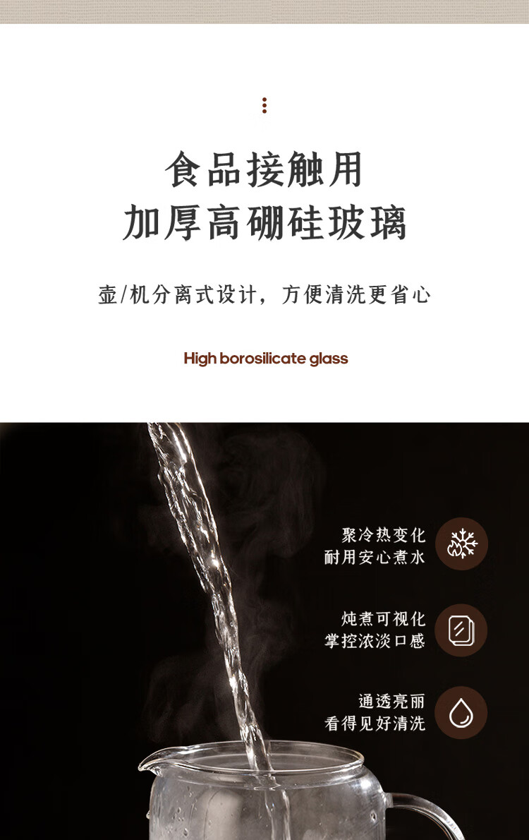 手动、自动、保温三档功能:煮茶,果茶,烧水,保温一;双开盖结构设计,大口径清洗更方便;全食品级304不锈钢底盘喷淋网,使用更安全