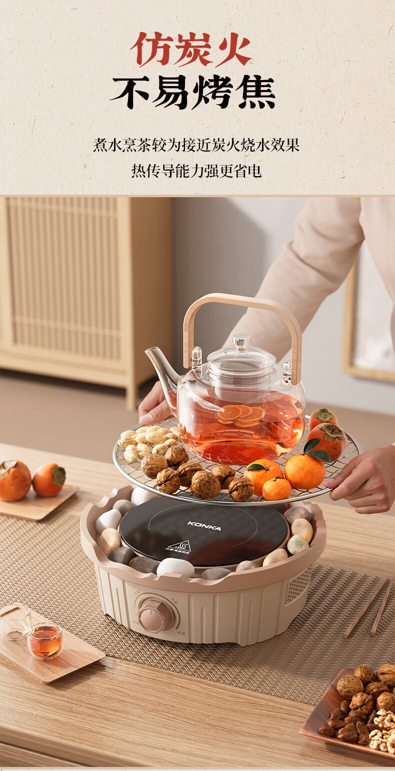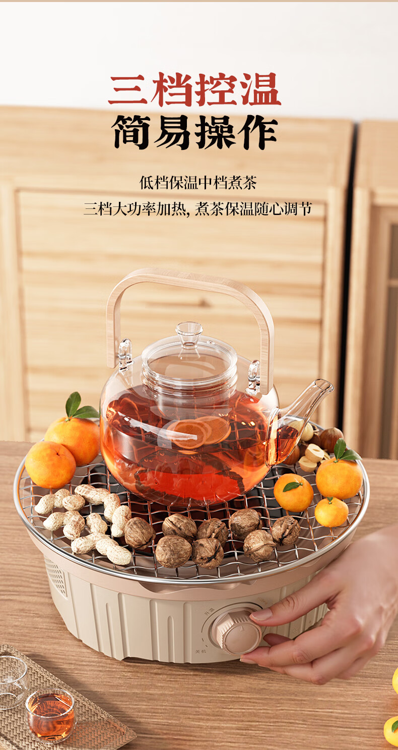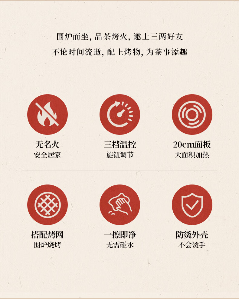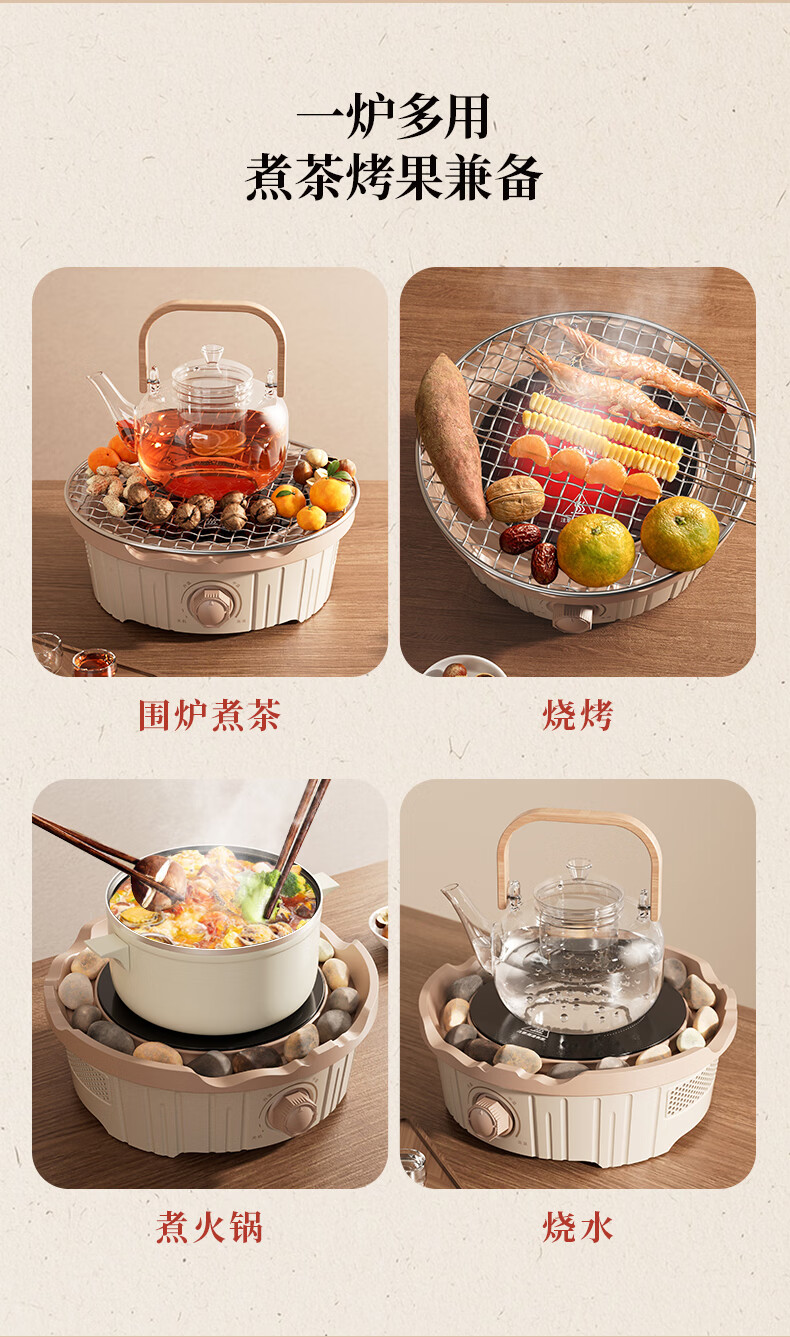 仿炭火加热:在室内实现围炉煮茶;仿炭火 不易烤焦;采用远红聚能加热,均匀受热,热效快