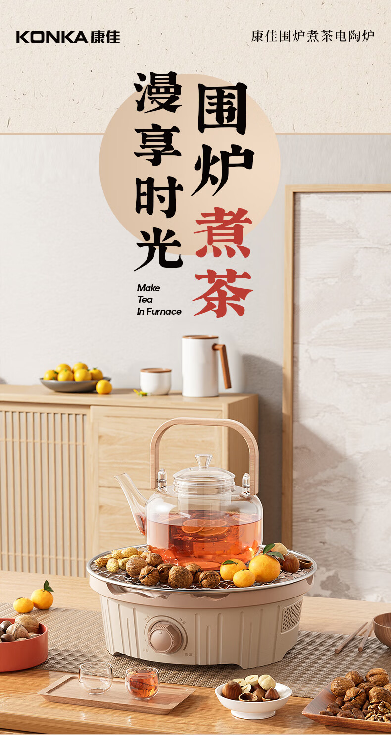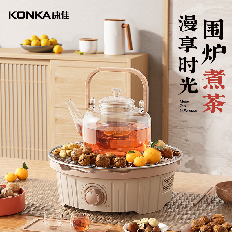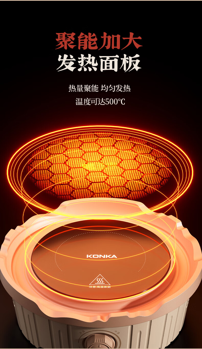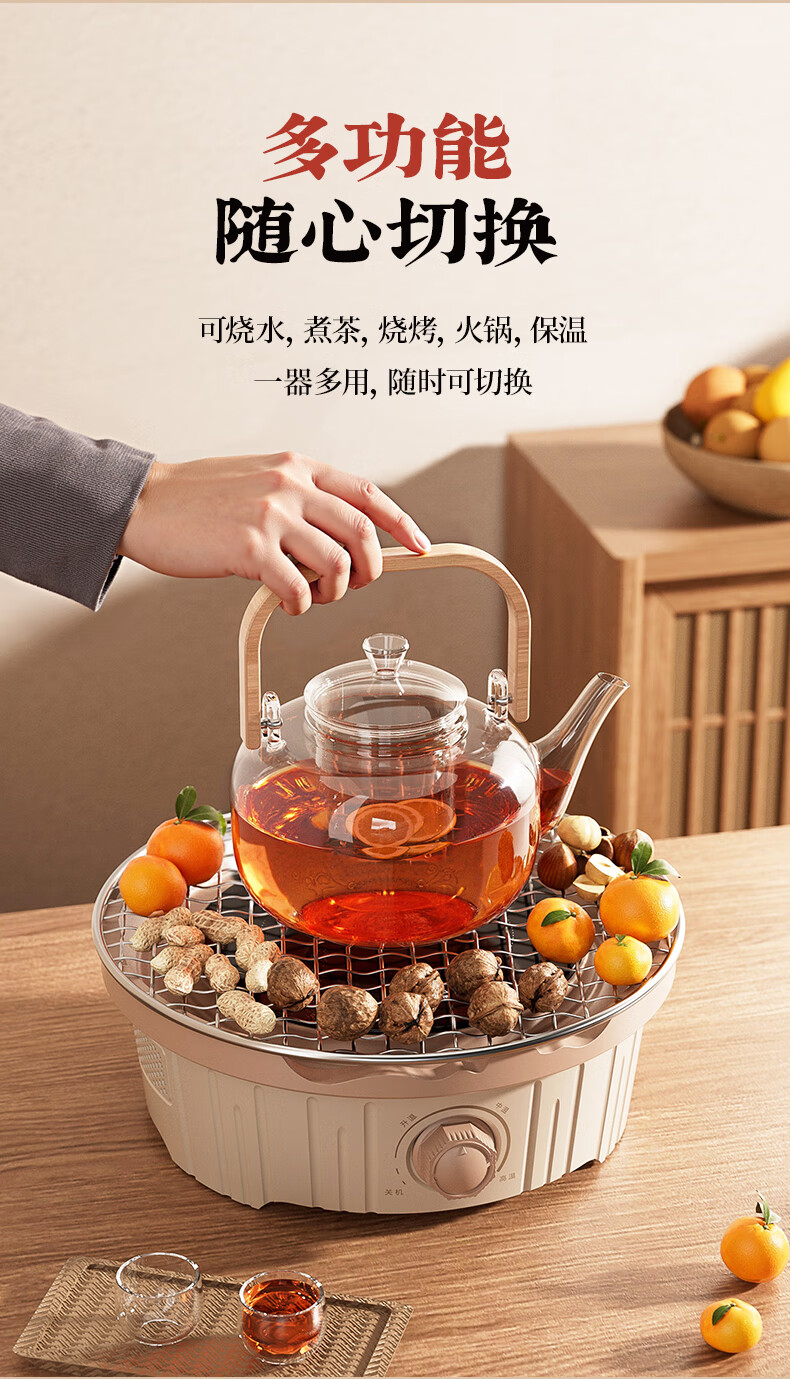 仿炭火加热:在室内实现围炉煮茶;仿炭火 不易烤焦;采用远红聚能加热,均匀受热,热效快