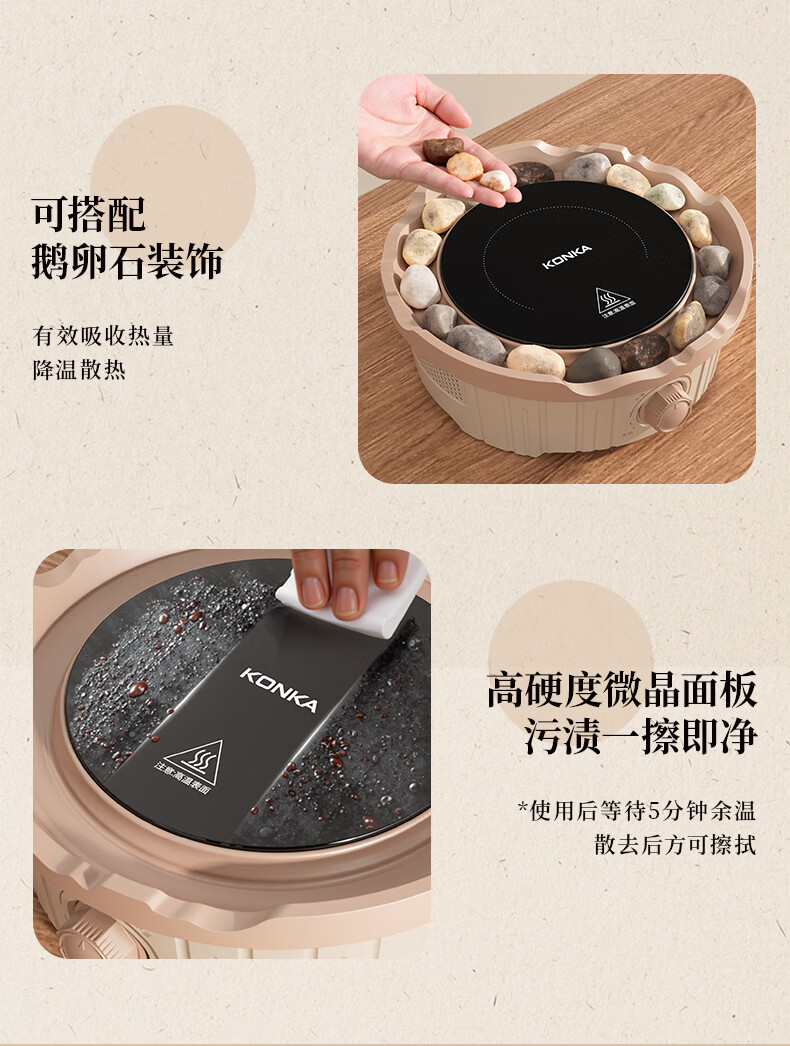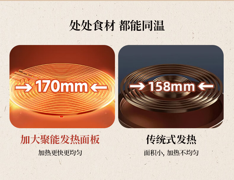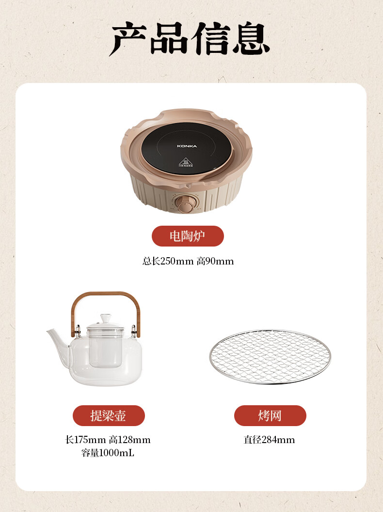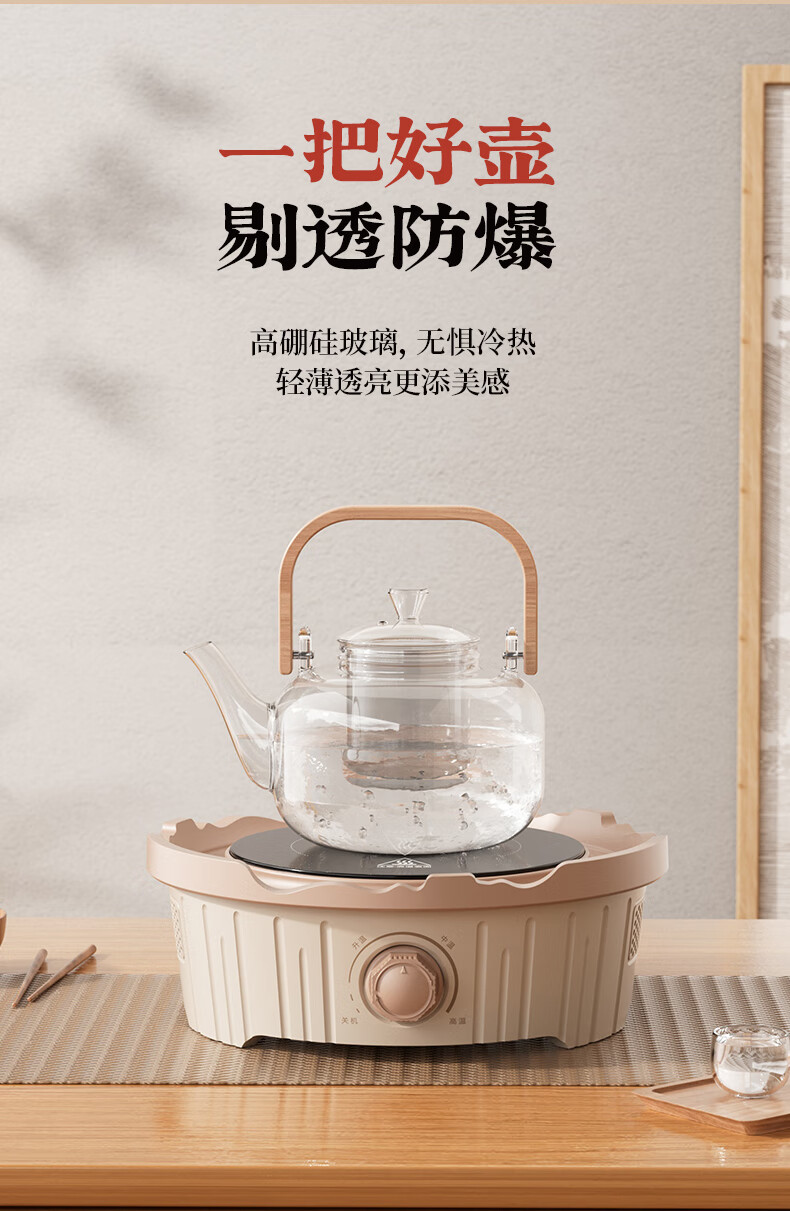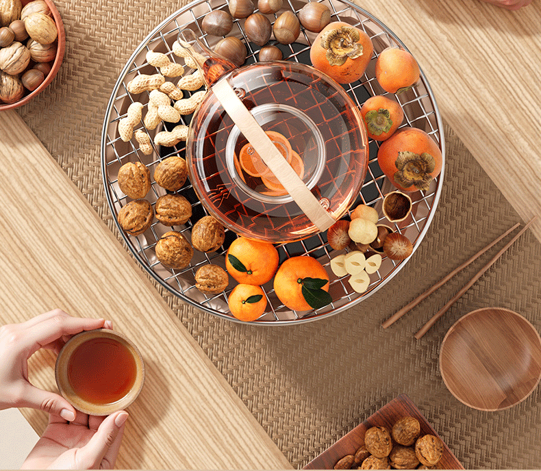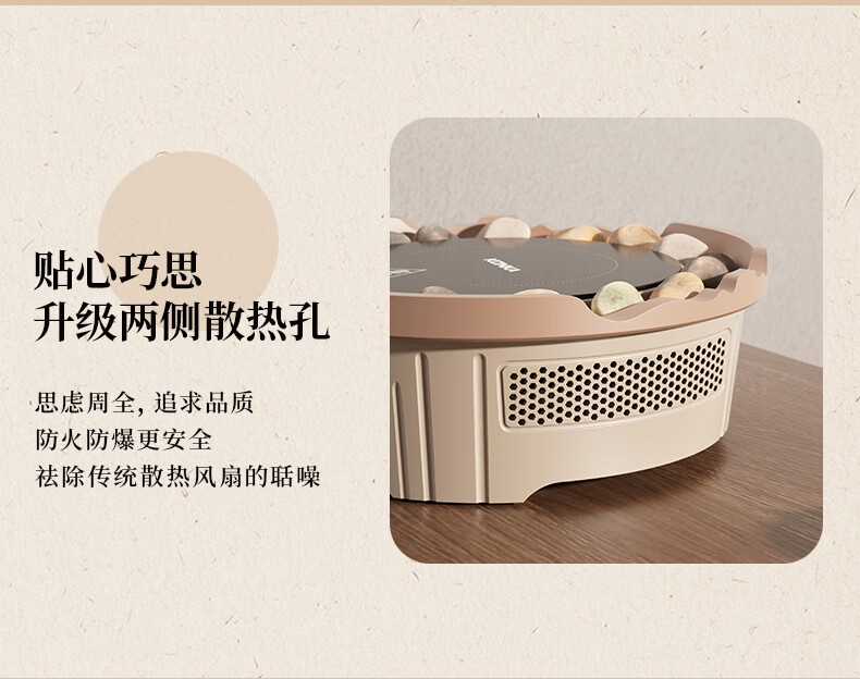 仿炭火加热:在室内实现围炉煮茶;仿炭火 不易烤焦;采用远红聚能加热,均匀受热,热效快