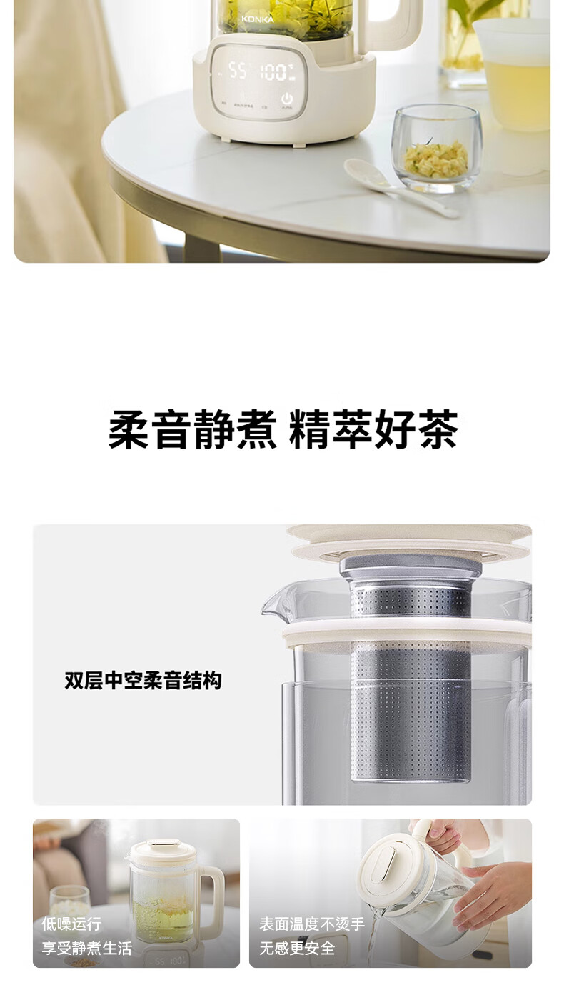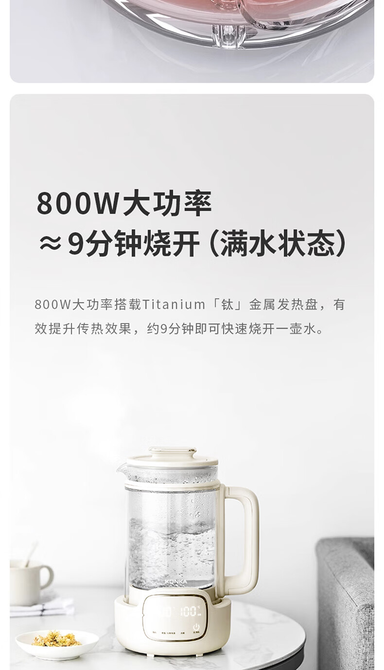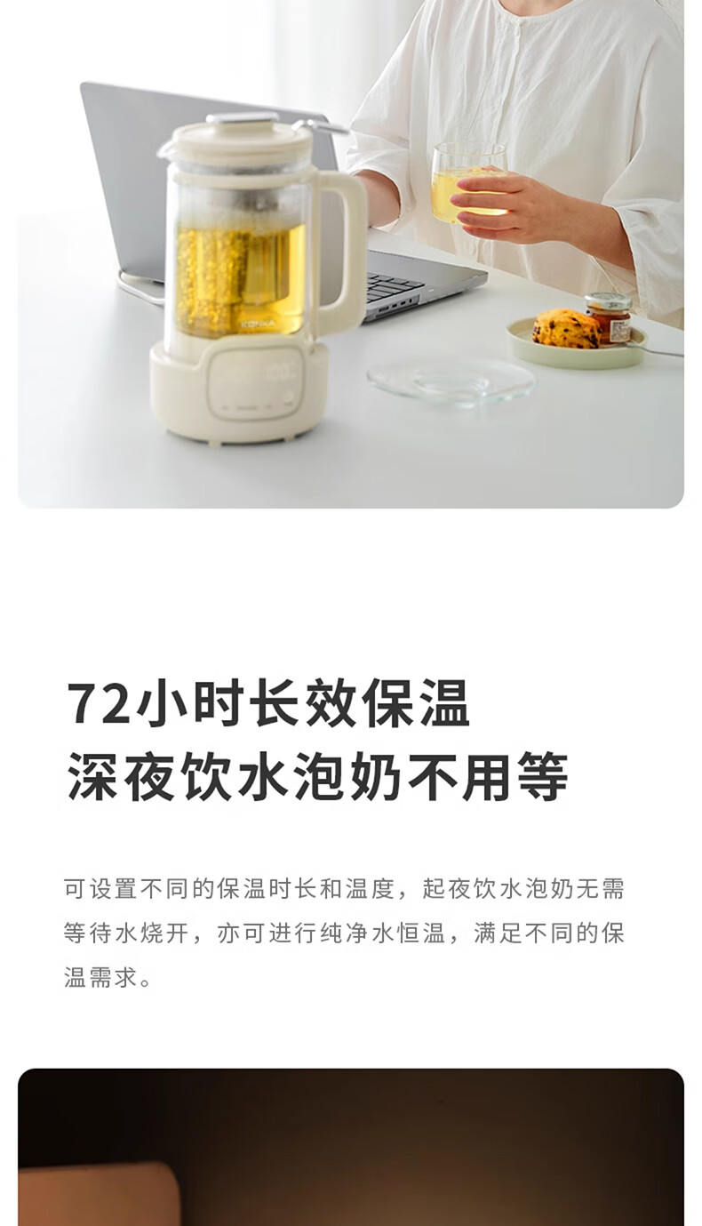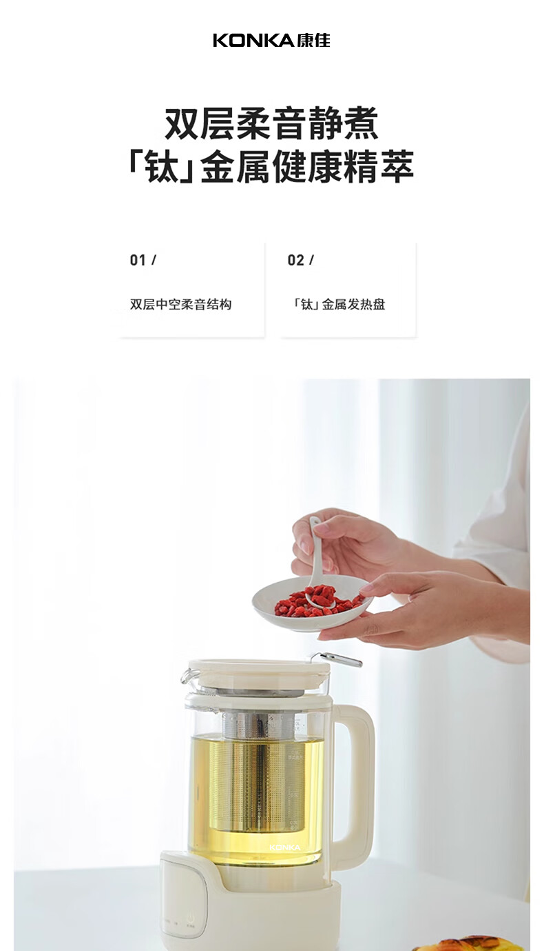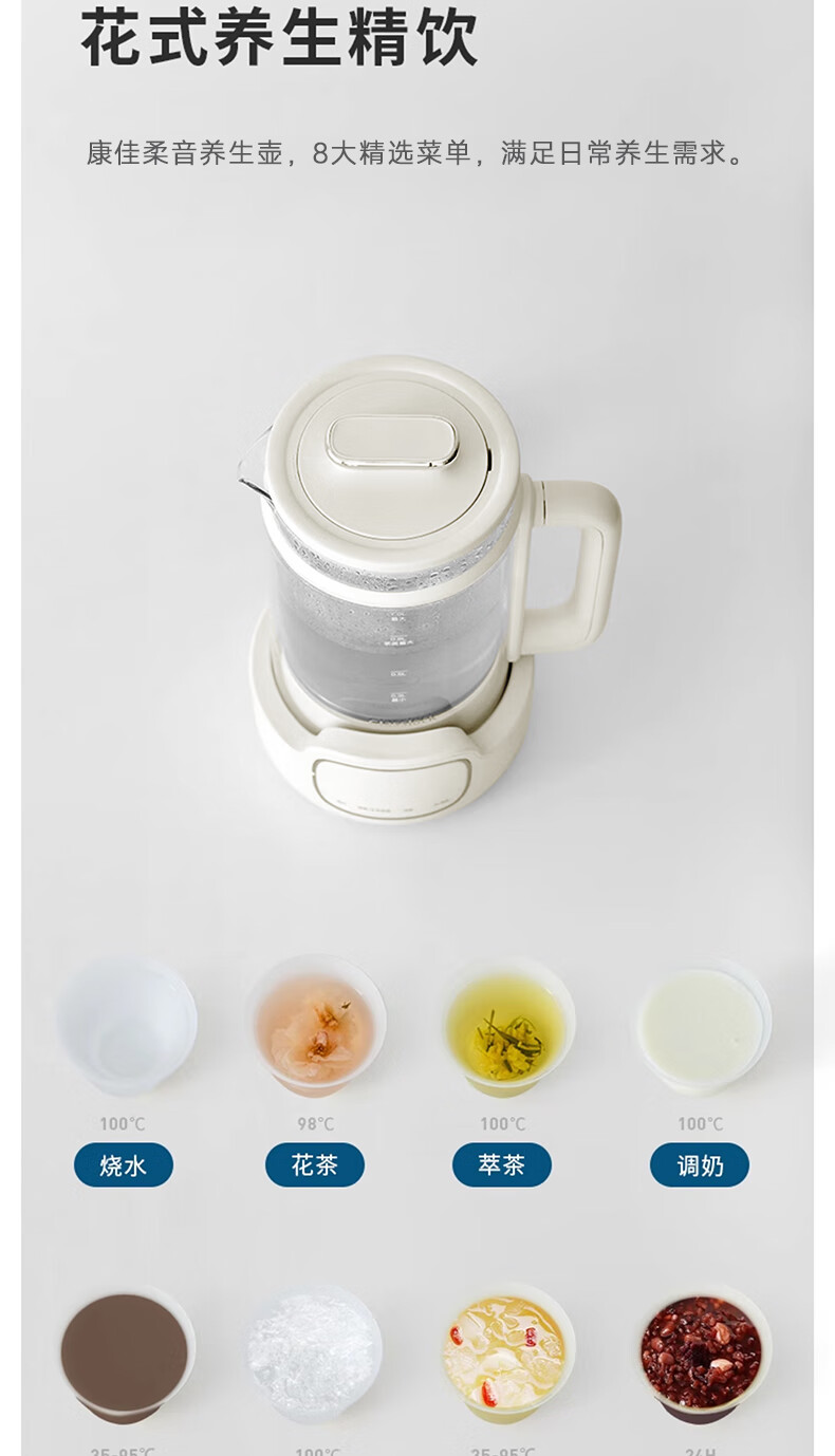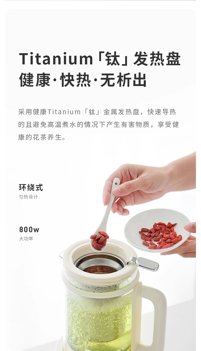 配置清单:1、DHM双层真空结构,PC+高硼硅玻璃养生壶,静音、防烫、耐摔捏捏小花挂件,精致可爱,轻松解压 2、钛金属发热盘,健康,不易生锈,没有有害物质析出 3、35-95°C恒温,72小时保温 4、双盖设计,中途加料,免烫伤 5、滤网小提手,轻松提拿
