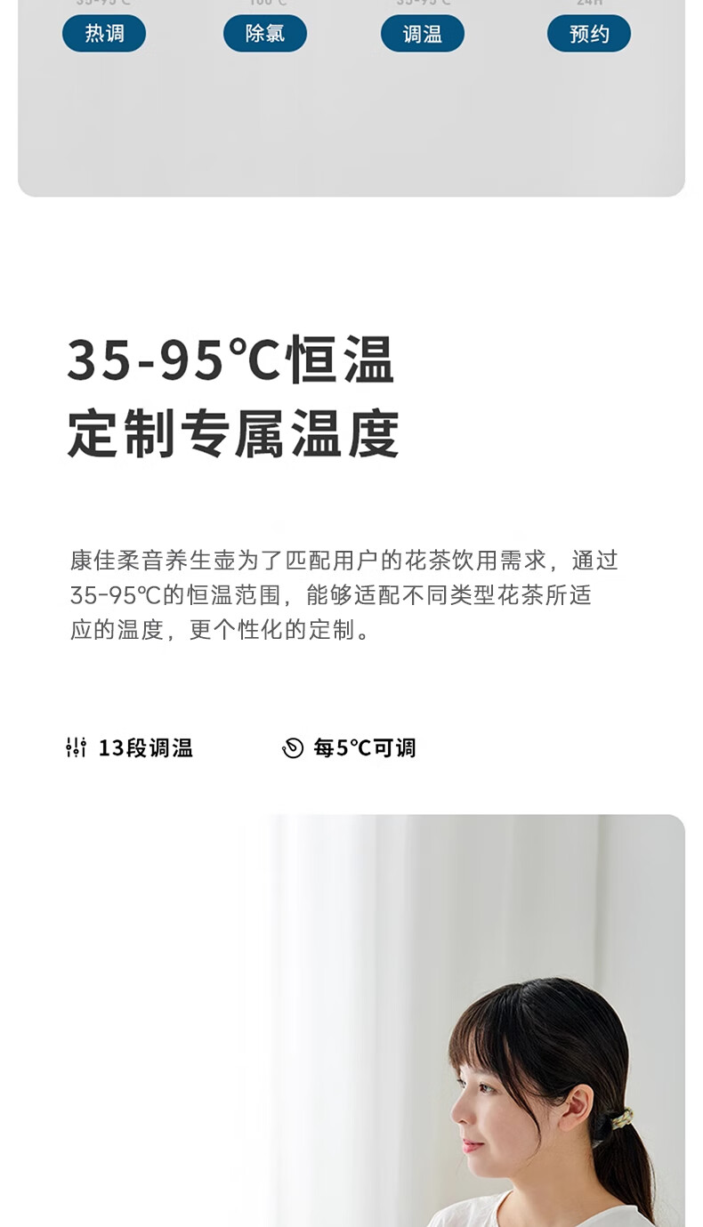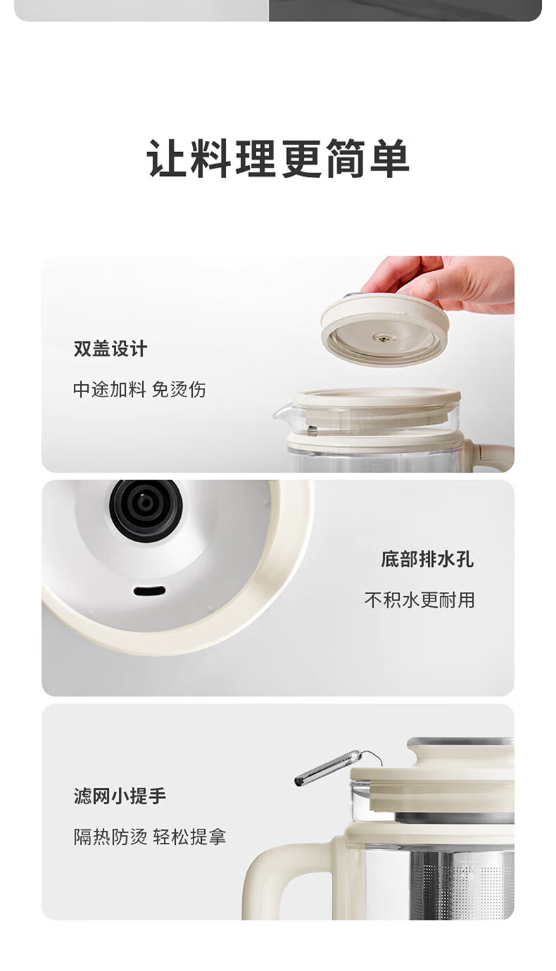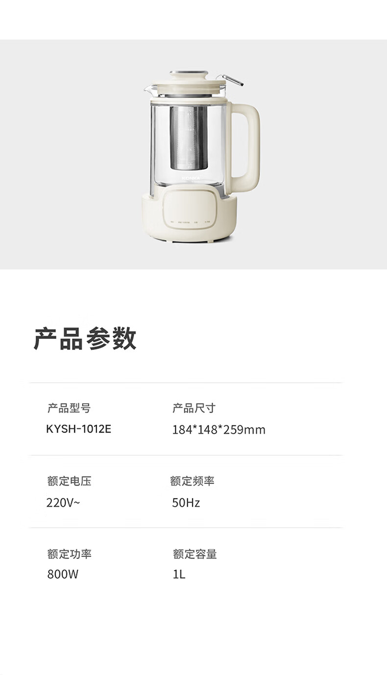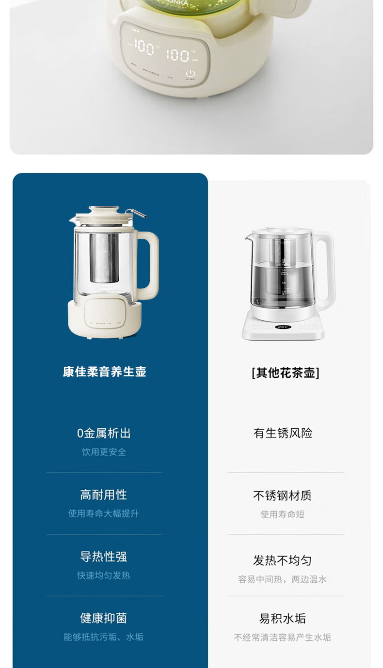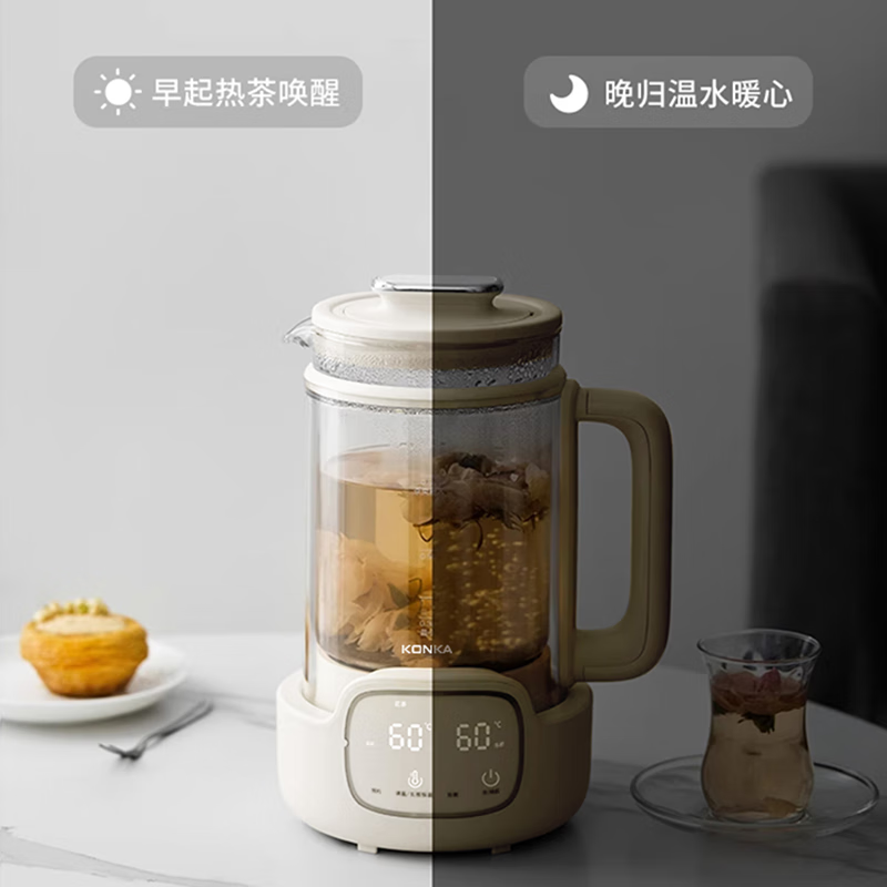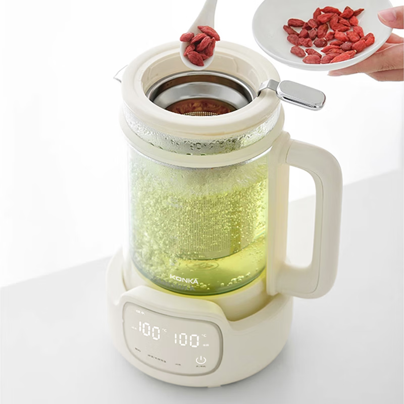 配置清单:1、DHM双层真空结构,PC+高硼硅玻璃养生壶,静音、防烫、耐摔捏捏小花挂件,精致可爱,轻松解压 2、钛金属发热盘,健康,不易生锈,没有有害物质析出 3、35-95°C恒温,72小时保温 4、双盖设计,中途加料,免烫伤 5、滤网小提手,轻松提拿
