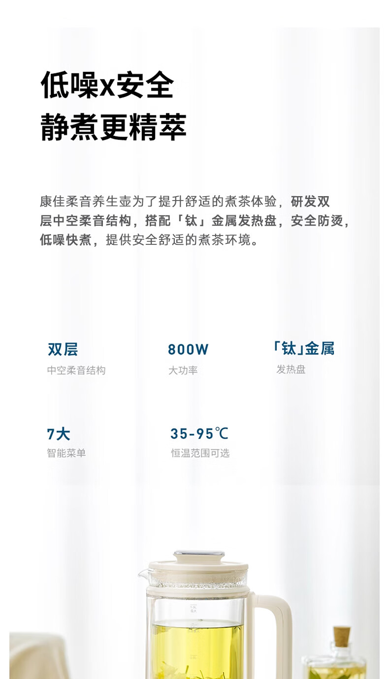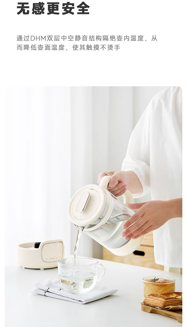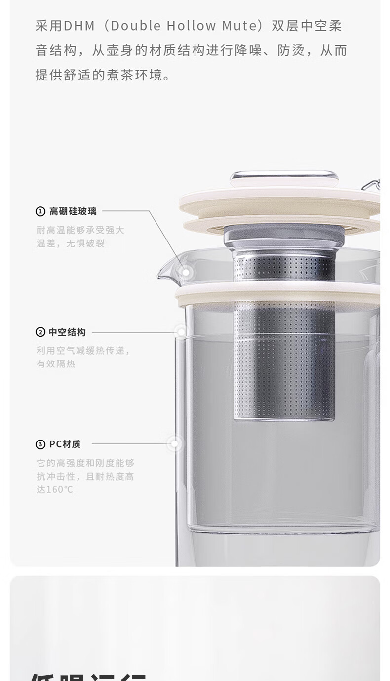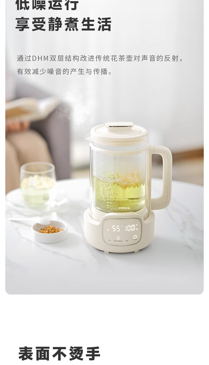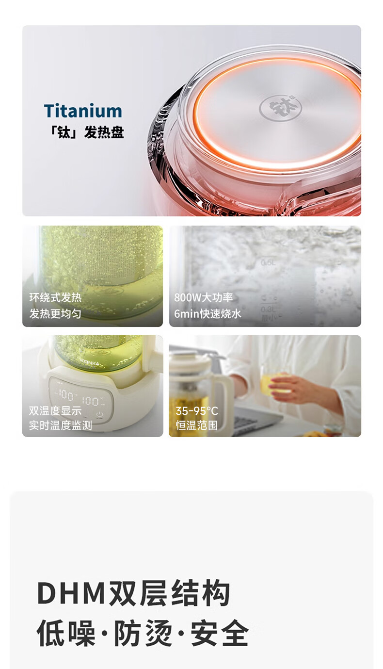 DHM双层真空结构,PC+高硼硅玻璃养生壶,静音;钛金属发热盘,健康,不易生锈,没有有害物质析出;35-95°C恒温,72小时保温