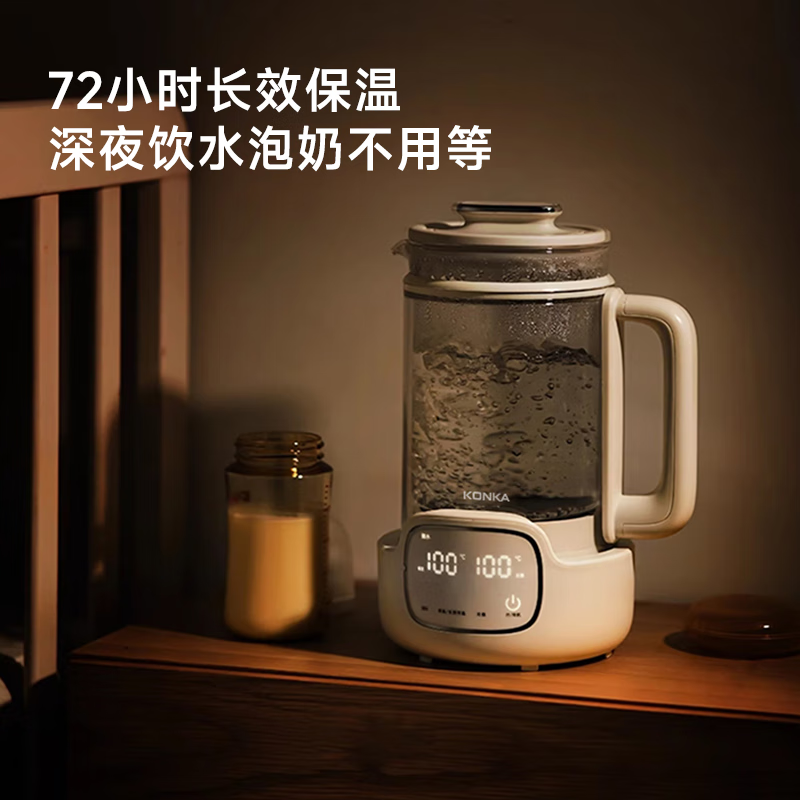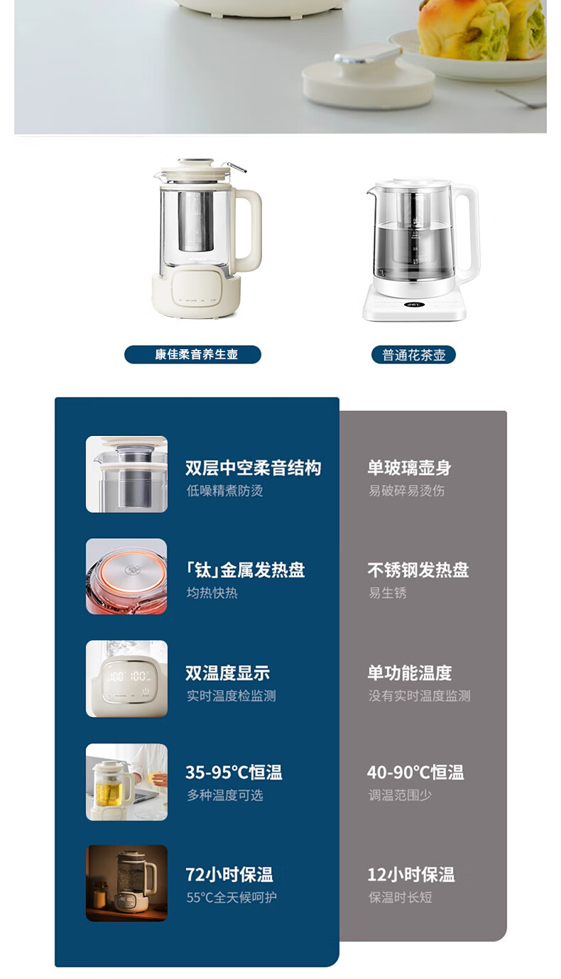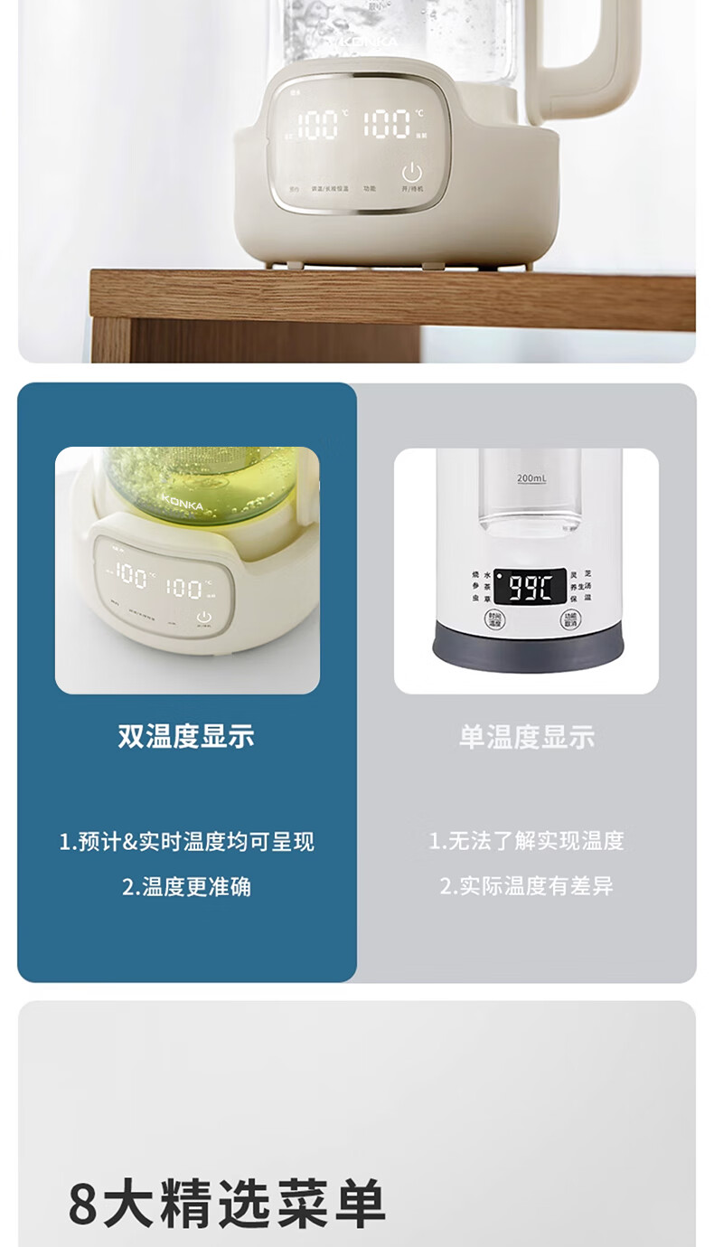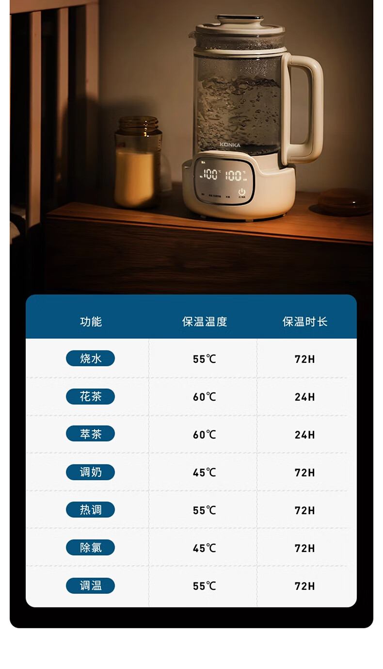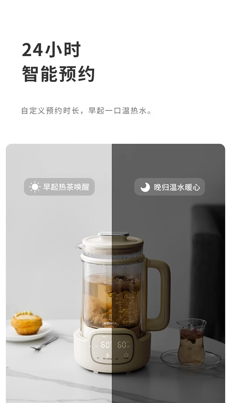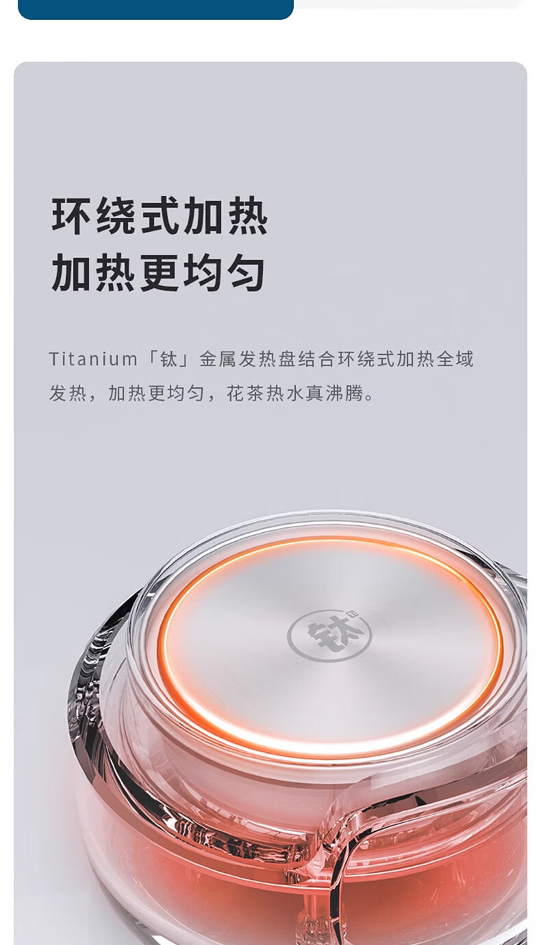 DHM双层真空结构,PC+高硼硅玻璃养生壶,静音;钛金属发热盘,健康,不易生锈,没有有害物质析出;35-95°C恒温,72小时保温