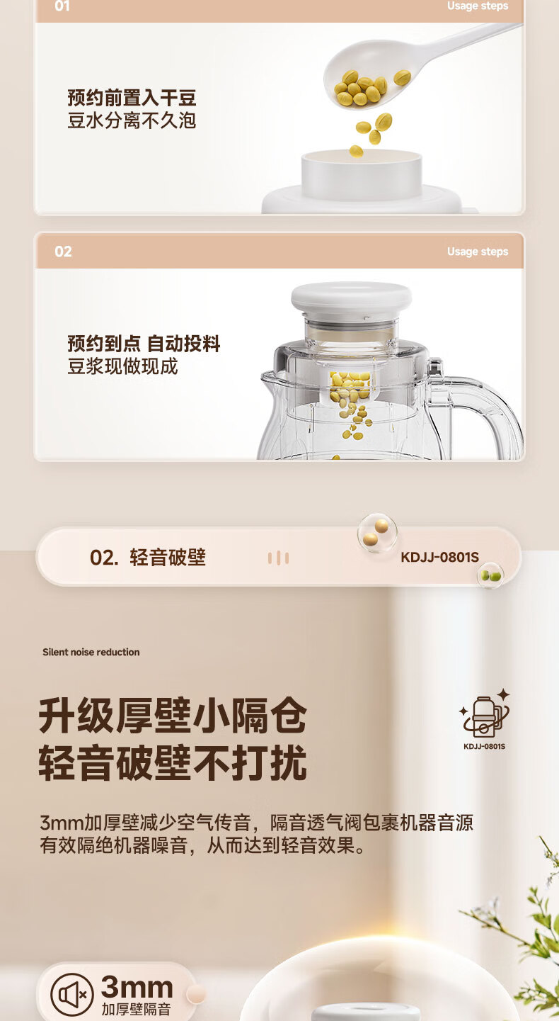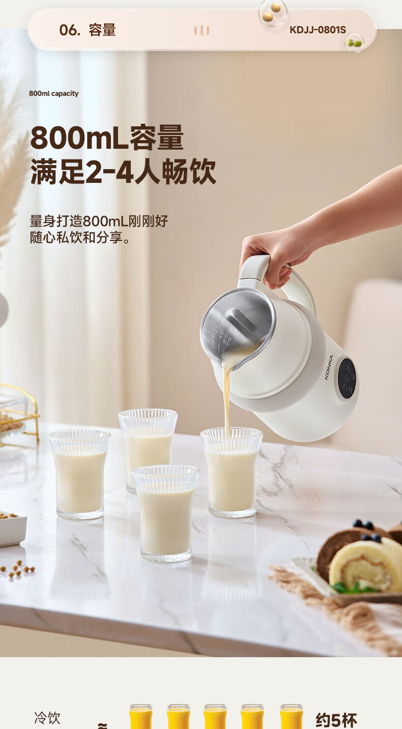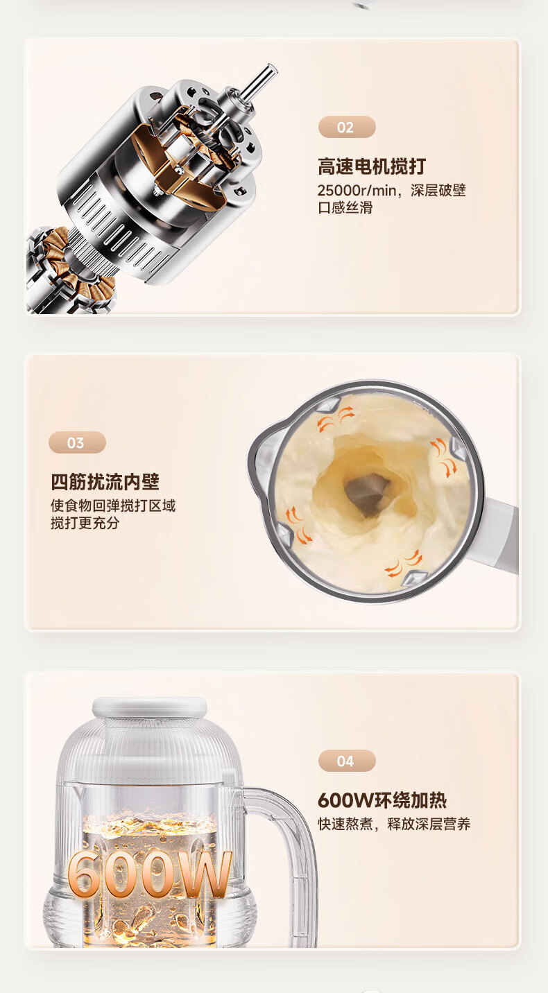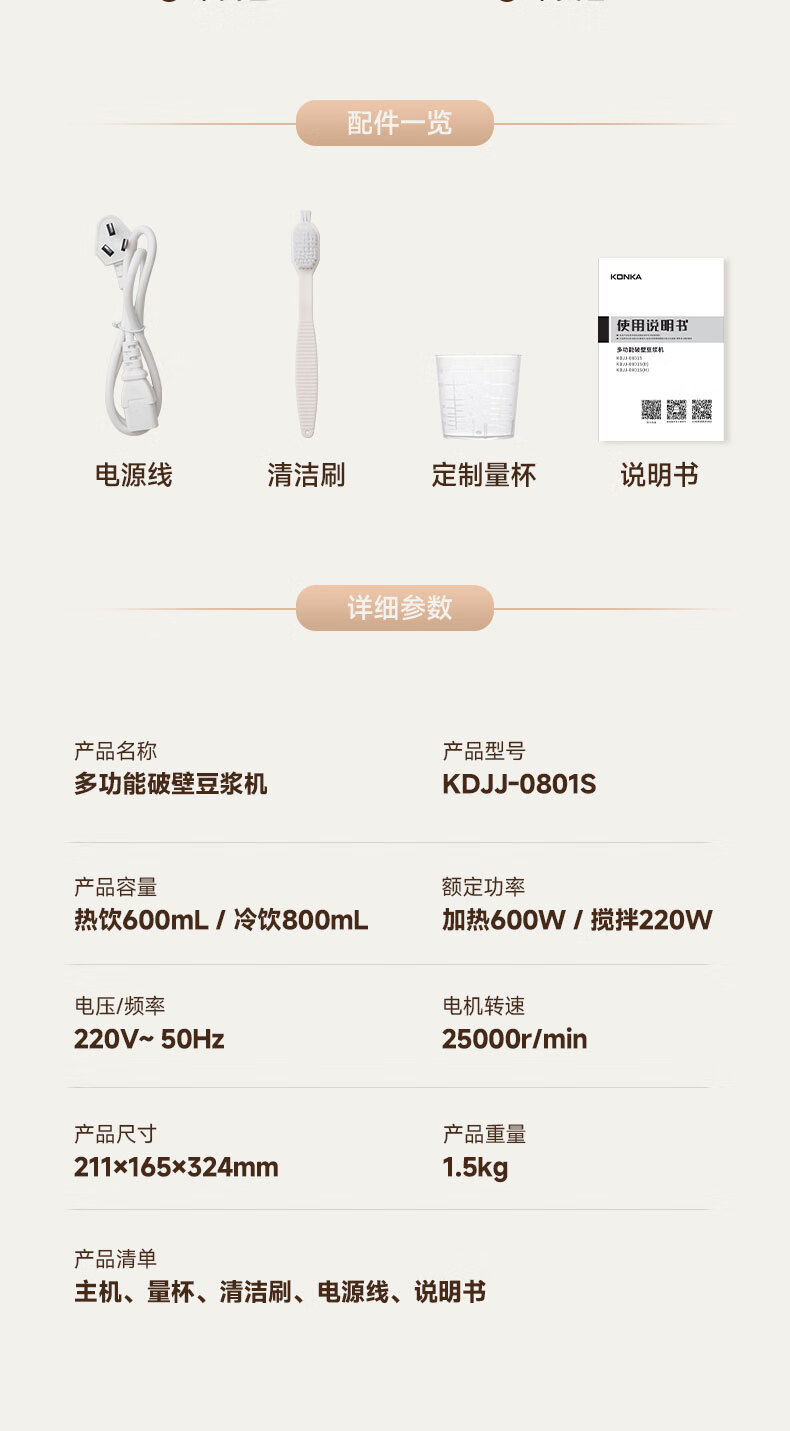 配置清单:额定功率:600W(加热)、280W(搅拌) 容量:冷饮0.8L、热饮0.6L