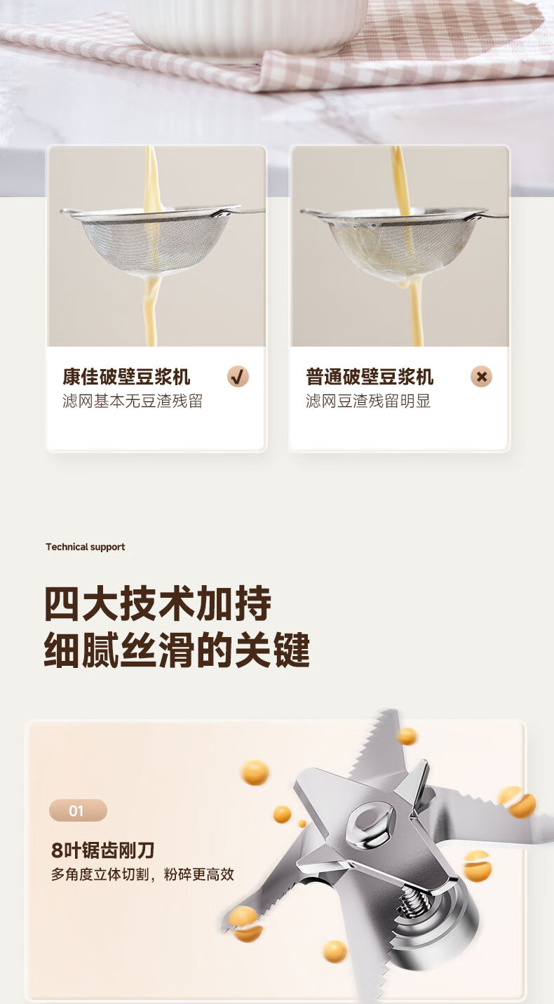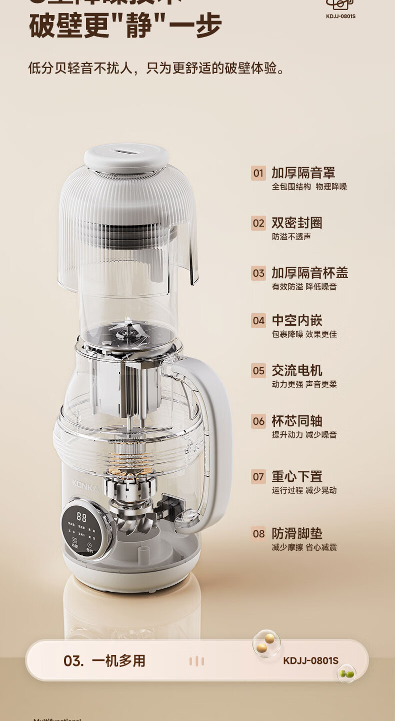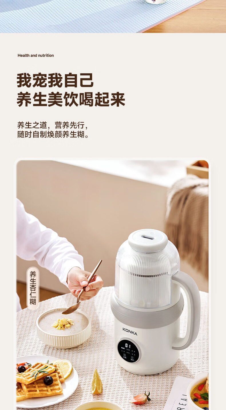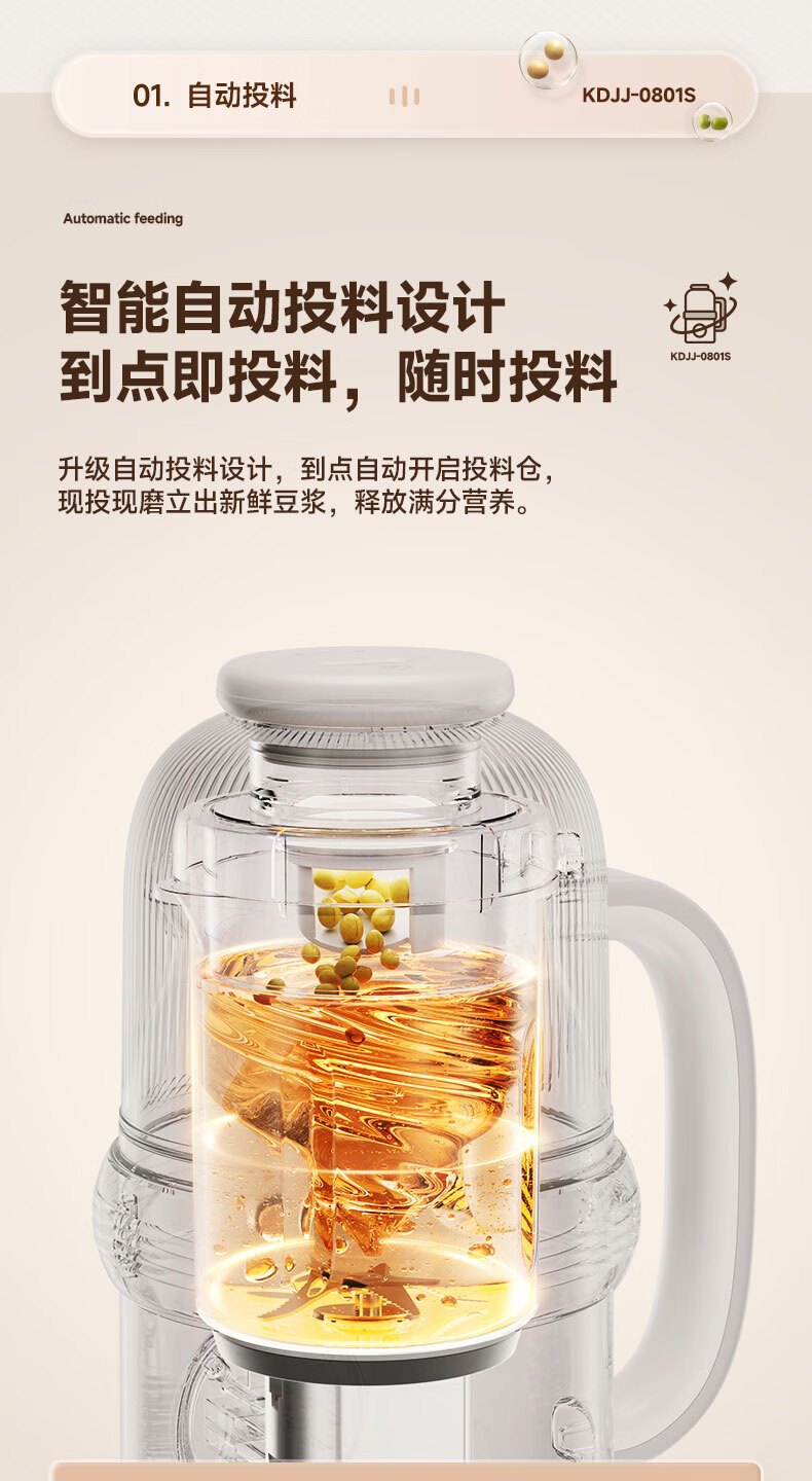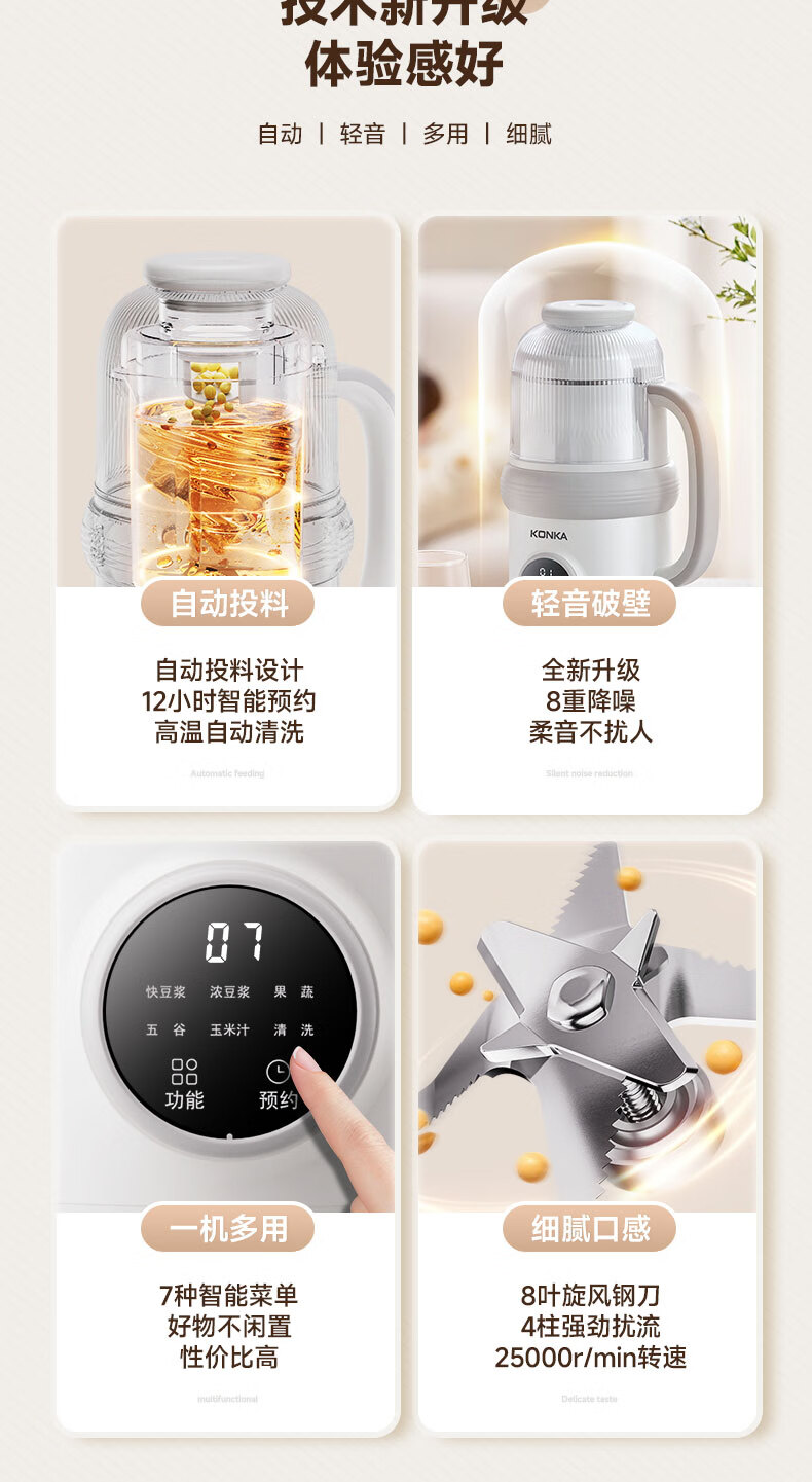 7大功能自由切换,冷热双饮,一机多用,自动投料设计;2500r/min转速粉碎食材好吸收;LED高清显示屏,工作状态一目了然,断电记忆功能,