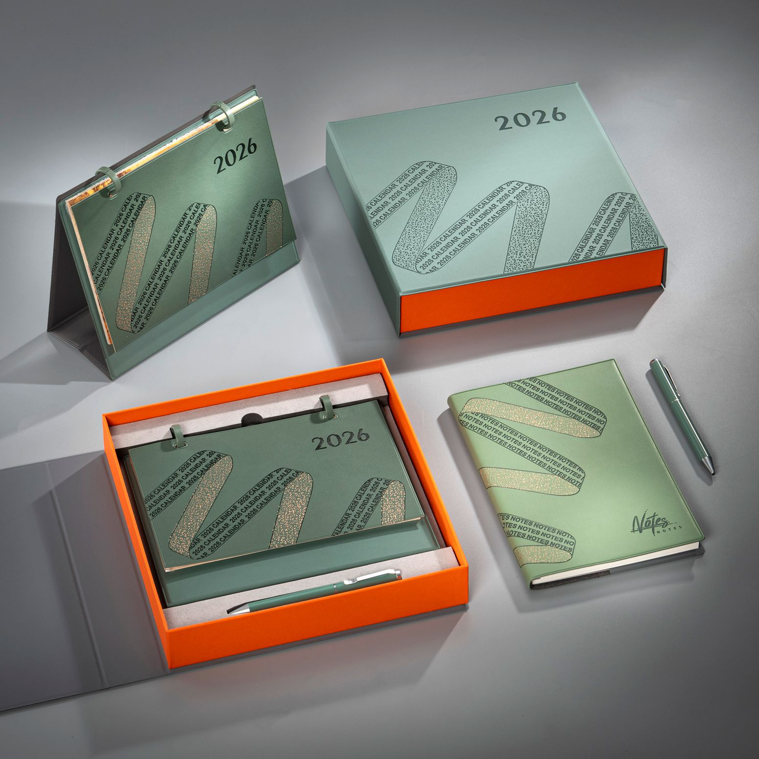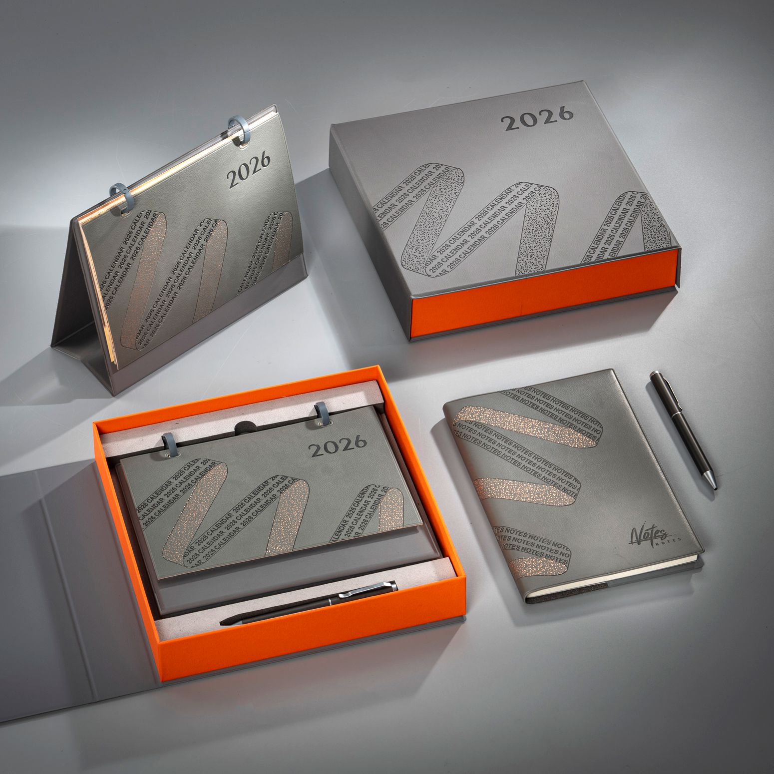 金属烤漆台历环、12张内页(内容有可书写记录;月计划)、皮质台历架、;皮质封面(可按要求定制内容)、;金属中性笔、笔记本、皮质封面翻盖礼盒。