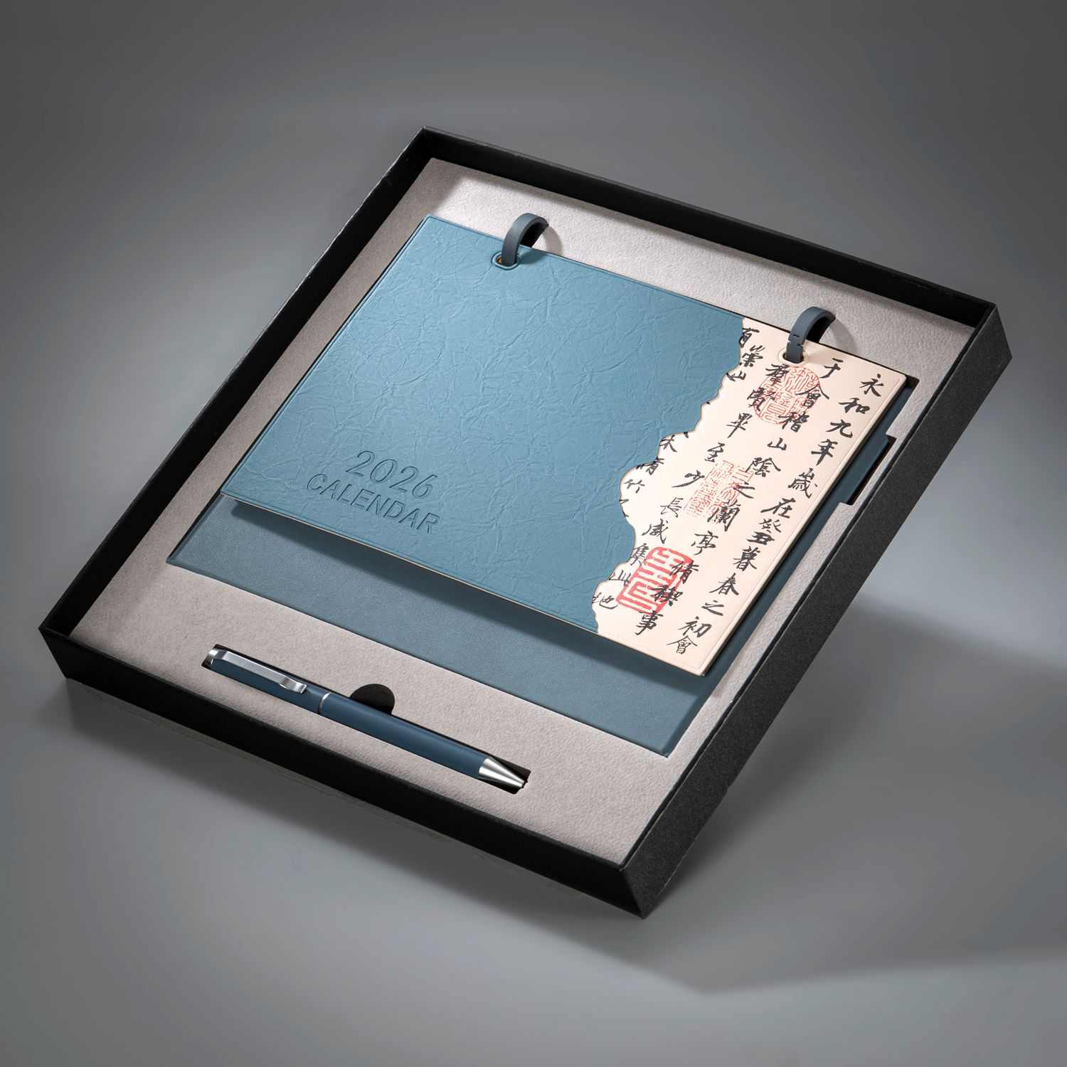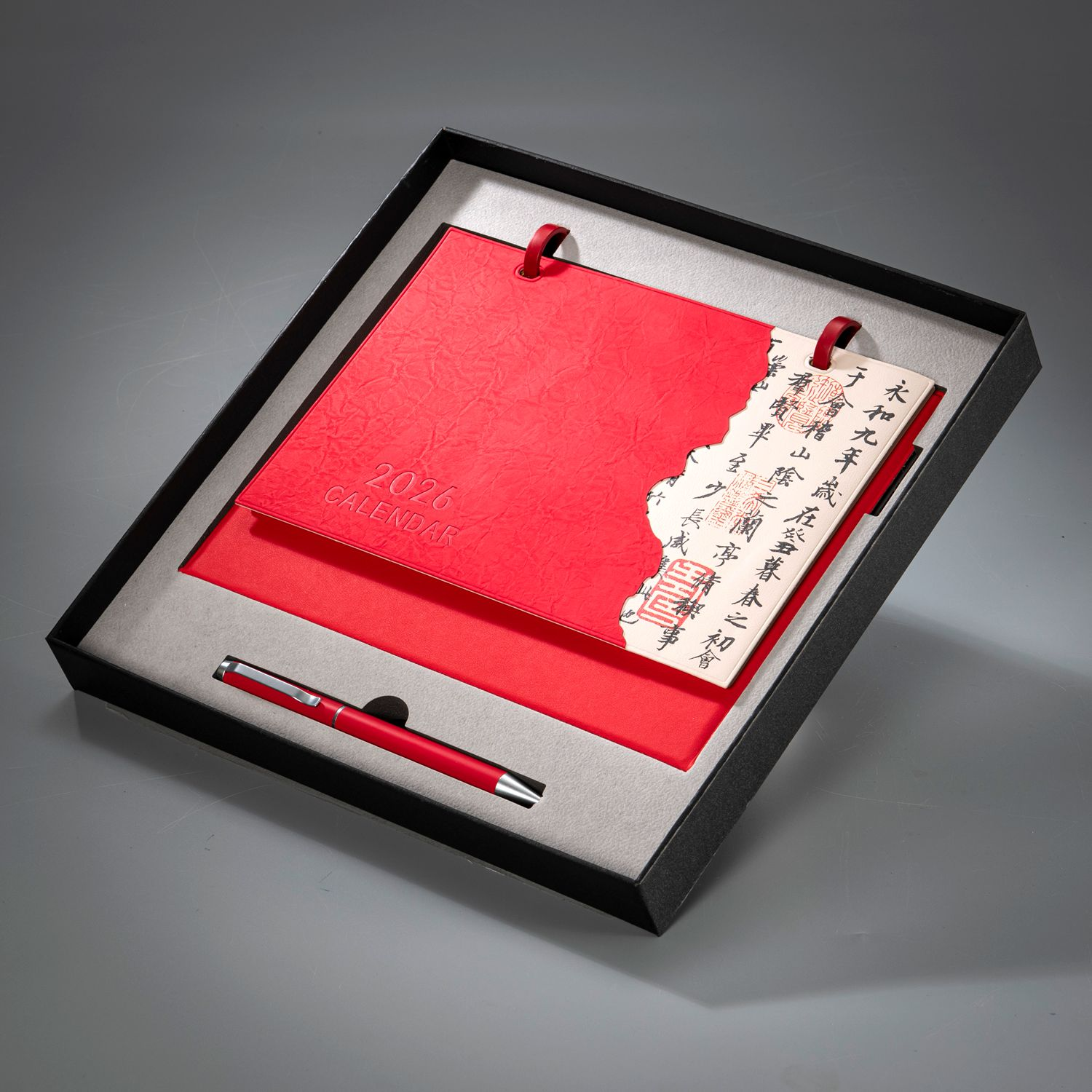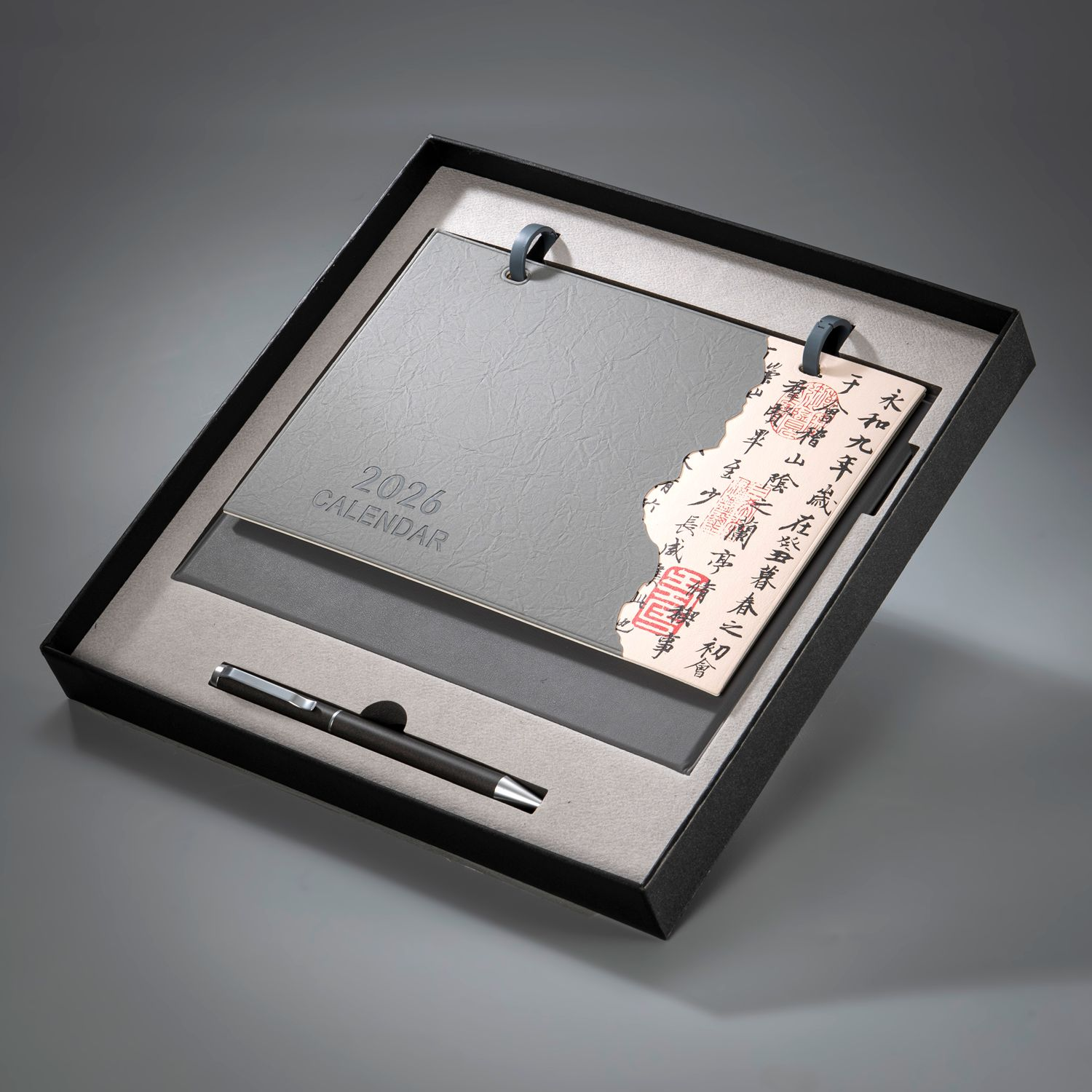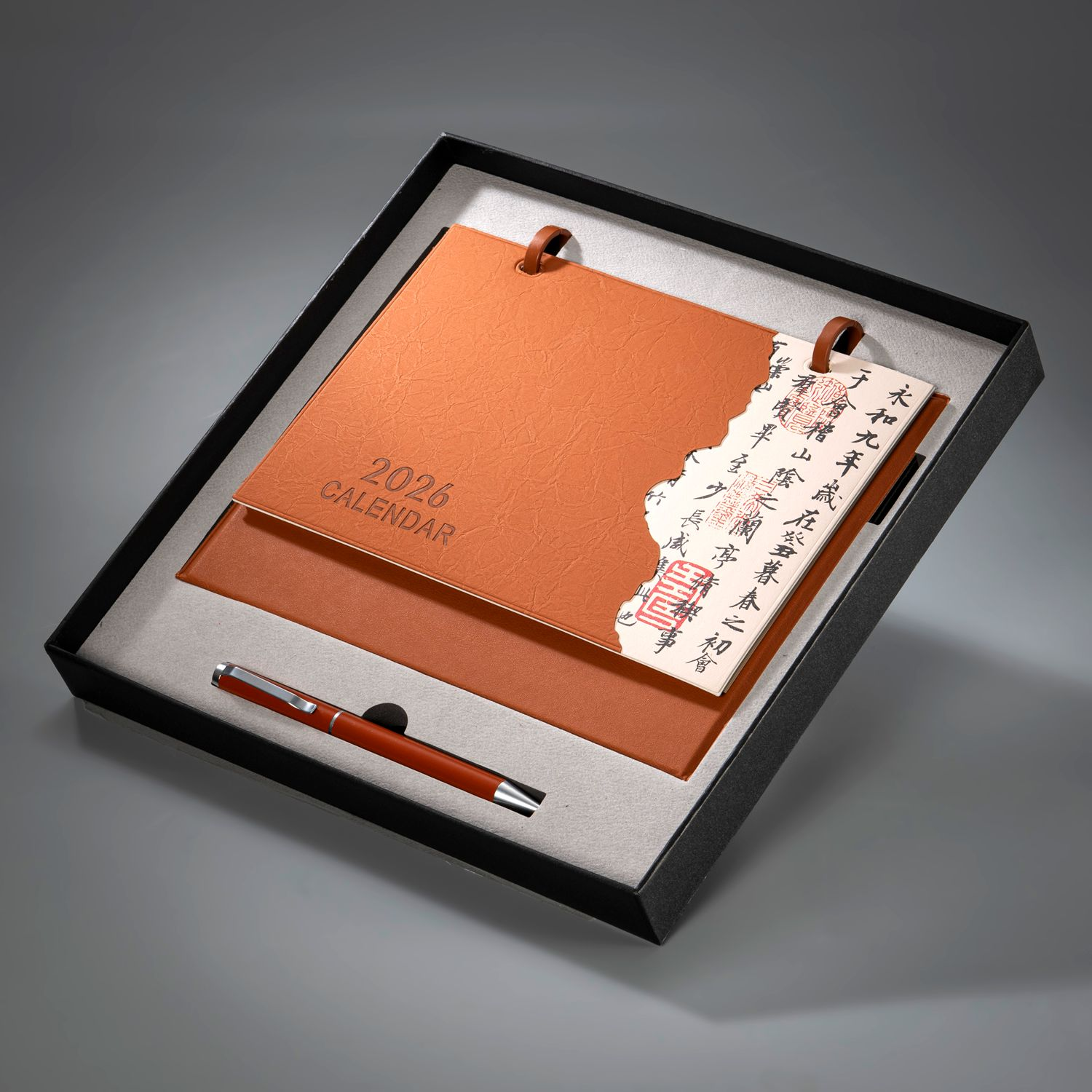 金属烤漆台历环、;12张内页(内容有可书写记录月计划);皮质台历架、皮质封面(可按要求定制内容);金属中性笔、天地盖礼盒。