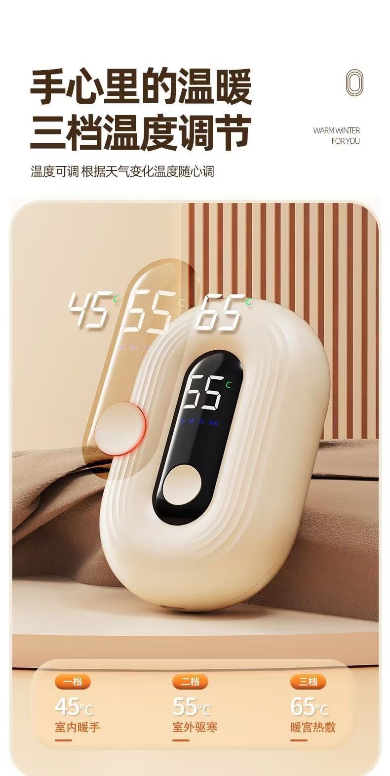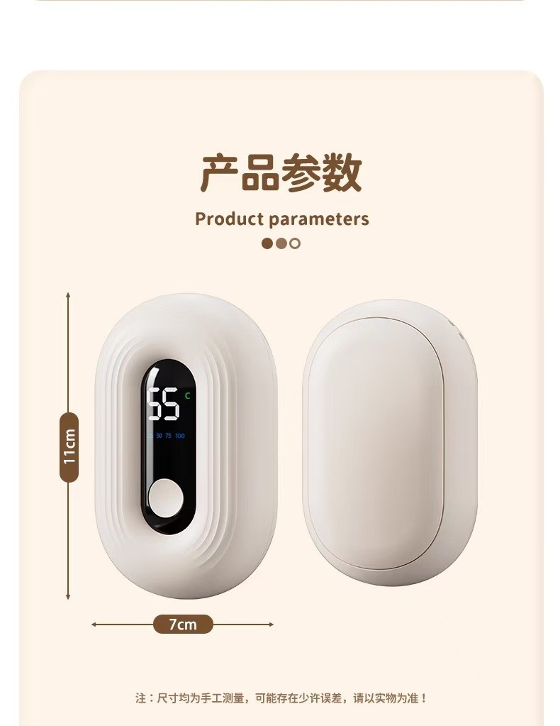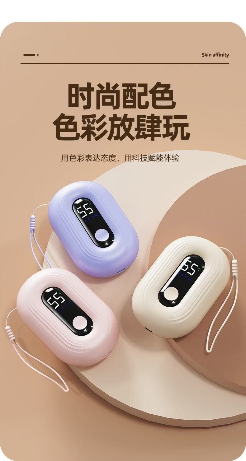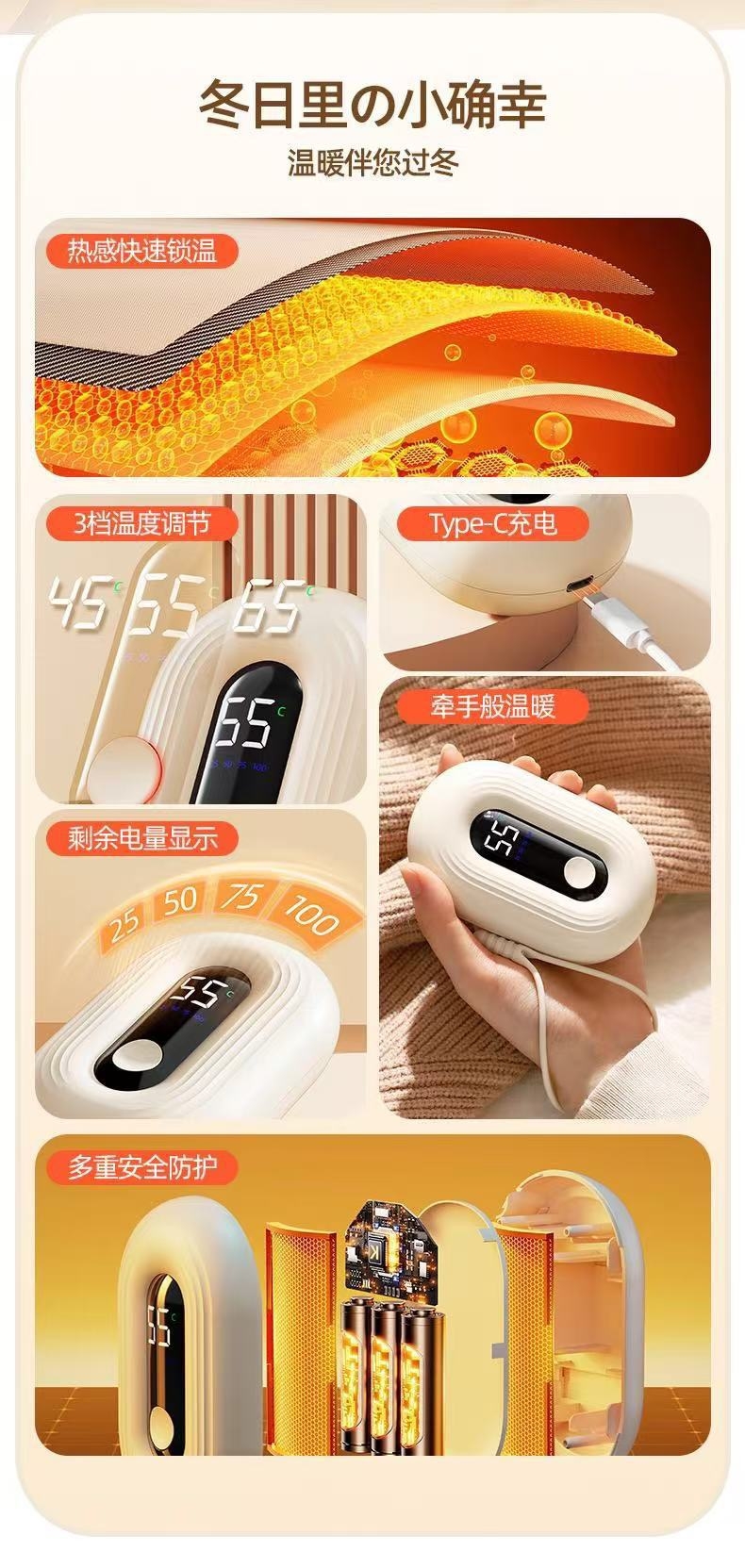 小巧便携随身掌握温暖;快速发热亲肤暖手三挡温度大屏显示屏;智能控温搭配自动过热保护元件