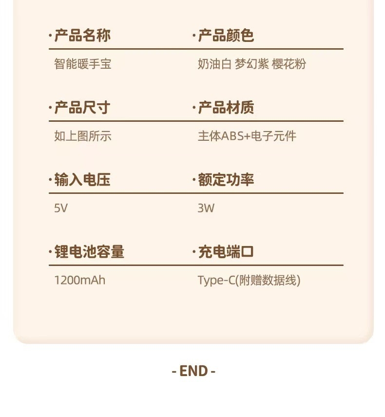 产品标配:暖手宝+充电线+说明书+精美彩盒