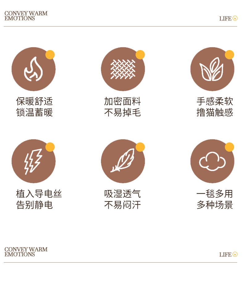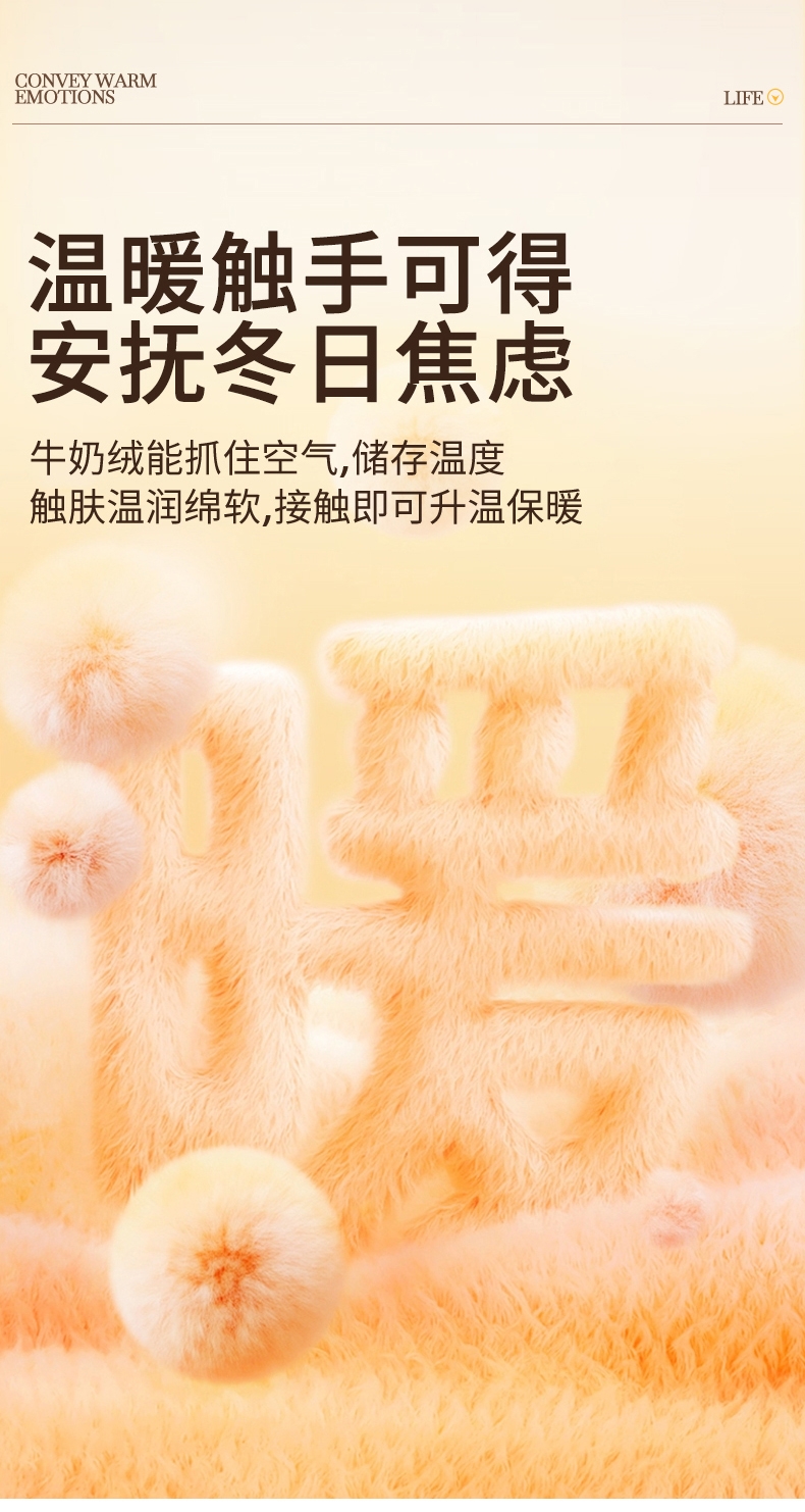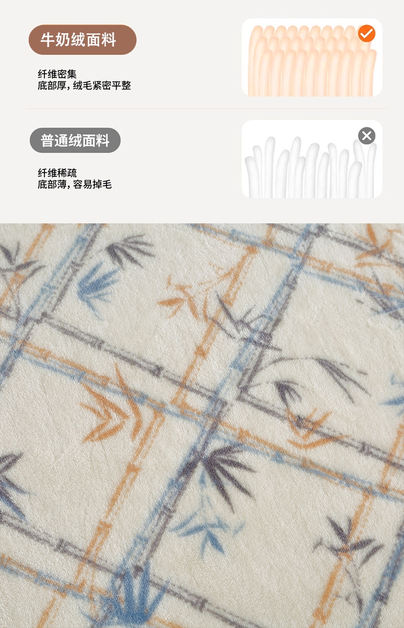 表层绒毛细密软糯,触感舒适;牛奶绒面料纤维较小密度高,表面平滑细密;精致的包边工艺,做工精细