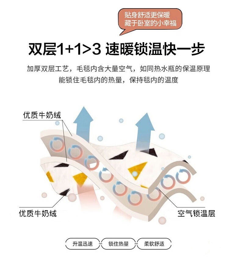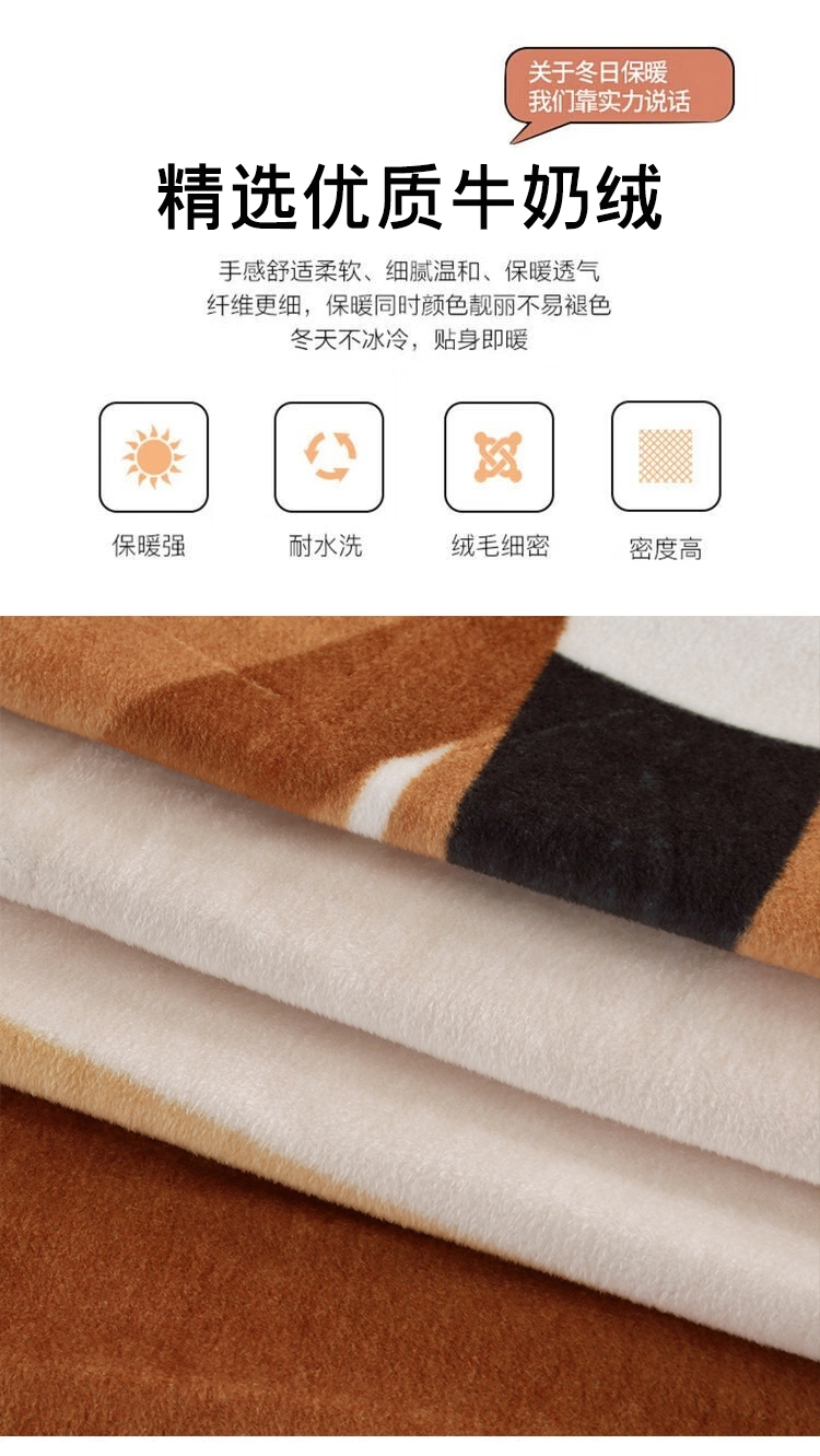 采用超细牛奶绒面料,具有良好的排湿透气性;绒毛纤长,手感柔软细腻,保暖性;不易脱线,牢固耐用