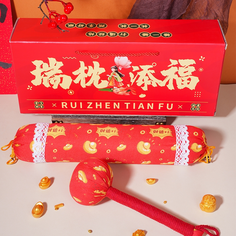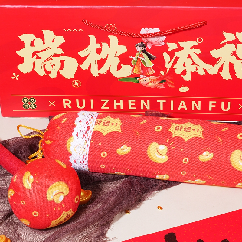 产品主题瑞枕添福,送祥瑞,送福气、送财运。;定制中国红金元宝面料,专属财运+1的美好祝福。;内有乾坤,每个艾草锤/艾草枕均填充多个小金元宝。