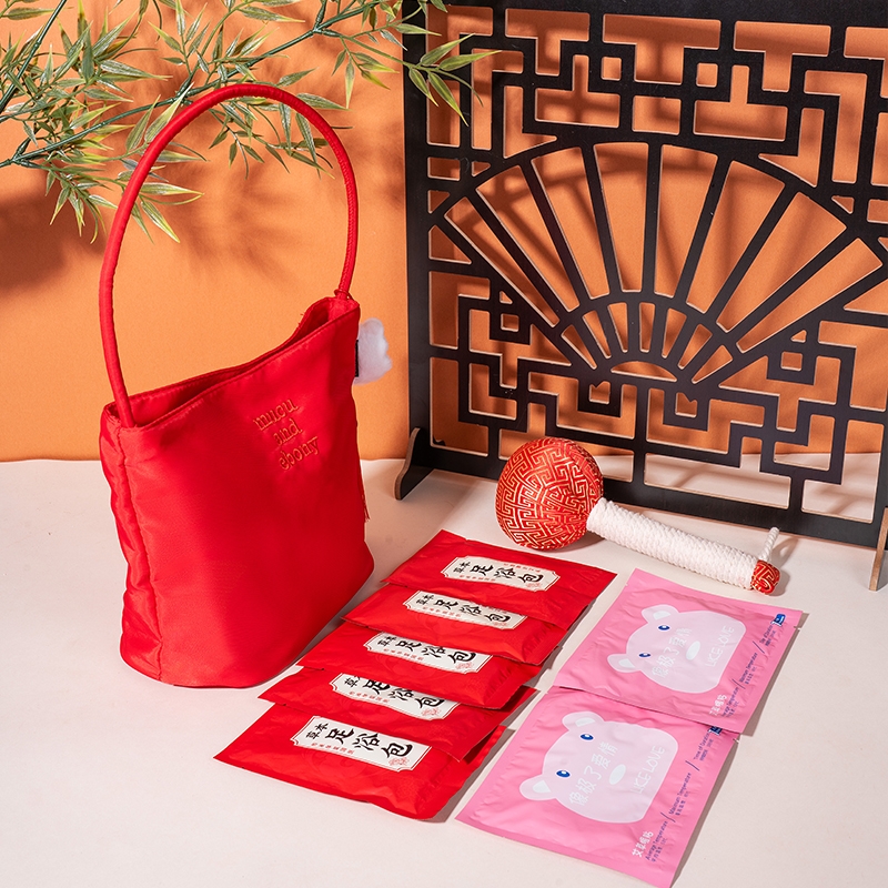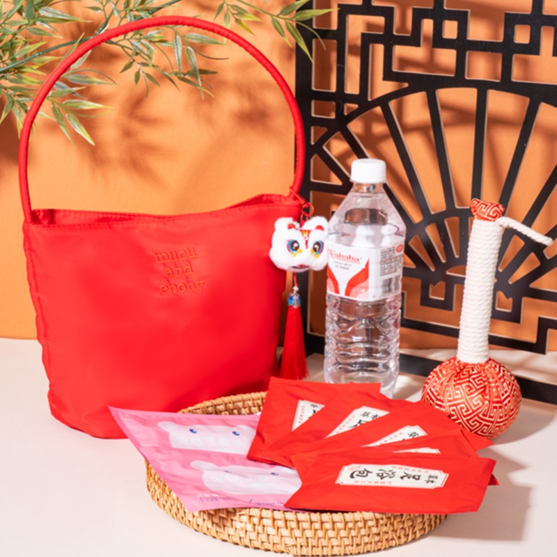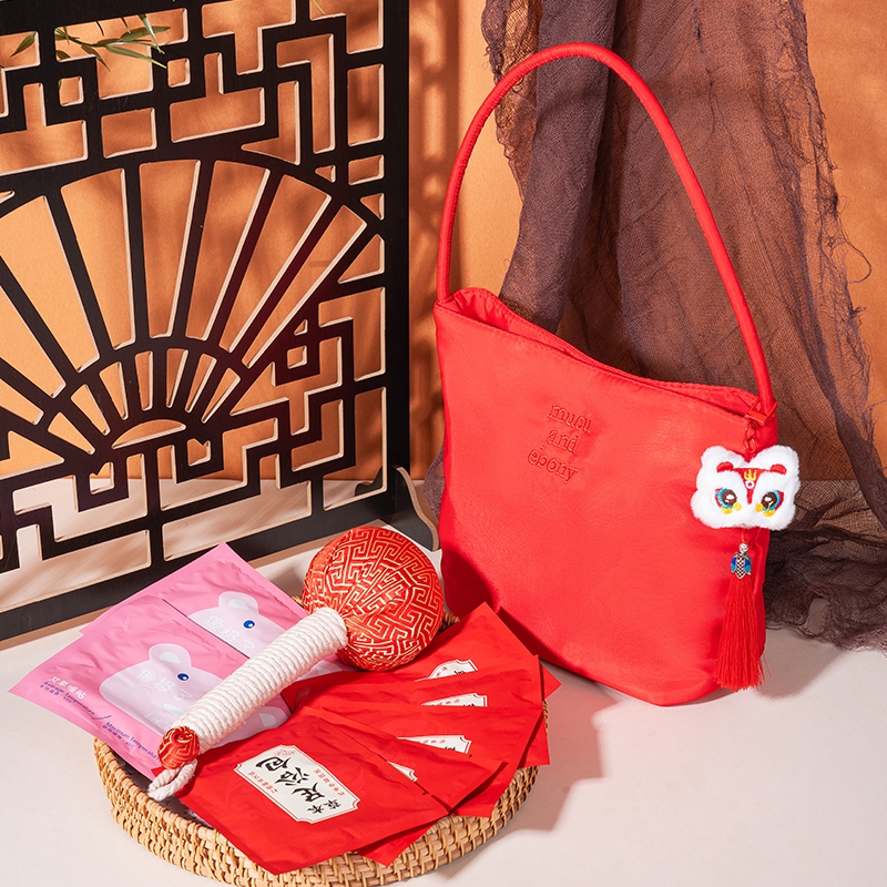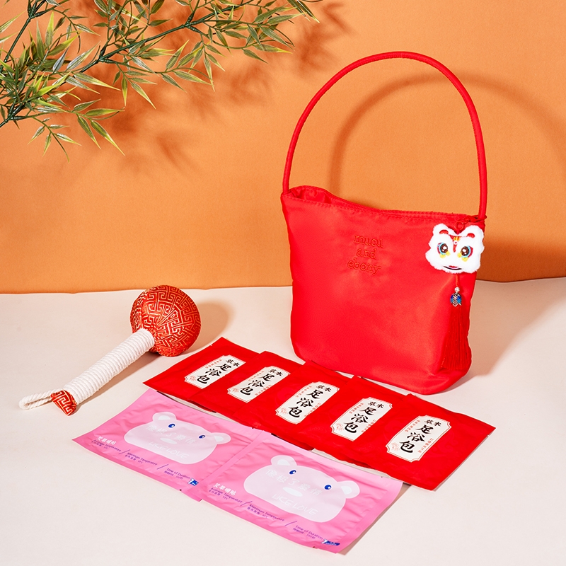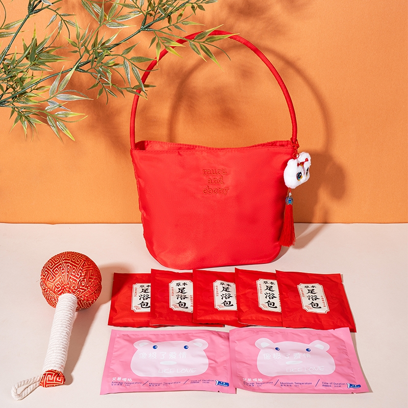 产品配置:中国红时尚托特手提包*1 国潮醒狮流苏挂饰*1 草本足浴包20g*5 小熊暖贴*2 金丝缎面红色艾草锤20cm*1
