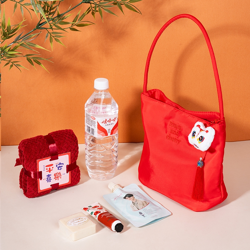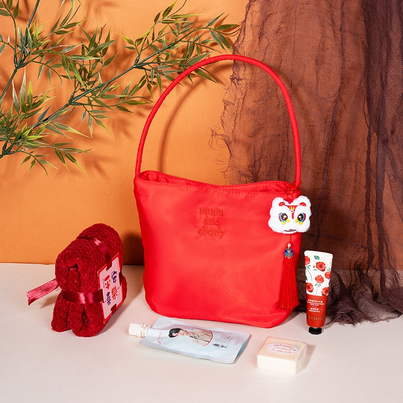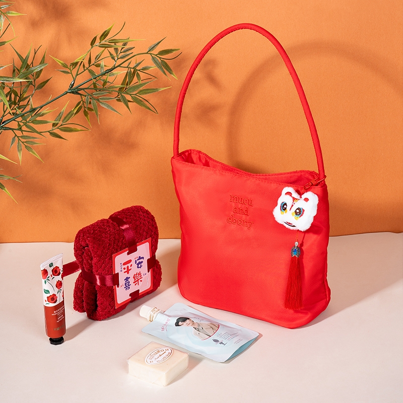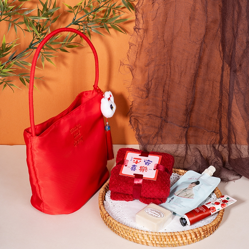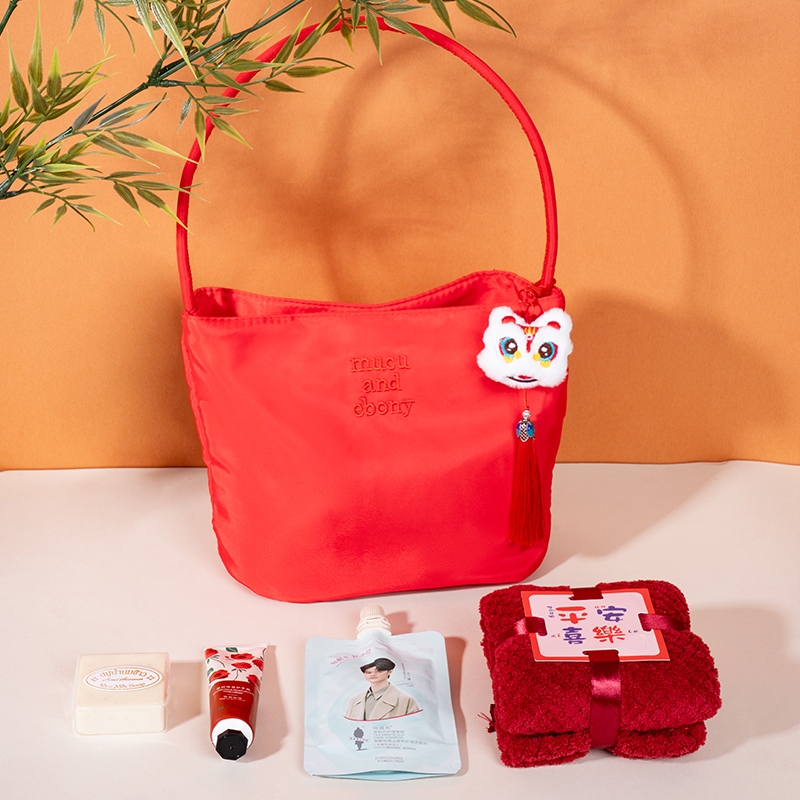 产品配置:中国红时尚托特手提包*1 国潮醒狮流苏挂饰*1 国潮红平安喜乐毛巾*1 罗丝琳夜莺玫瑰护手霜30g*1 阿道夫洗发水50ml*1 泰国大米皂60g*1