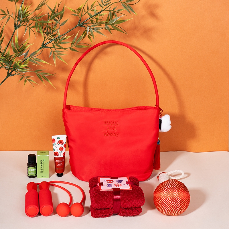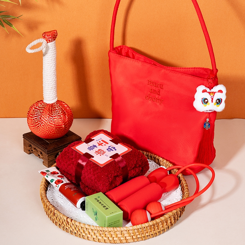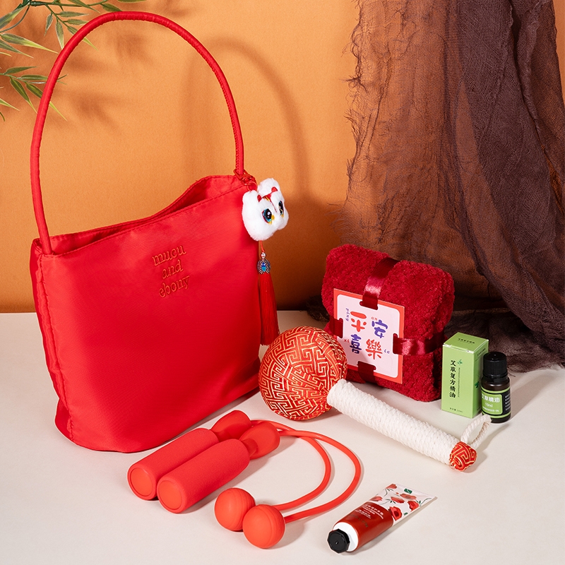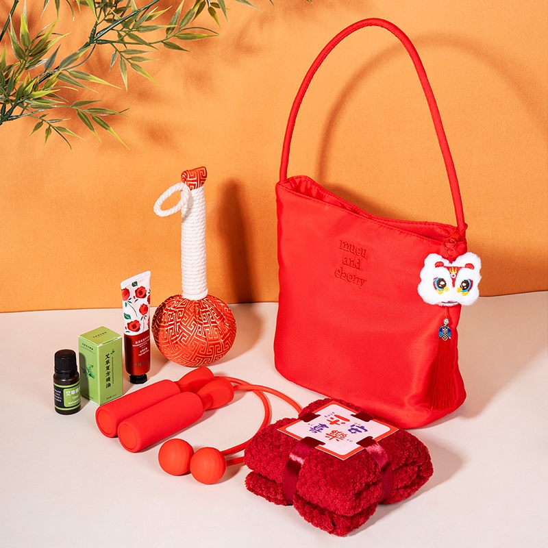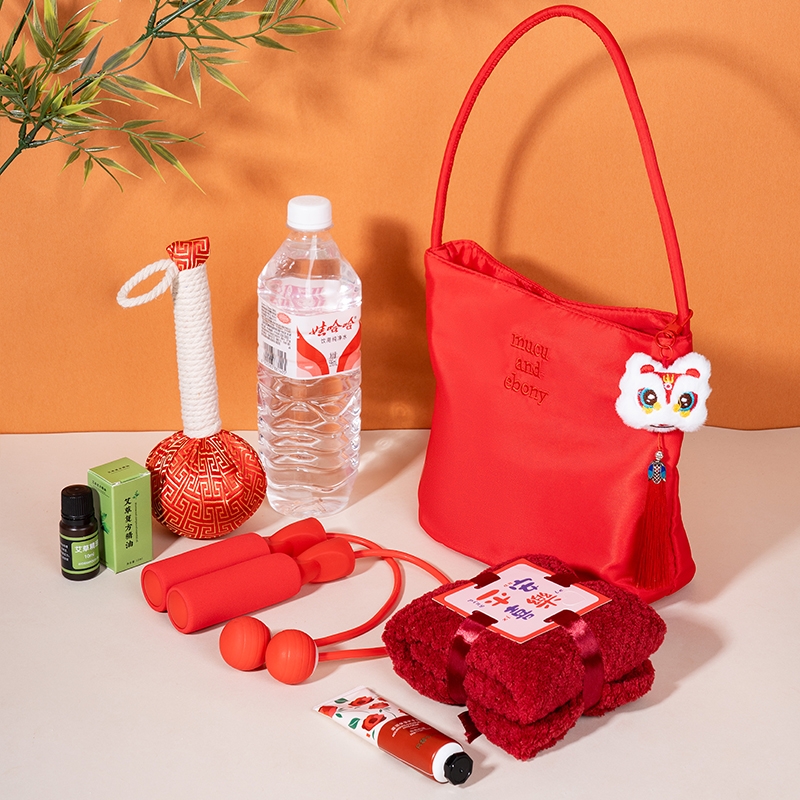 产品配置:中国红时尚托特手提包*1 国潮醒狮流苏挂饰*1 国潮红平安喜乐毛巾*1 罗丝琳夜莺玫瑰护手霜30g*1 艾草精油10ml*1 金丝缎面红色艾草锤20cm*1 中国红运动跳绳*1