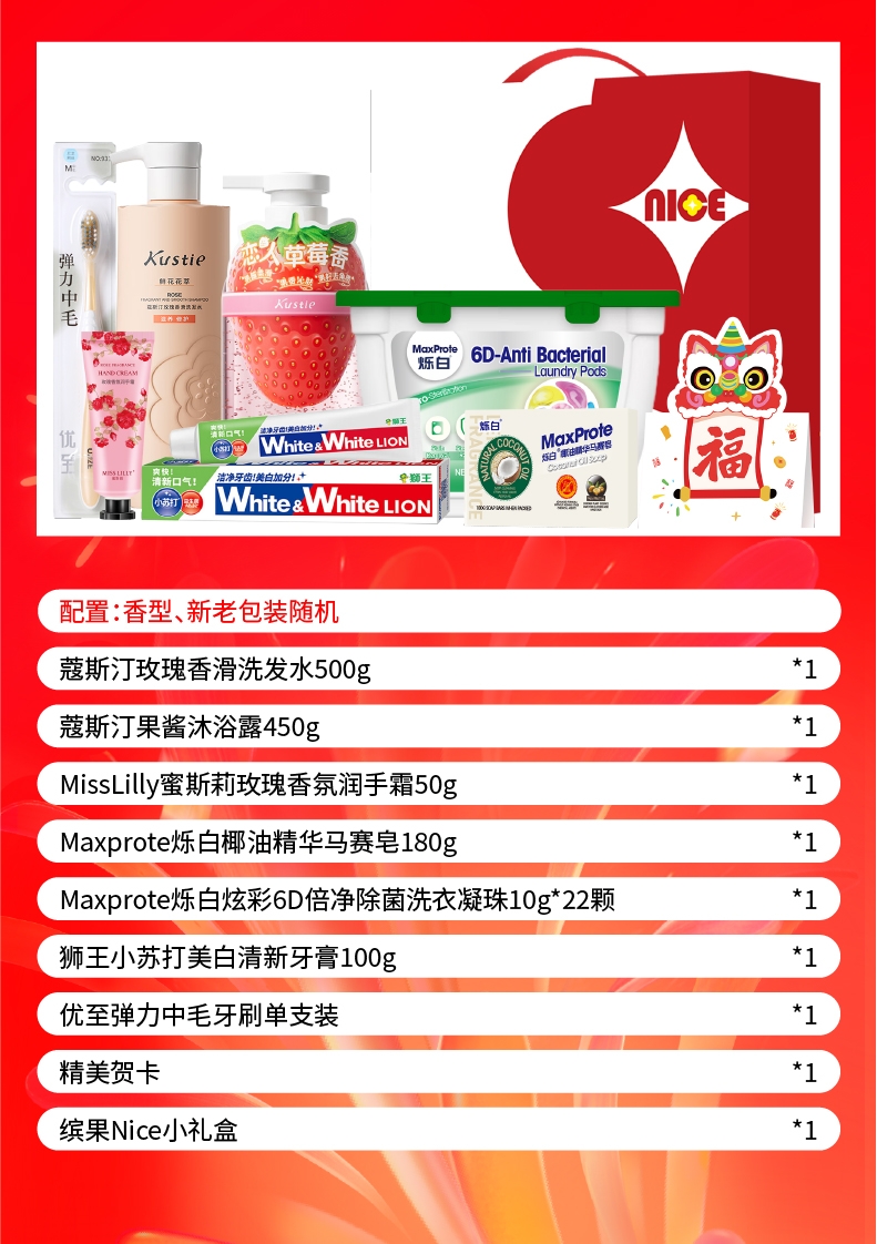 配置清单:蔻斯汀玫瑰香滑洗发水500g*1 蔻斯汀果酱沐浴露450g*1 MissLilly蜜斯莉玫瑰香氛润手霜50g*1 Maxprote烁白椰油精华马赛皂180g*1 Maxprote烁白炫彩6D倍净除菌洗衣凝珠10g*22颗*1 狮王(Lion)小苏打美白清新牙膏100g*1 优至弹力中毛牙刷单支装*1 精美贺卡*1(量大可定制) 缤果Nice小礼盒ZS177*1