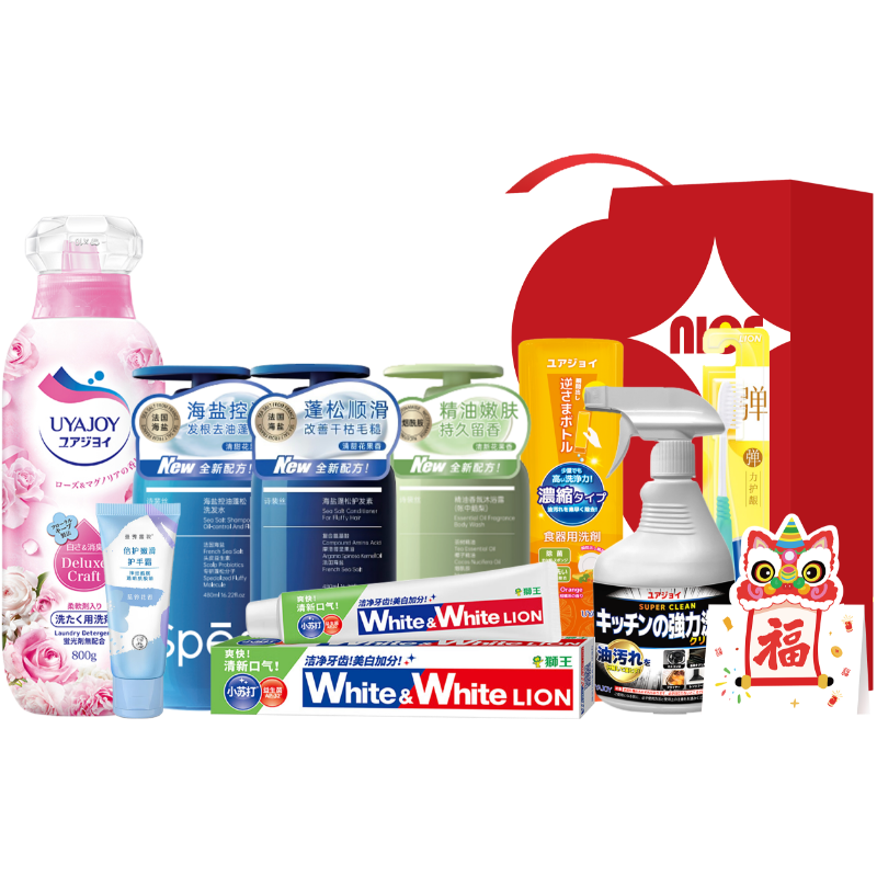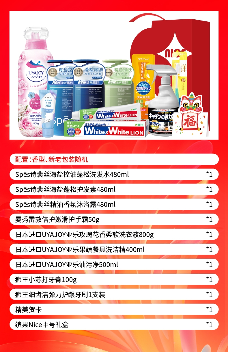 配置清单:Spēs诗裴丝海盐控油蓬松洗发水480ml*1 Spēs诗裴丝海盐蓬松护发素480ml*1 Spēs诗裴丝精油香氛沐浴露(帐中鹅梨)480ml*1 曼秀雷敦倍护嫩滑护手霜50g*1 日本进口UYAJOY亚乐玫瑰花香柔软洗衣液800g*1 日本进口UYAJOY亚乐果蔬餐具洗洁精400ml*1 日本进口UYAJOY亚乐油污净500ml*1 狮王小苏打牙膏100g*1 狮王细齿洁弹力护龈牙刷1支装*1 精美贺卡*1(量大可定制) 缤果Nice中号礼盒ZS178*1