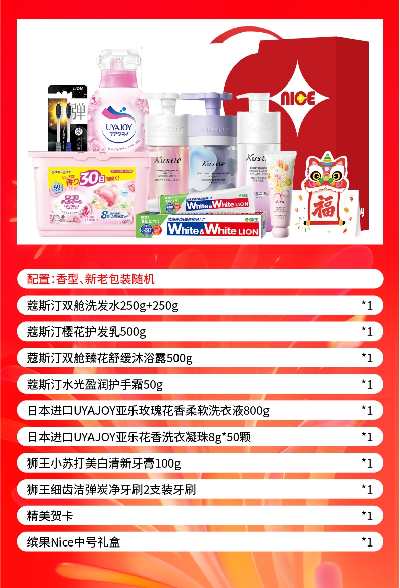配置清单:蔻斯汀双舱洗发水250g+250g*1 蔻斯汀樱花护发乳500g*1 蔻斯汀双舱臻花舒缓沐浴露500g*1 蔻斯汀水光盈润护手霜50g*1 日本进口UYAJOY亚乐玫瑰花香柔软洗衣液800g*1 日本进口UYAJOY亚乐花香洗衣凝珠8g*50颗*1 狮王(Lion)小苏打美白清新牙膏100g*1 狮王(lion)细齿洁弹炭净牙刷2支装牙刷*1 精美贺卡*1(量大可定制) 缤果Nice中号礼盒ZS178*1