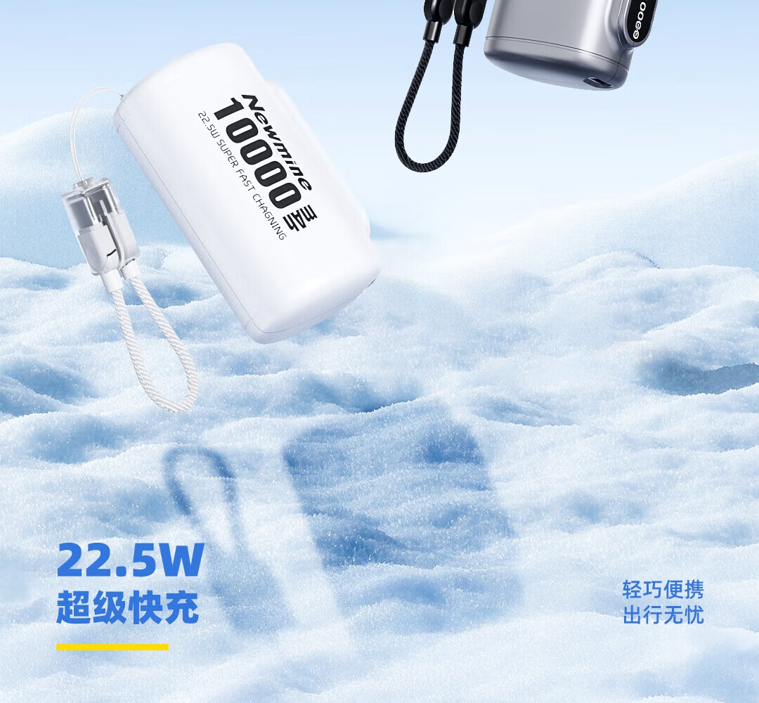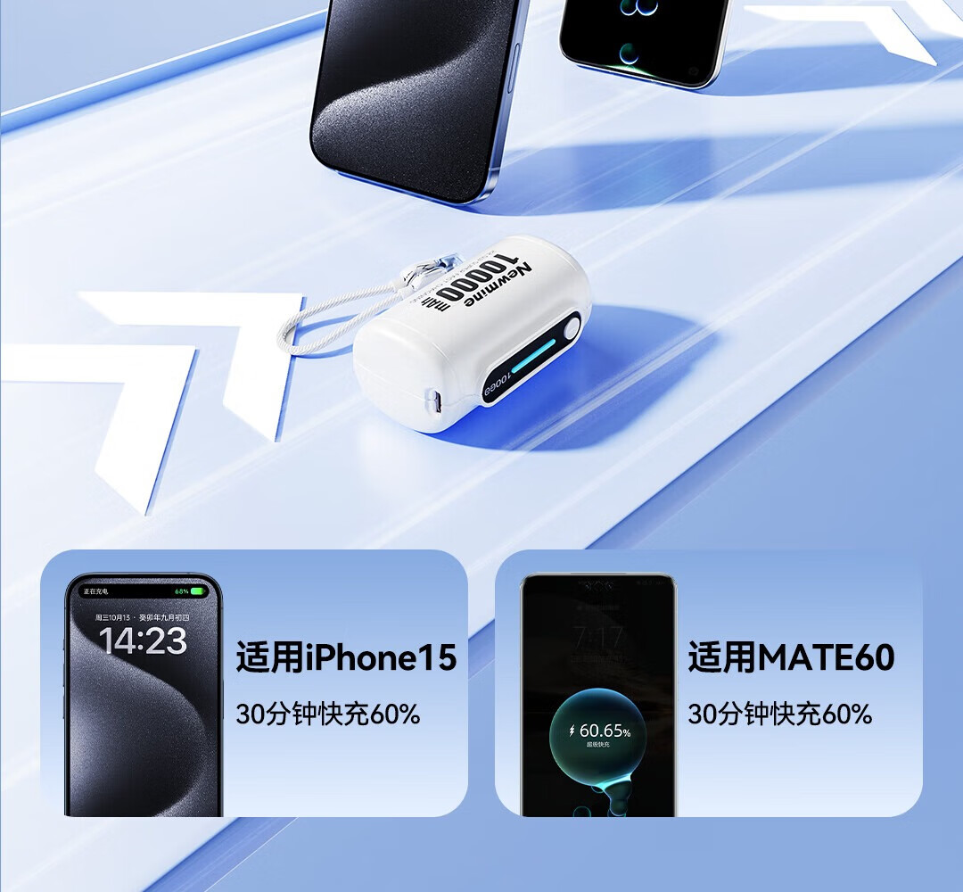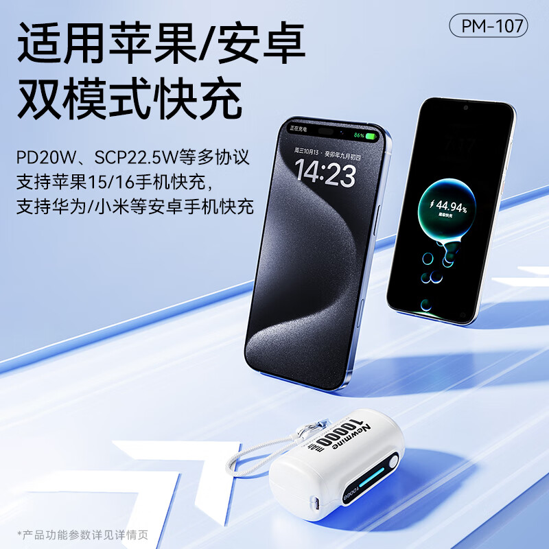 自带线,解决备线焦虑;迷你便携,小巧方便;超级快充,兼容多种手机型号