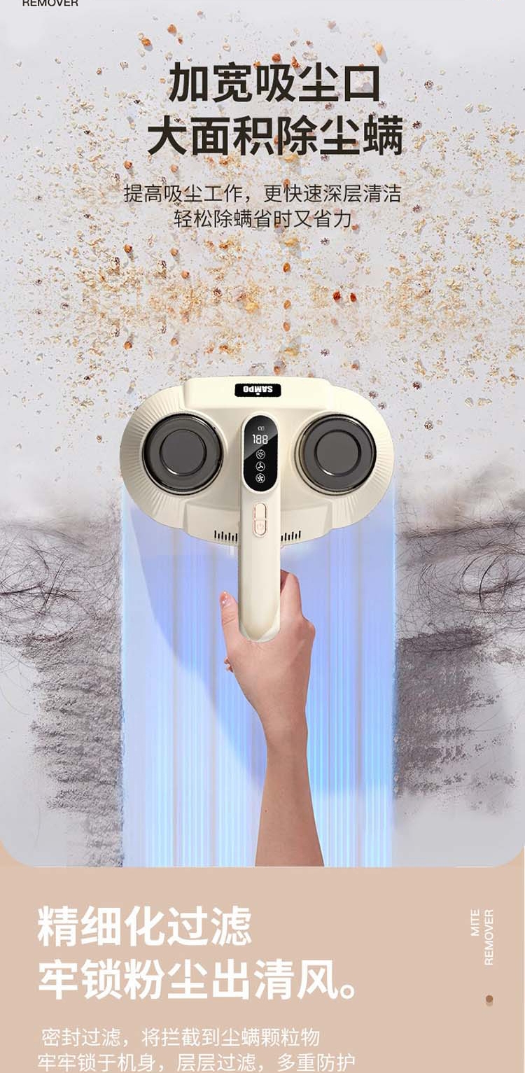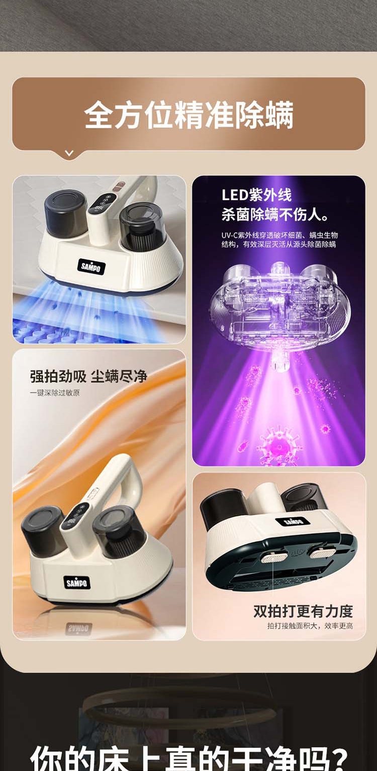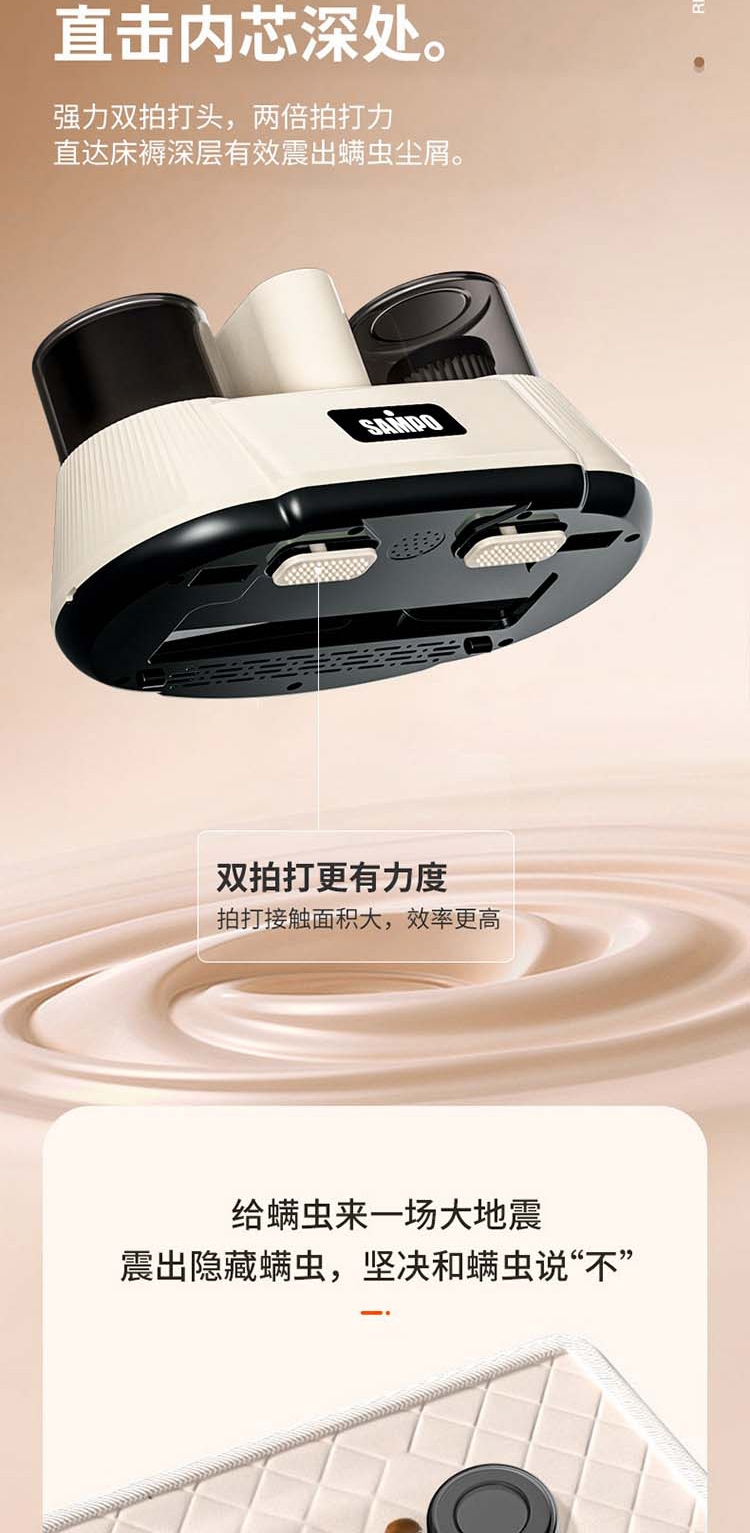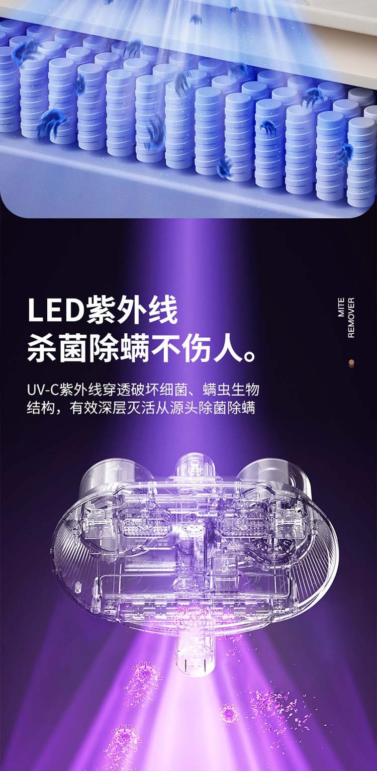 LED紫外线杀菌除螨不伤人;强拍劲吸,一键深除过敏源;频双拍打,两倍拍打力