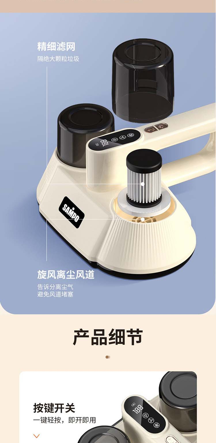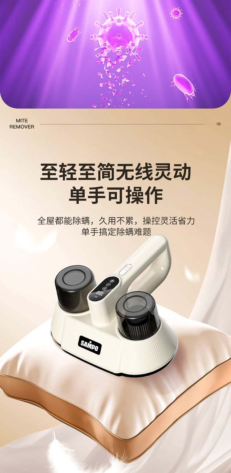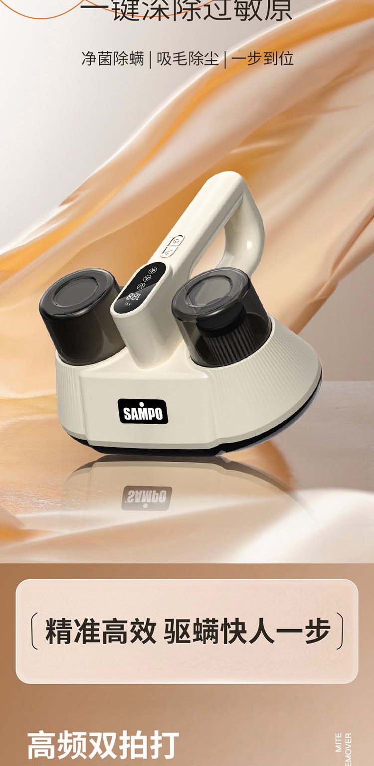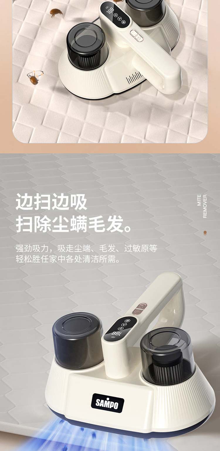 LED紫外线杀菌除螨不伤人;强拍劲吸,一键深除过敏源;频双拍打,两倍拍打力