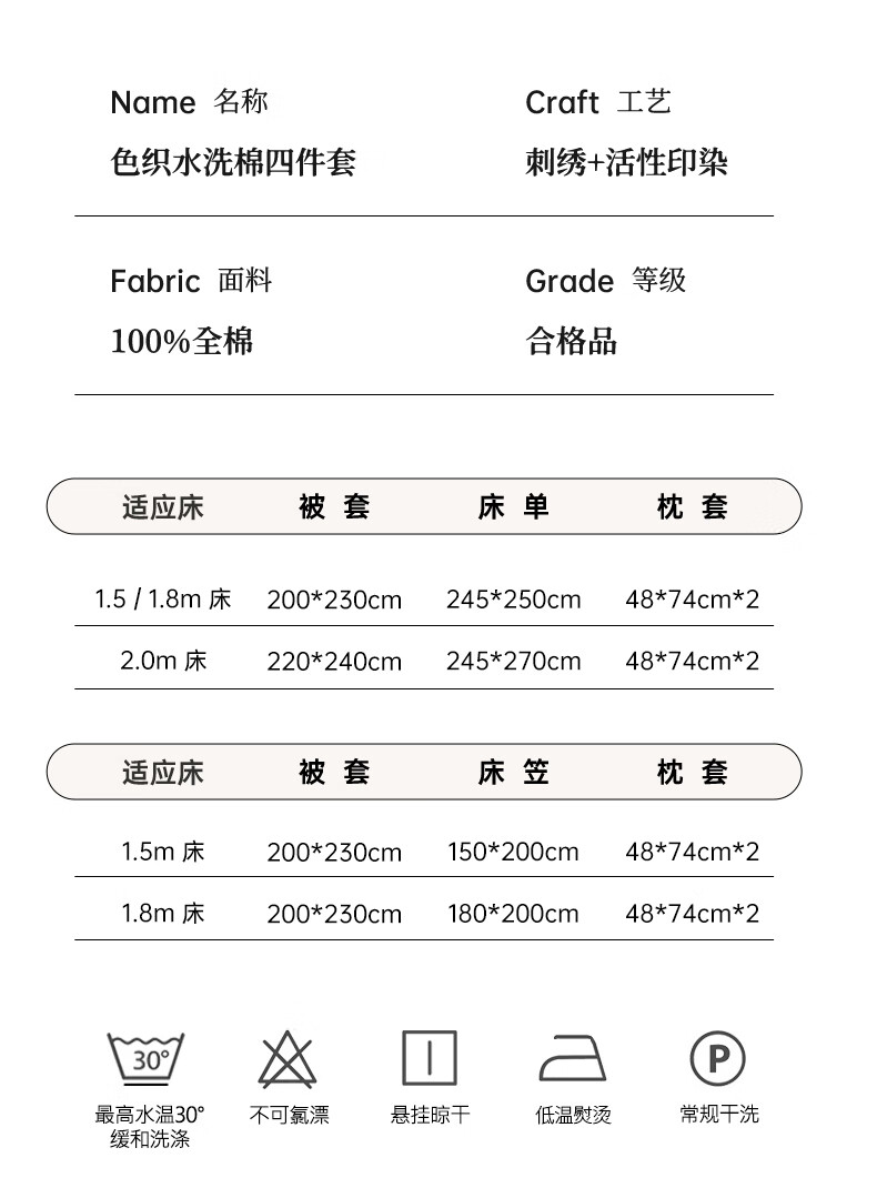 配置清单:被套*1 床单*1 枕套*2 包装*1