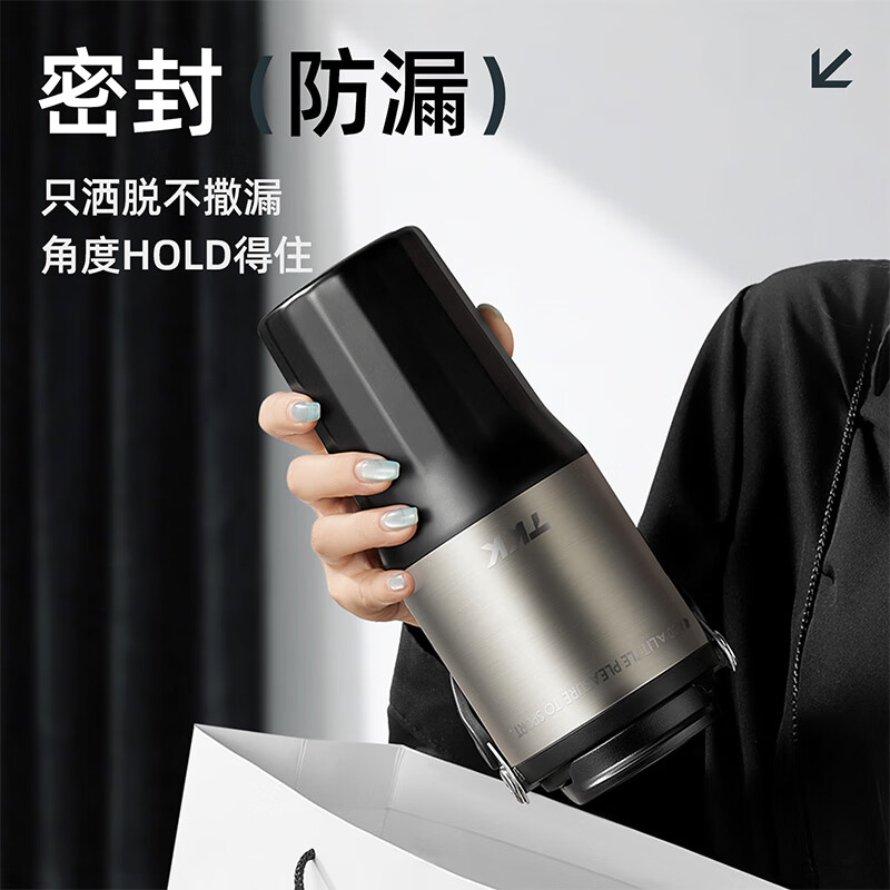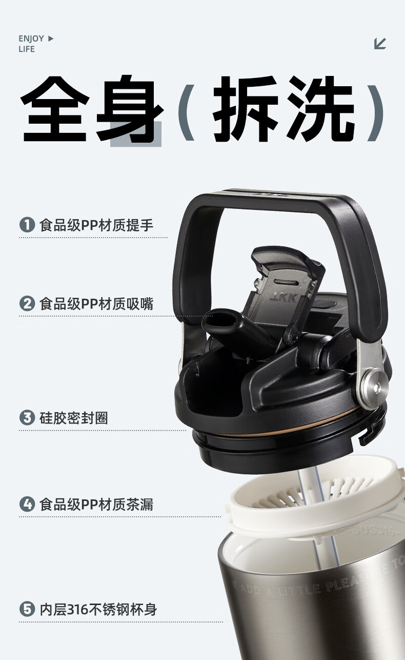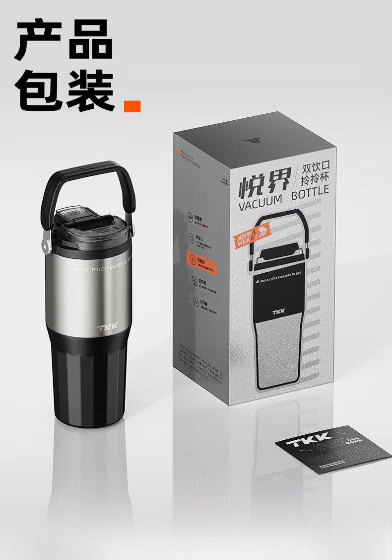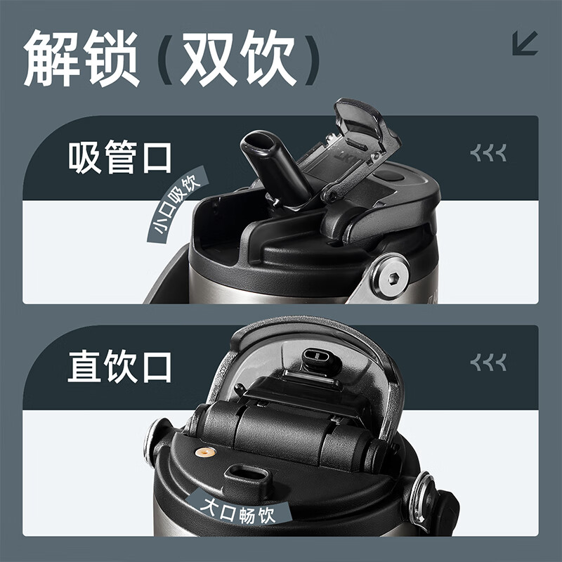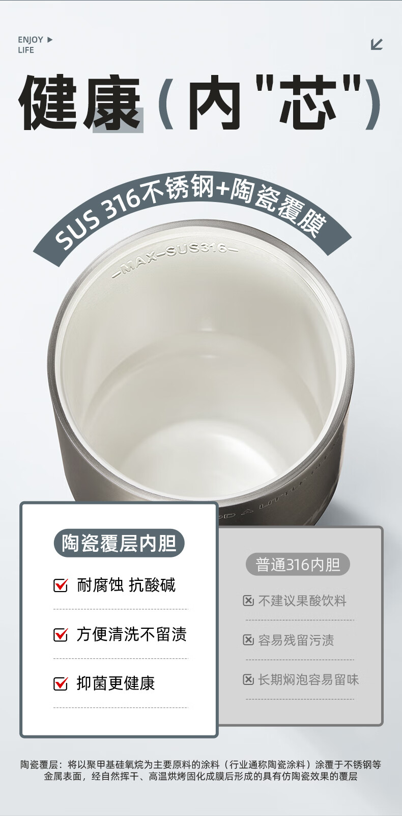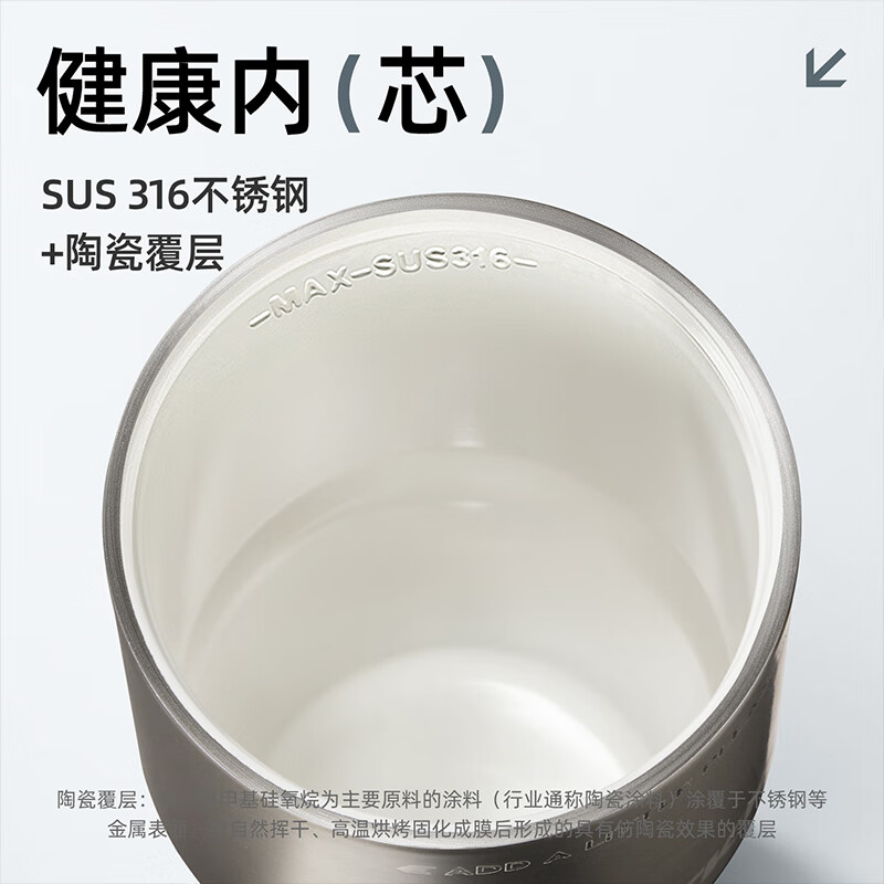 密封(防漏) 双饮口设计 吸管口、直饮口 ;陶瓷覆层:将以聚甲基硅氧烷为主要原料的涂料;自然挥干、高温烘烤固化成膜后形成的具有仿陶瓷效果