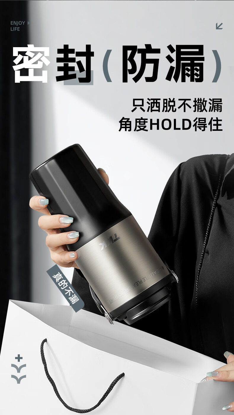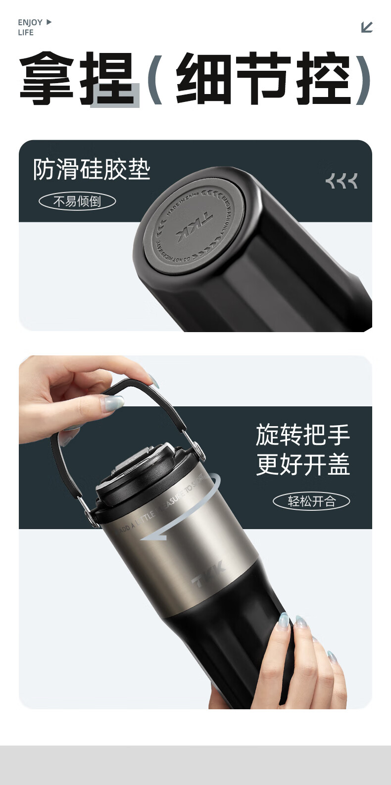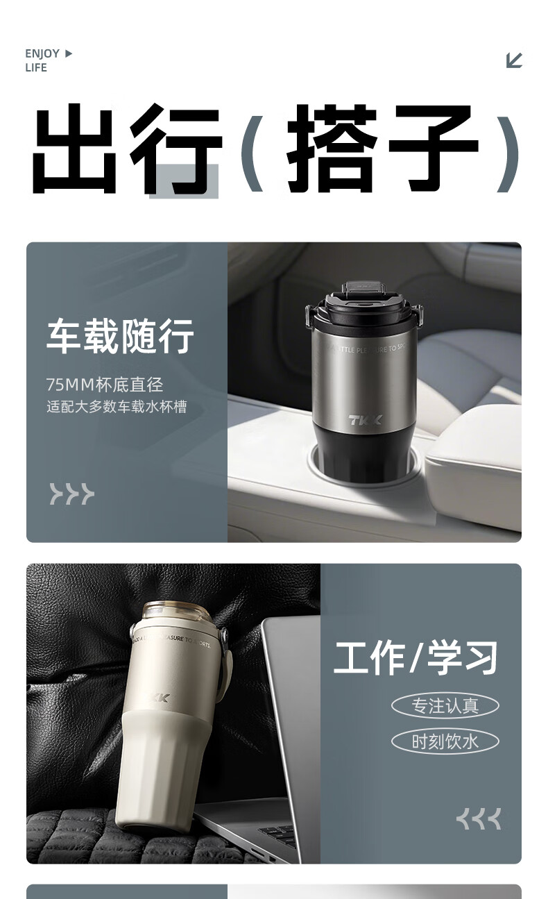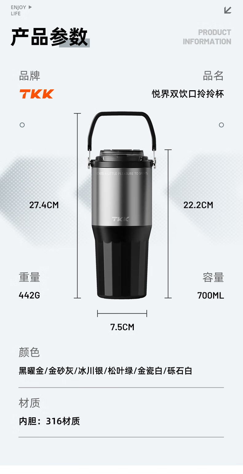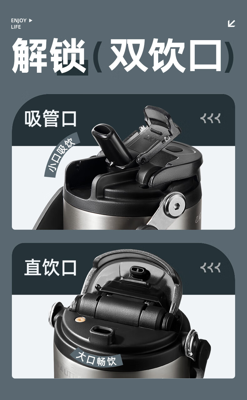 密封(防漏) 双饮口设计 吸管口、直饮口 ;陶瓷覆层:将以聚甲基硅氧烷为主要原料的涂料;自然挥干、高温烘烤固化成膜后形成的具有仿陶瓷效果