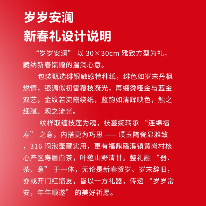 非遗玲珑瓷 + 新会陈皮,文化礼赠显格调;316 闷泡壶 + 双瓷杯,配置实用品质优;红盒喜庆,新年商务送礼适配多场景;陈皮养生,闷泡操作简单体验佳;岁岁安澜寓意美,情感共鸣礼赠贴心